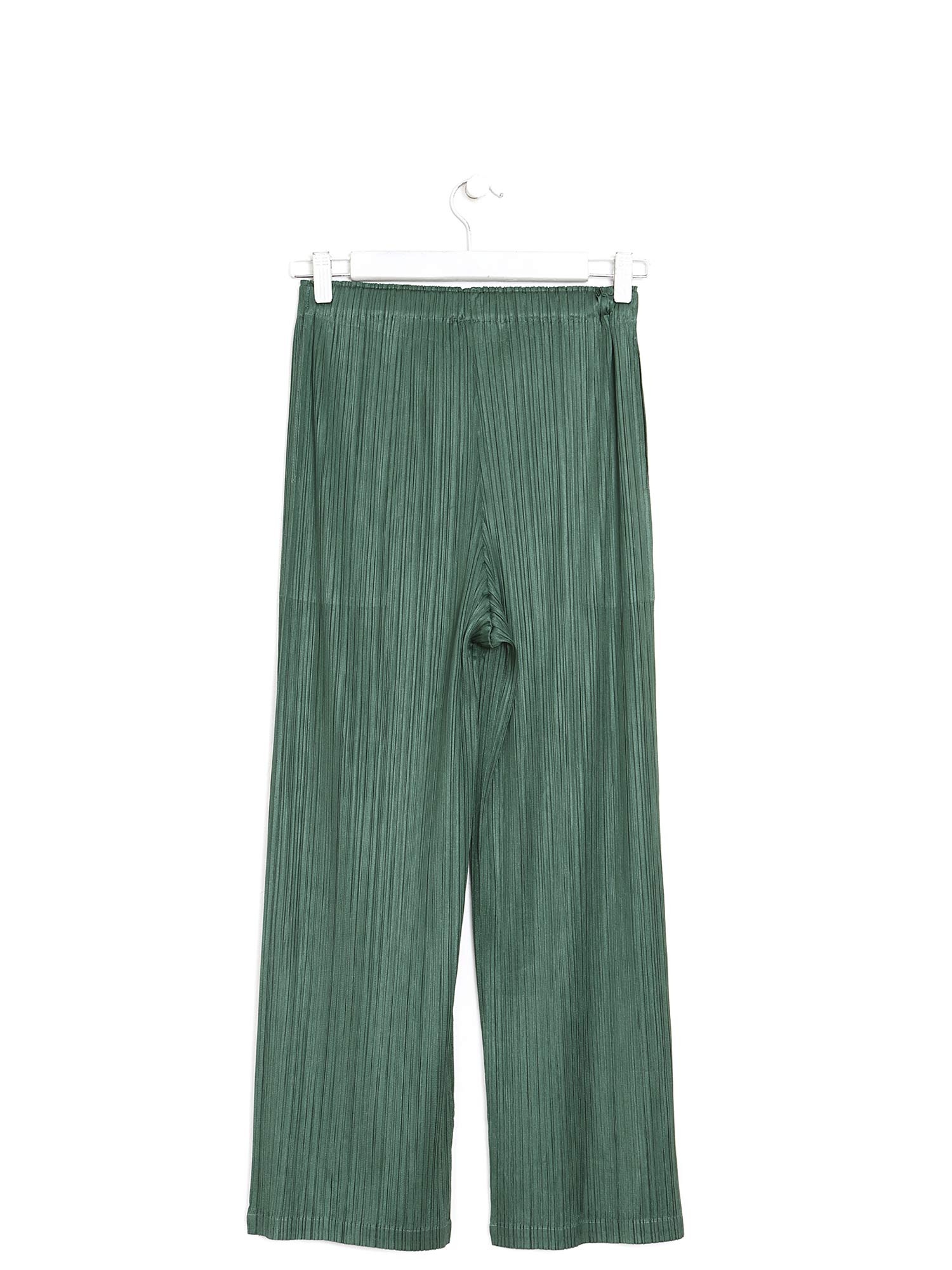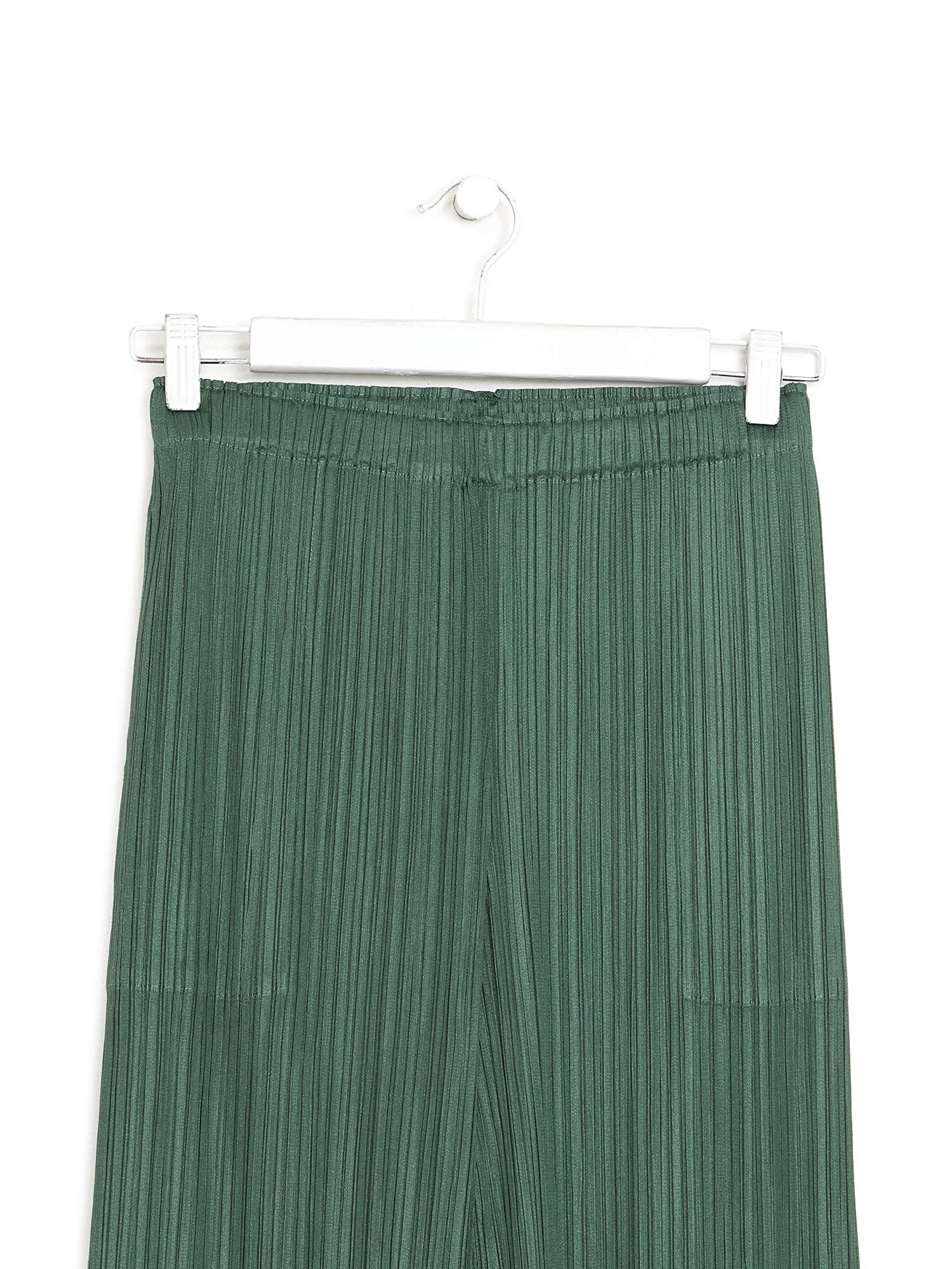 Pantalon plissé vert avec taille élastique. Fabriqué en 100 % polyester.