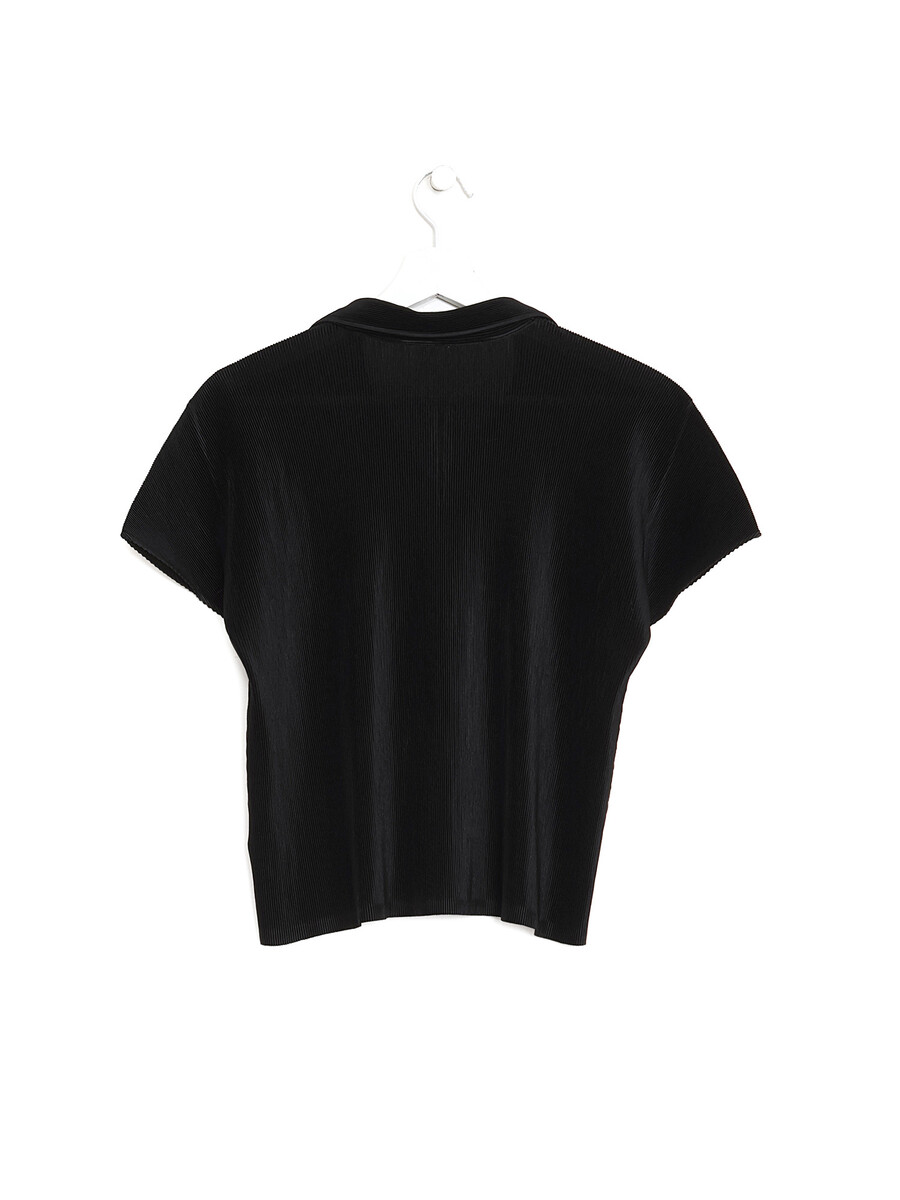 Polo noir à manches courtes avec plissures. Col chemise avec patte de boutonnage. Conception entièrement plissée.