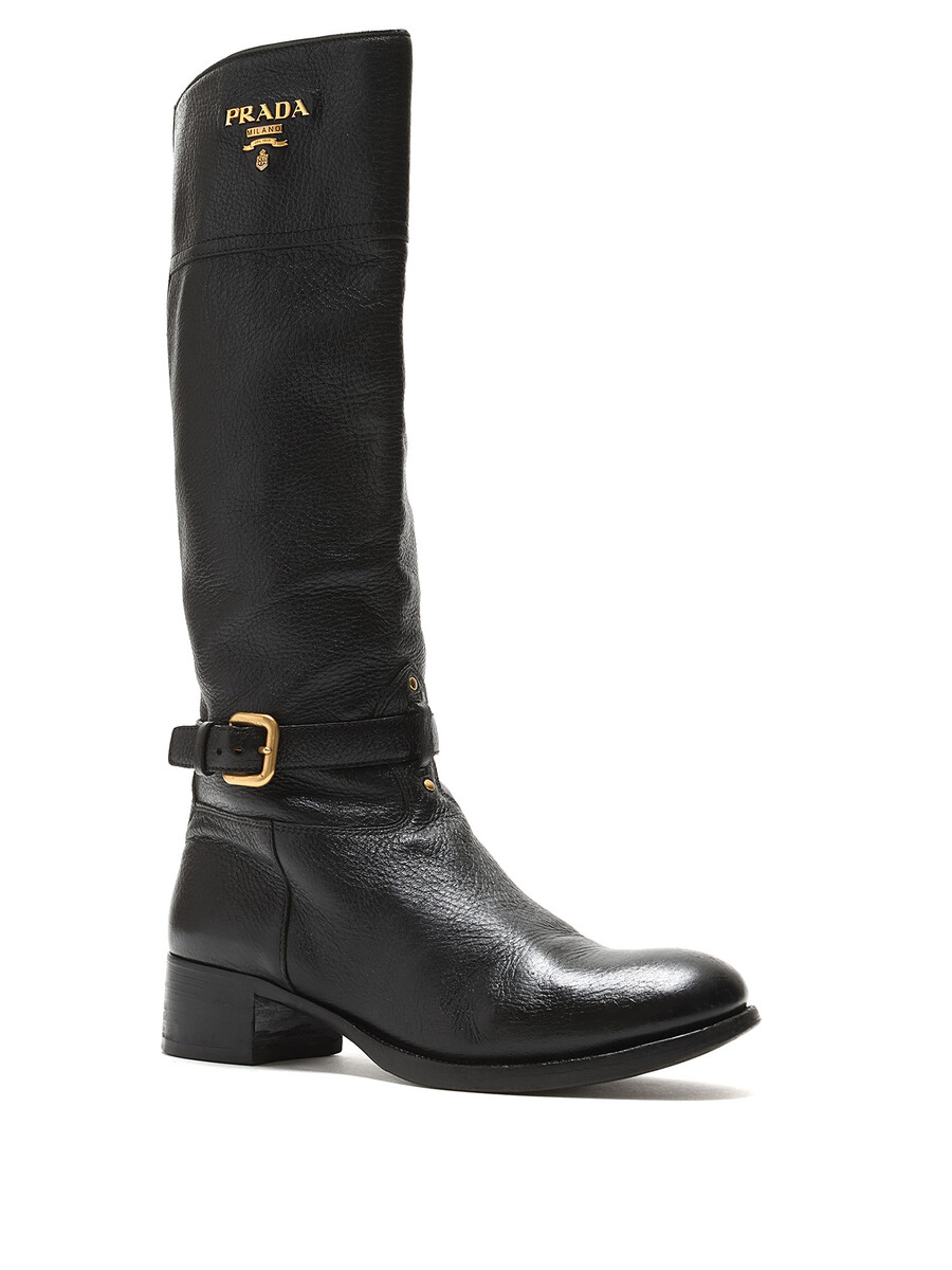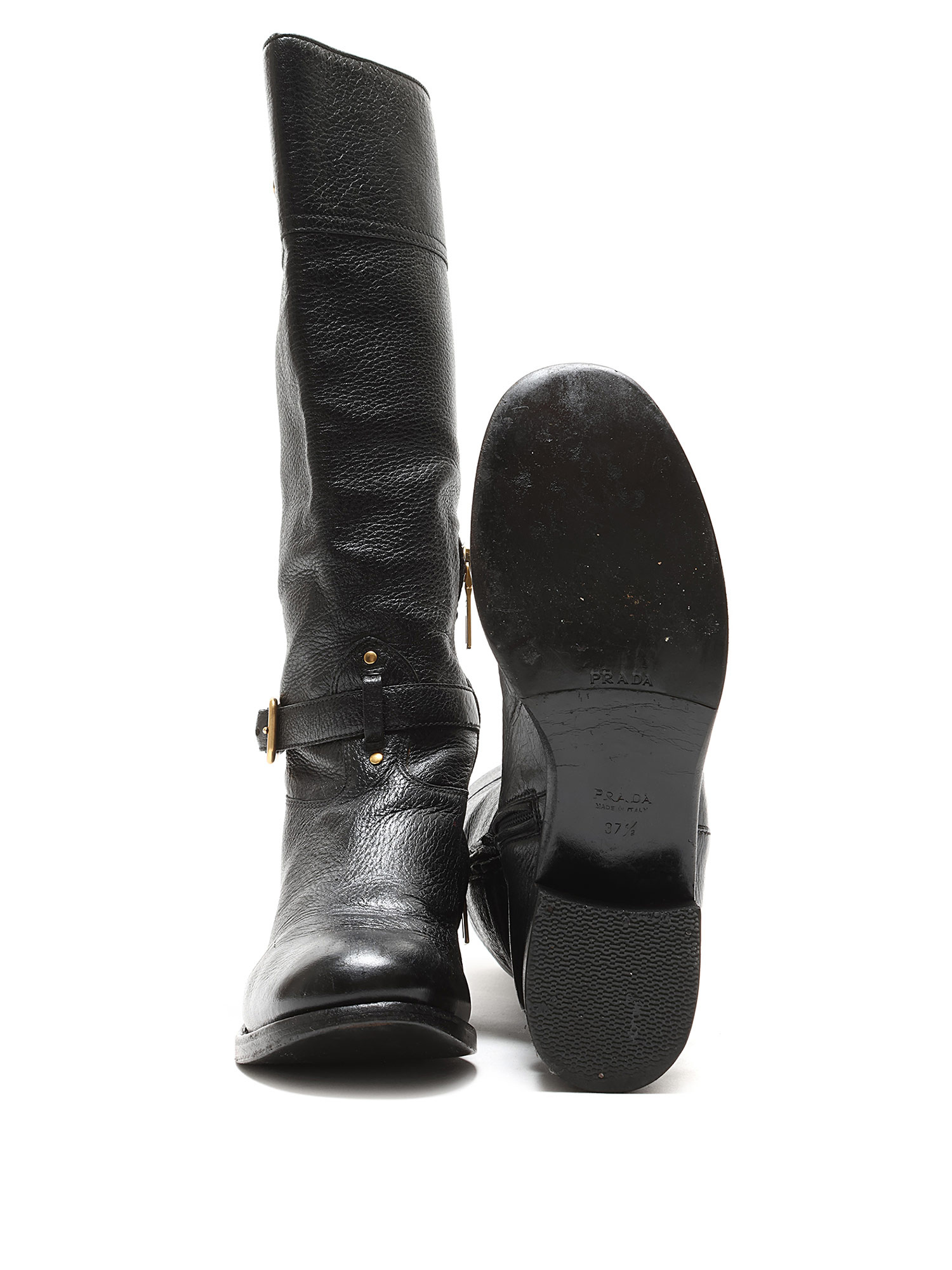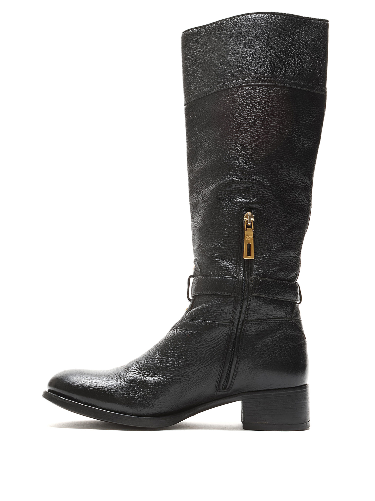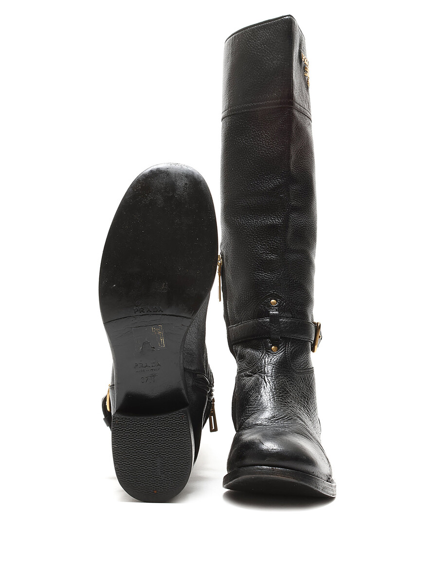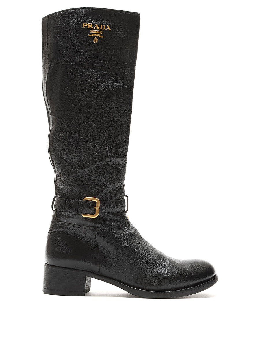 Bottes à la cheville en cuir grainé noir avec fermeture à boucle et bout rond. Semelle en cuir.