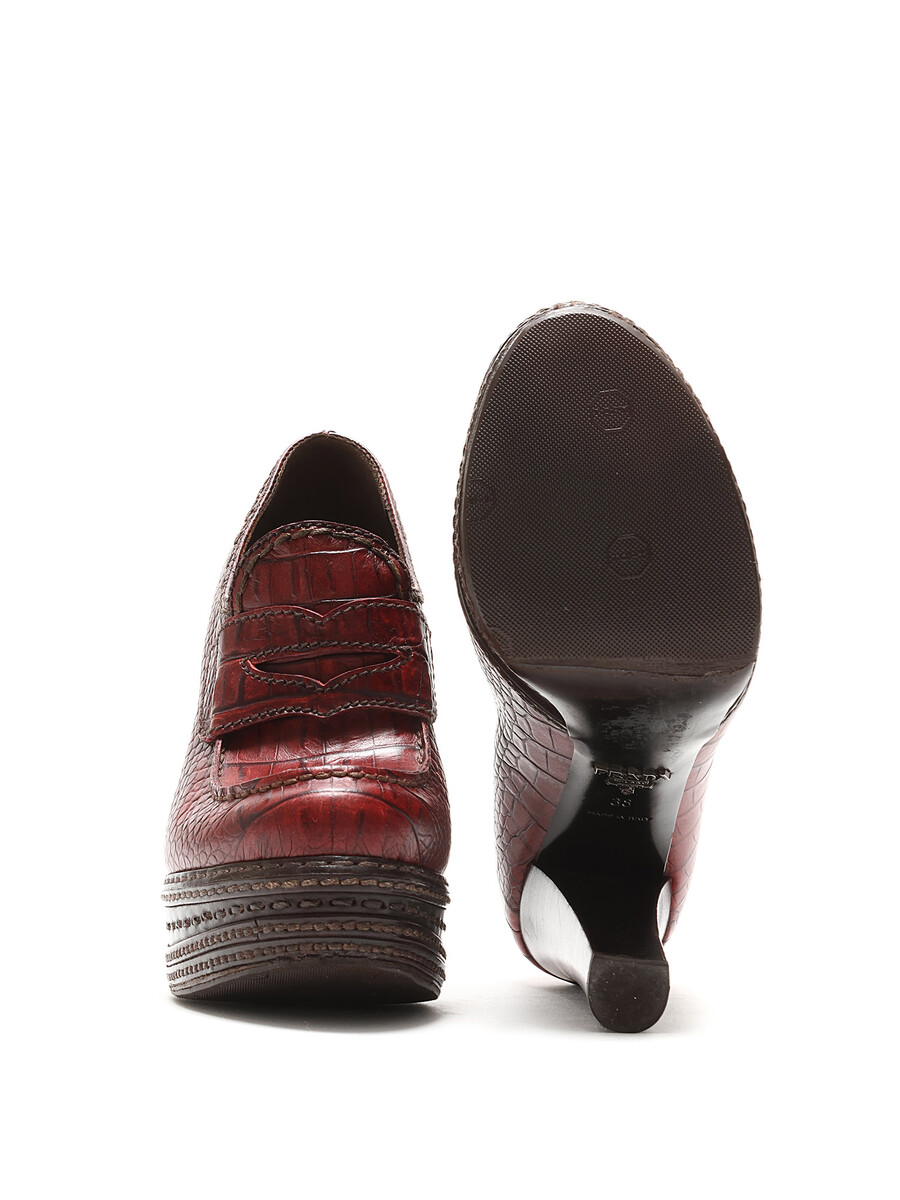 Mocassins à talons en cuir embossé façon crocodile en rouge vif. Bout rond. Semelle en cuir.