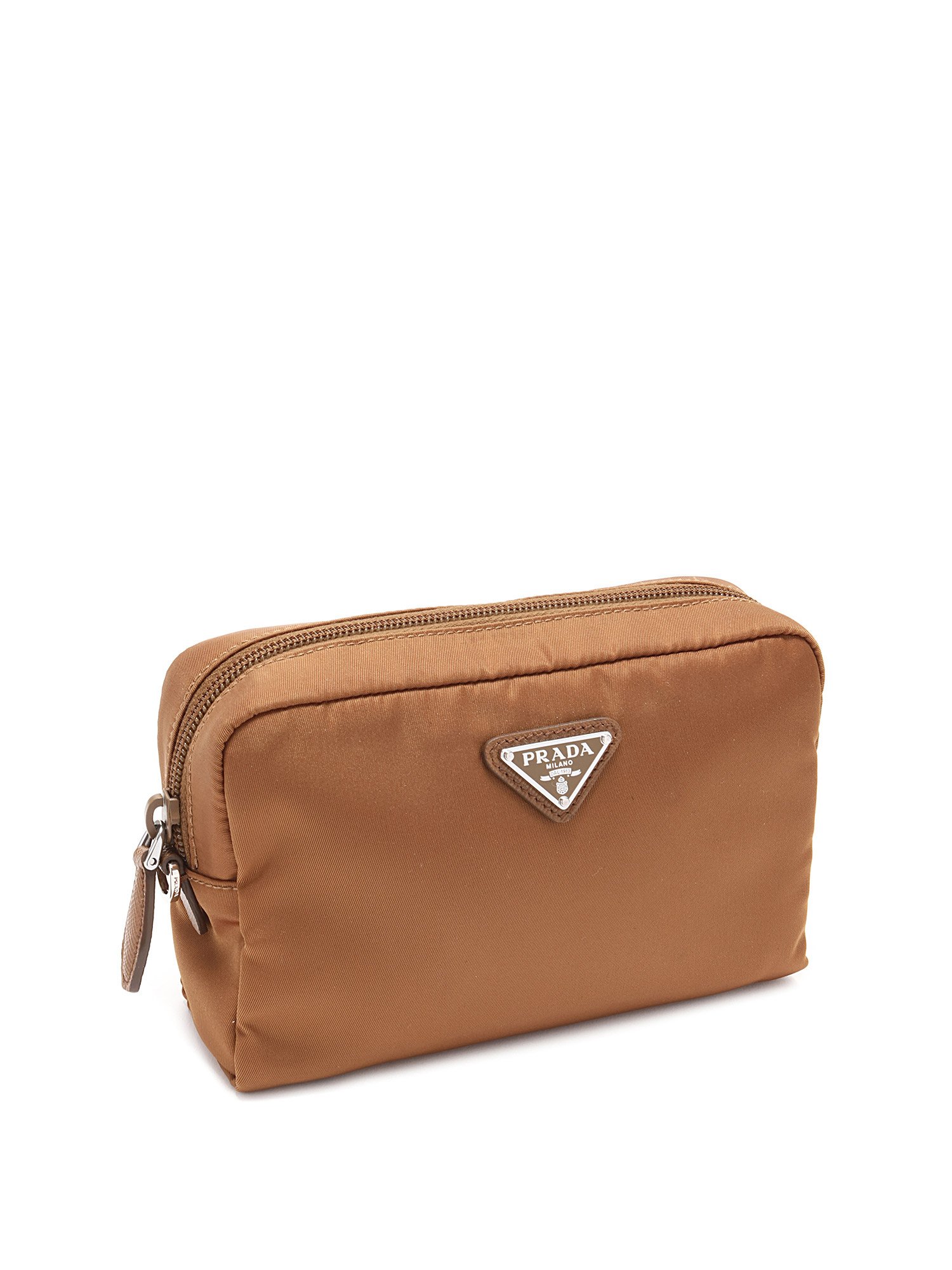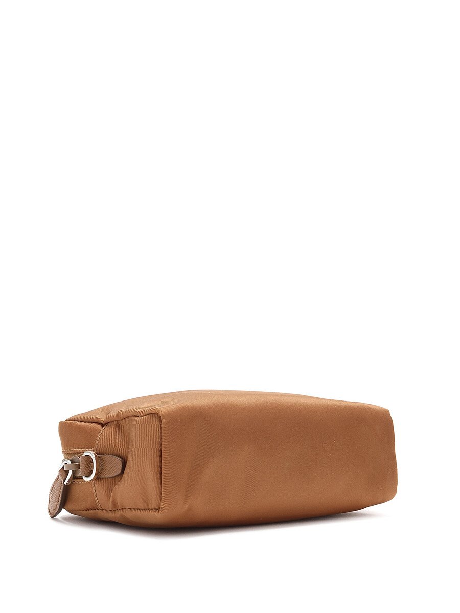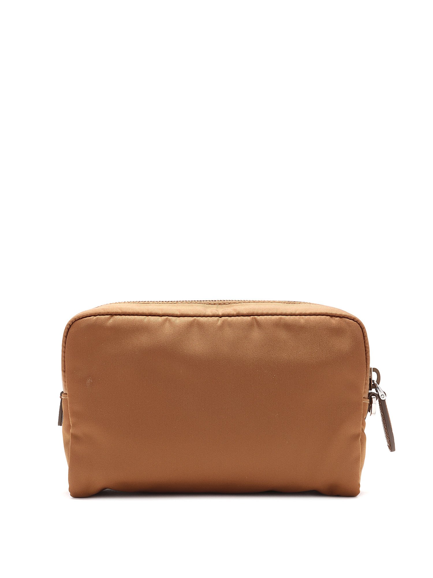 Pochette en nylon marron avec fermeture à glissière. Ferrures argentées. Taille compacte pour les essentiels.