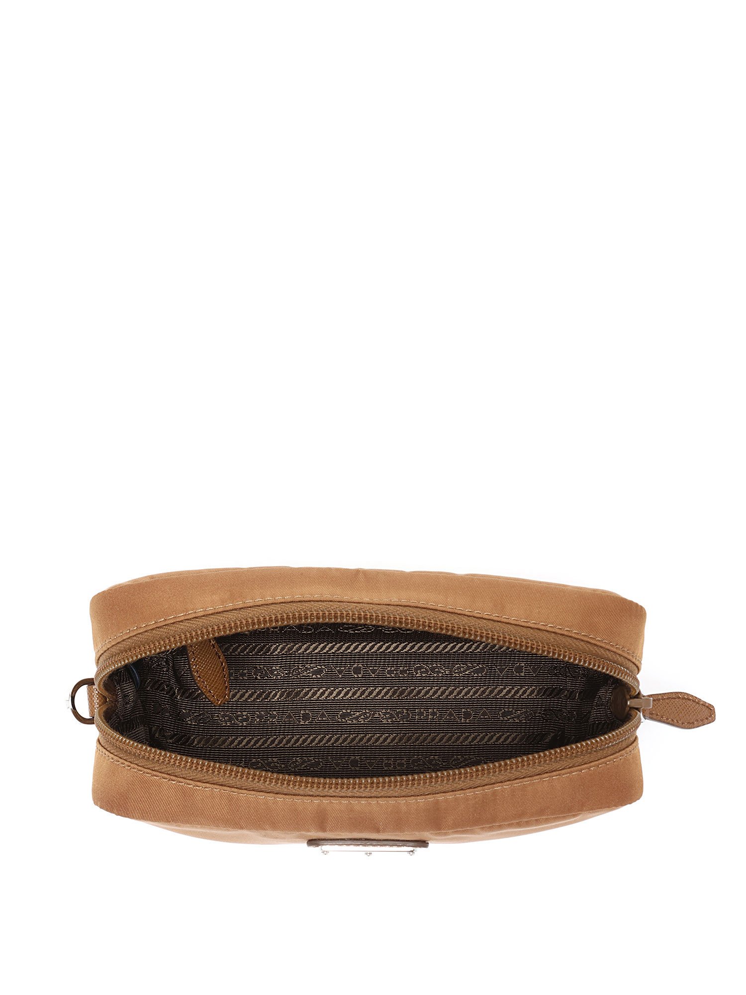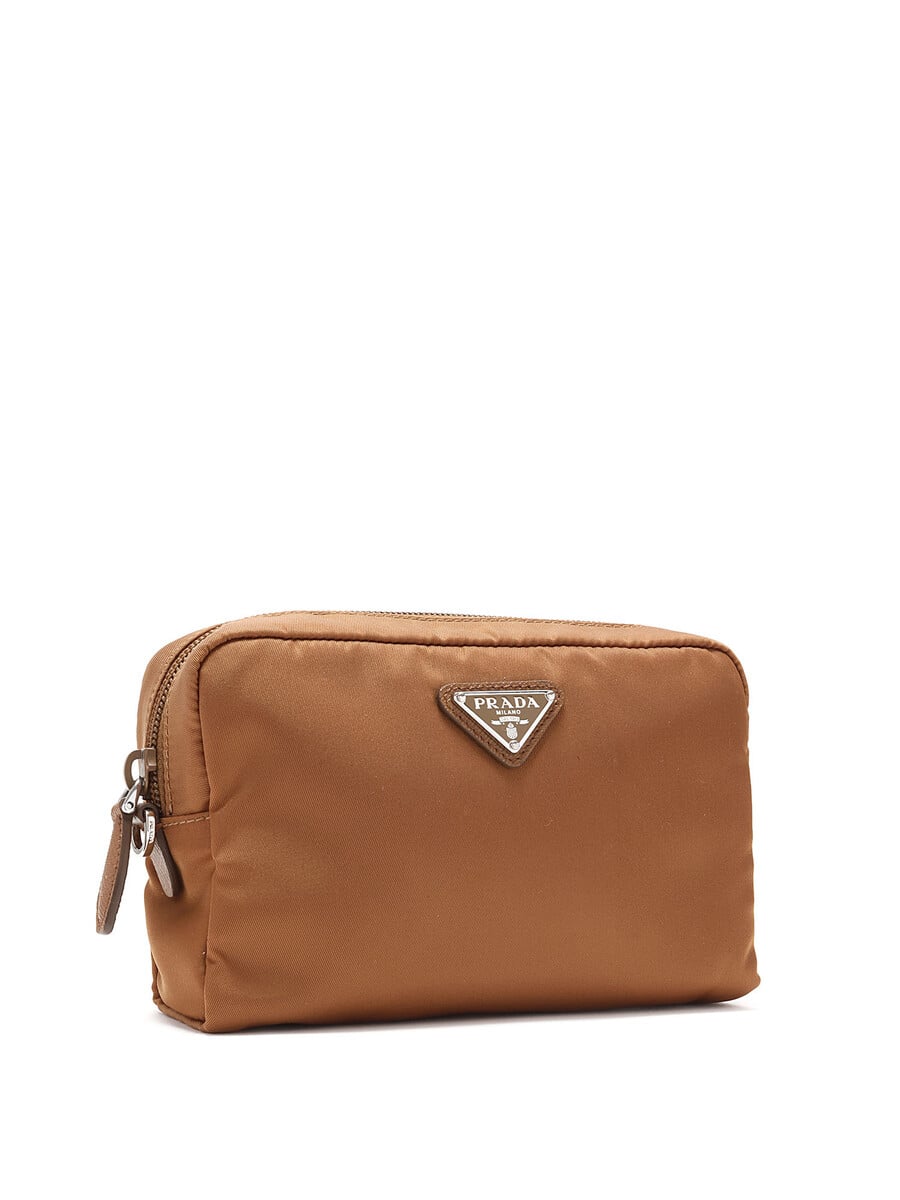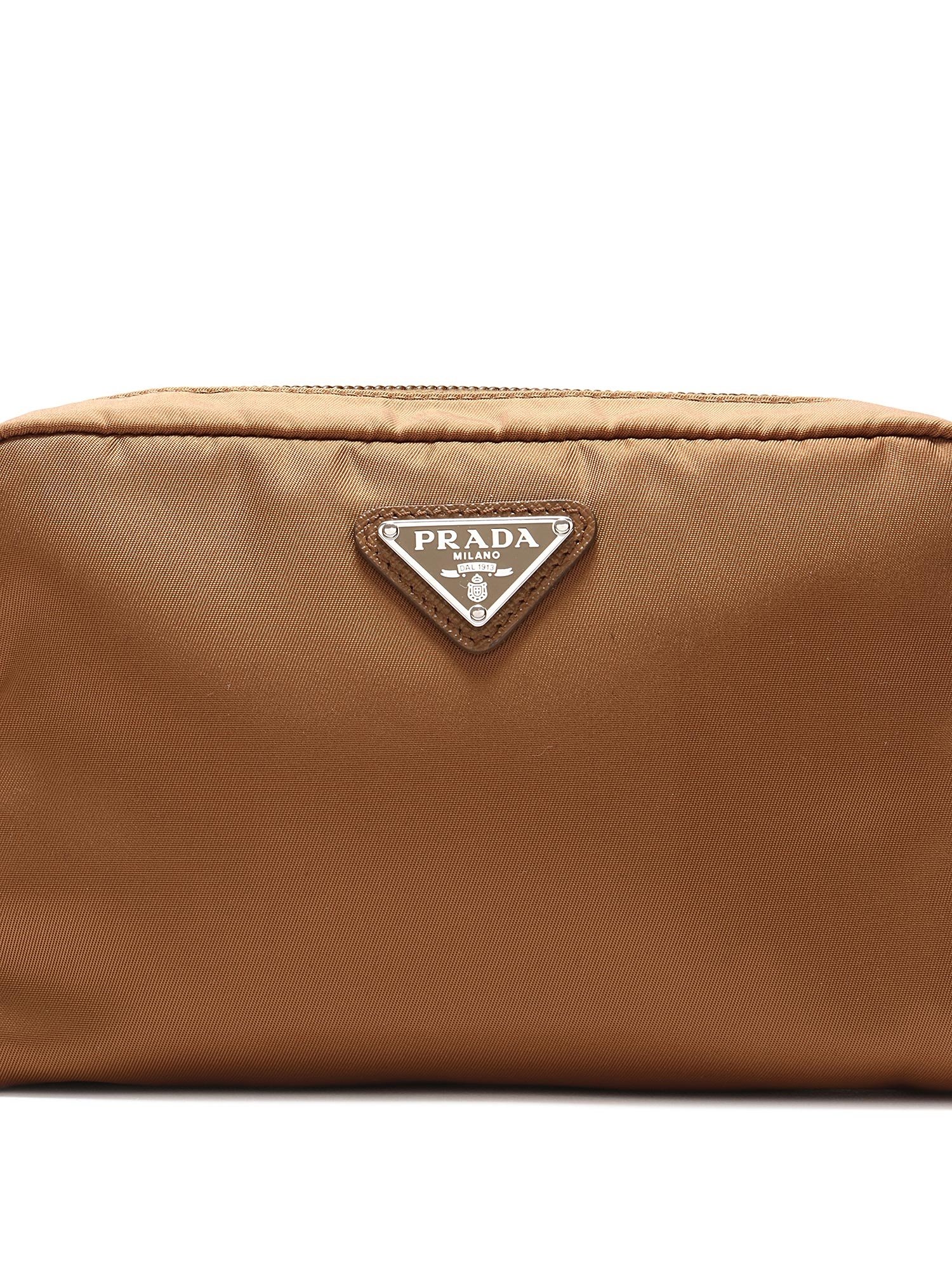 Pochette en nylon marron avec fermeture à glissière. Ferrures argentées. Taille compacte pour les essentiels.