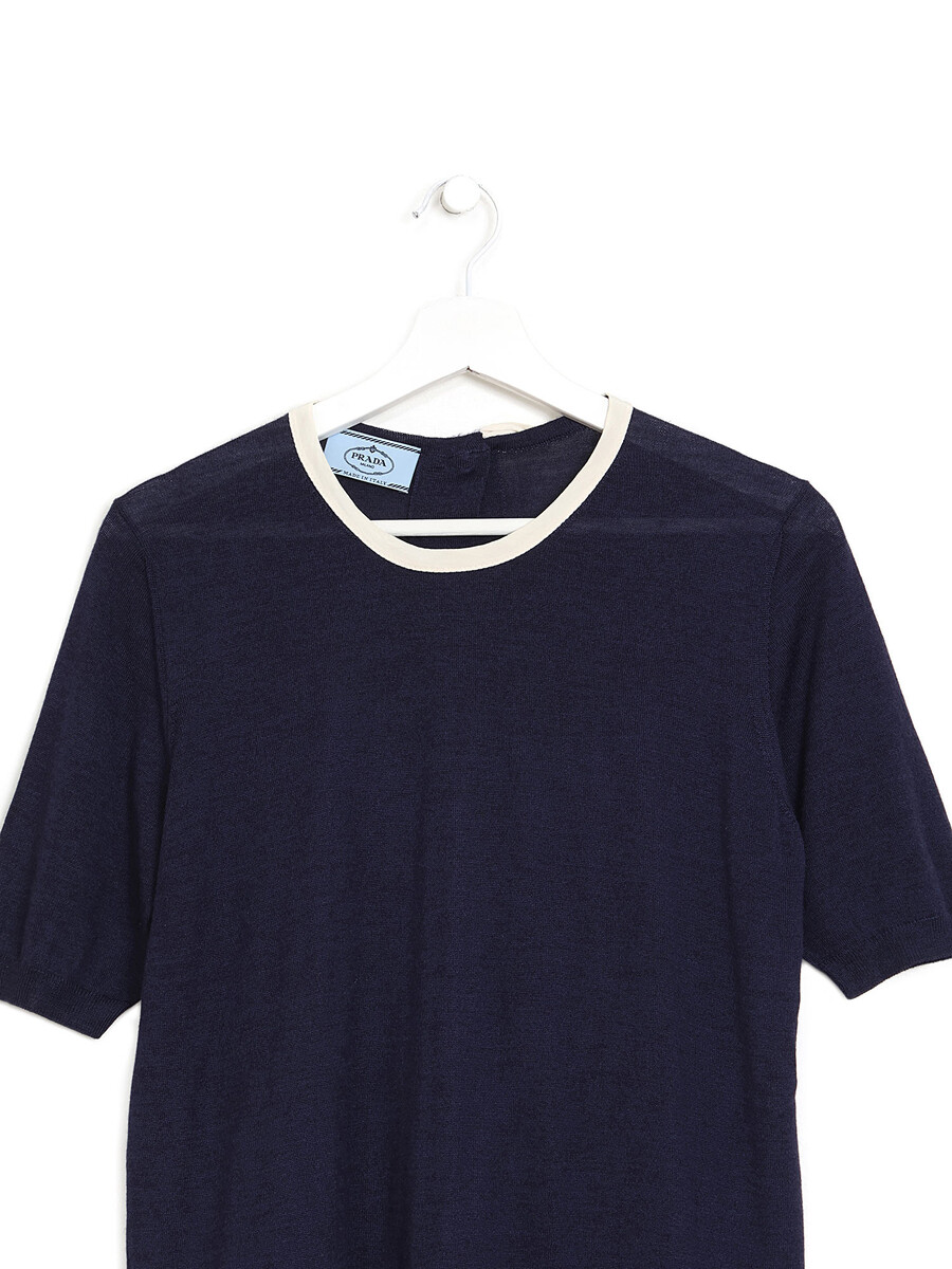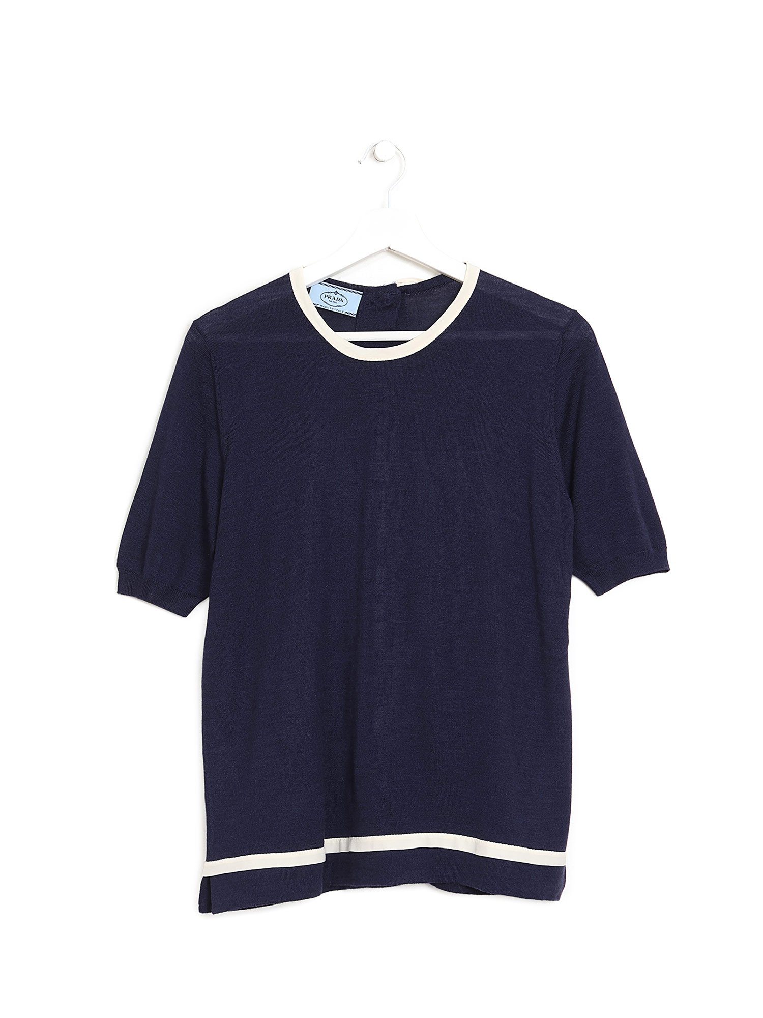 Chandail à manches courtes bleu marine avec une finition blanche à l’ourlet et un nœud dans le dos.