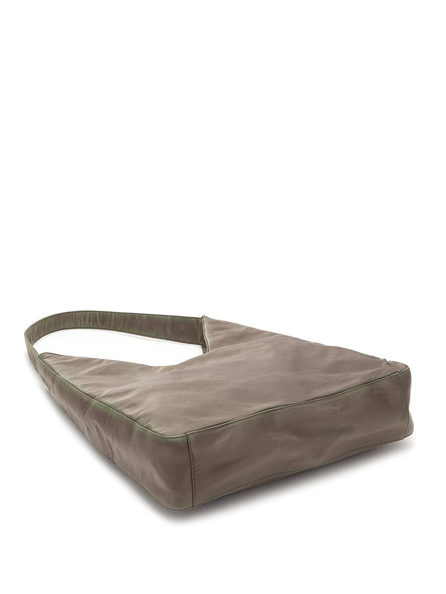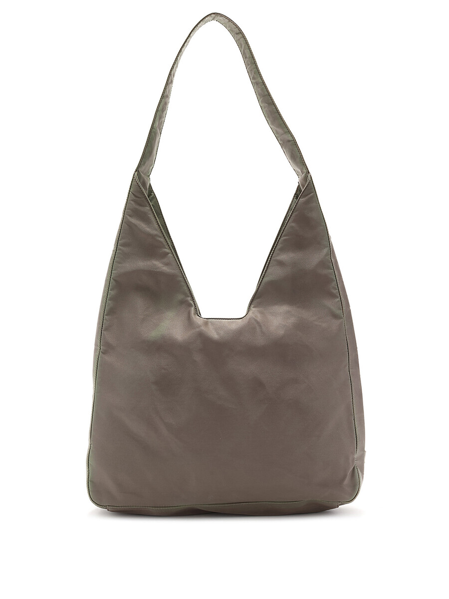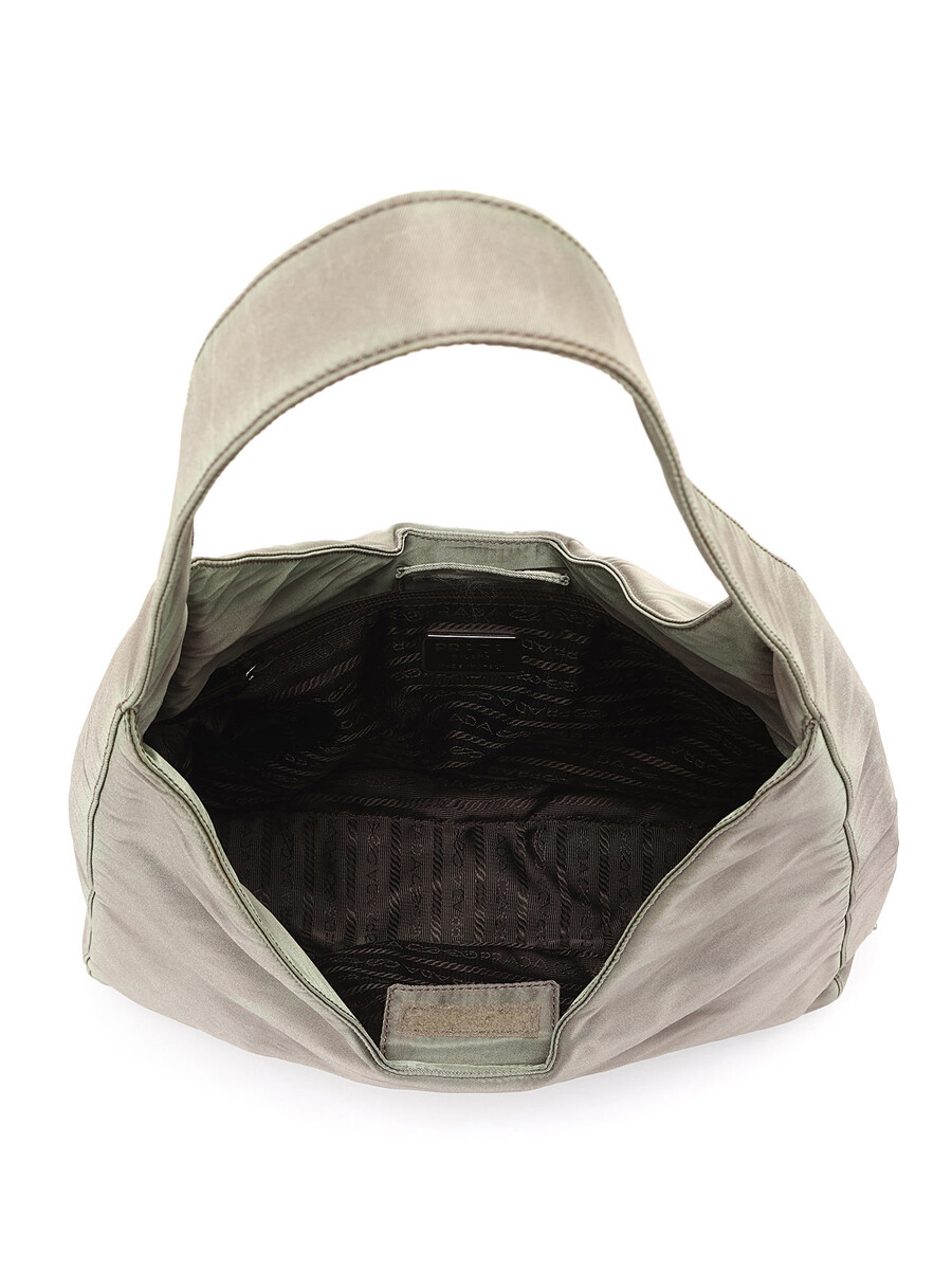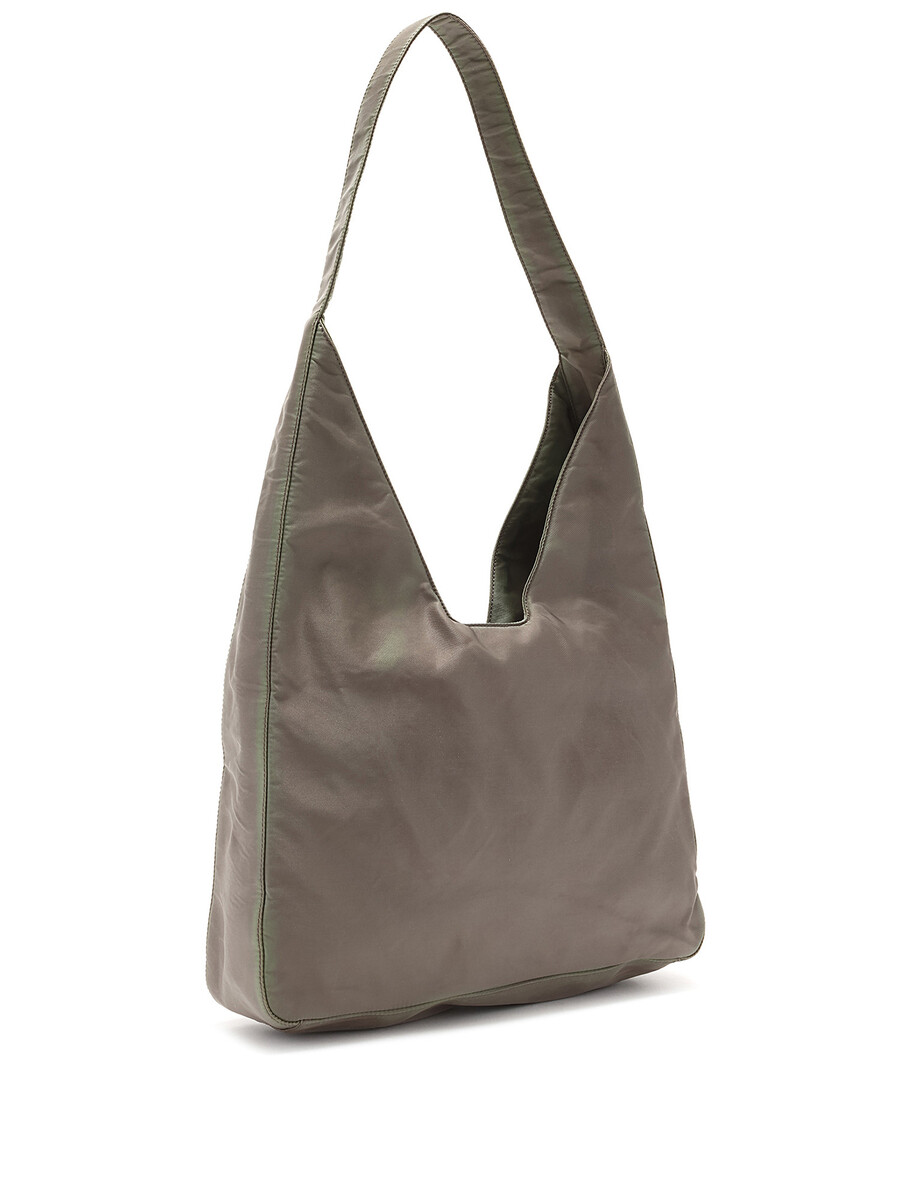 Sac cabas en nylon gris-vert. Fermeture à glissière. Bandoulière non ajustable. Quincaillerie argentée.