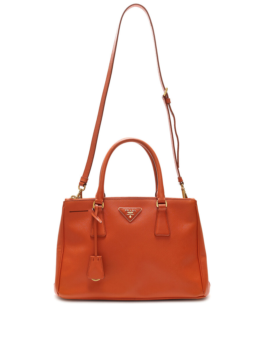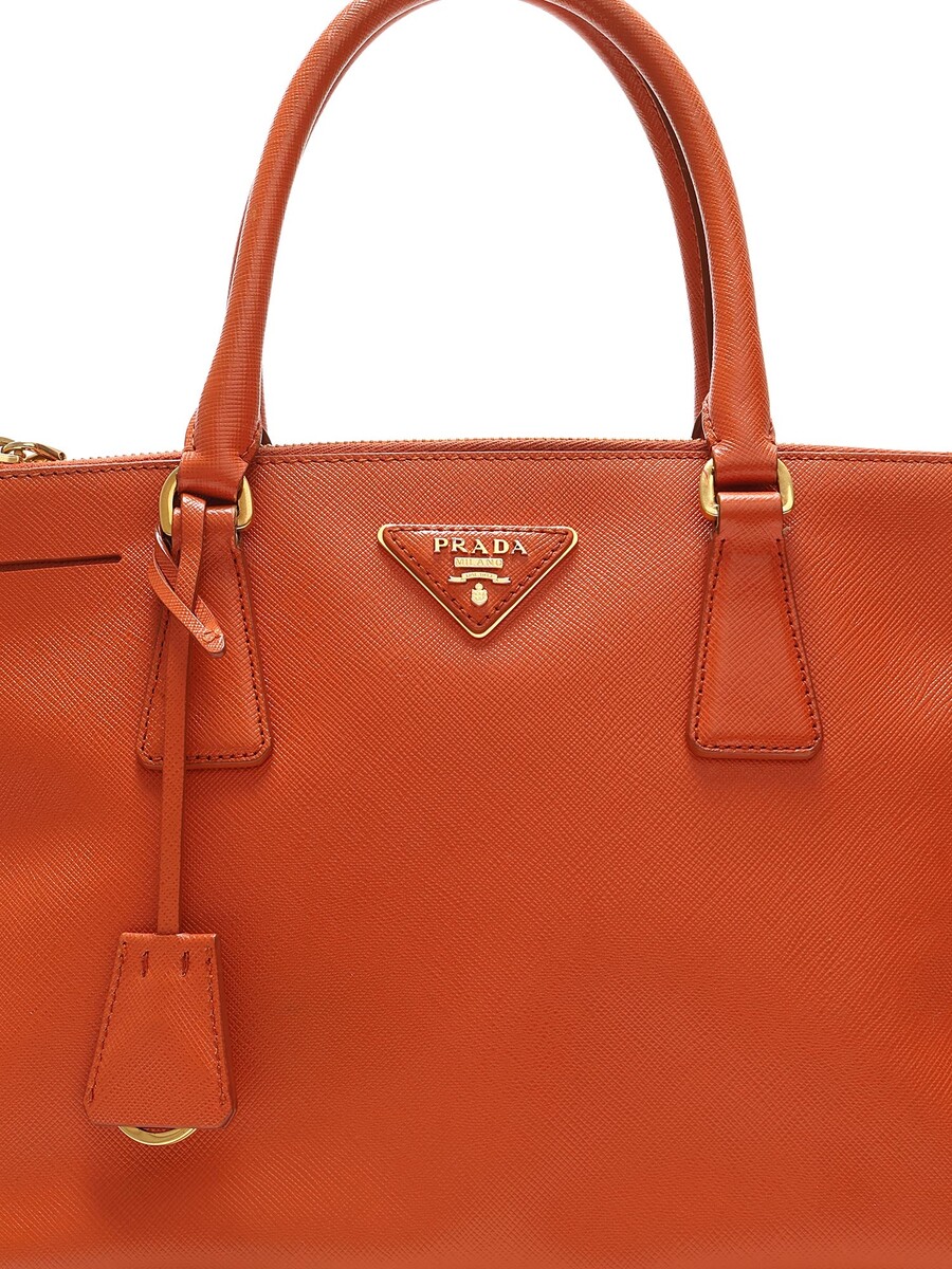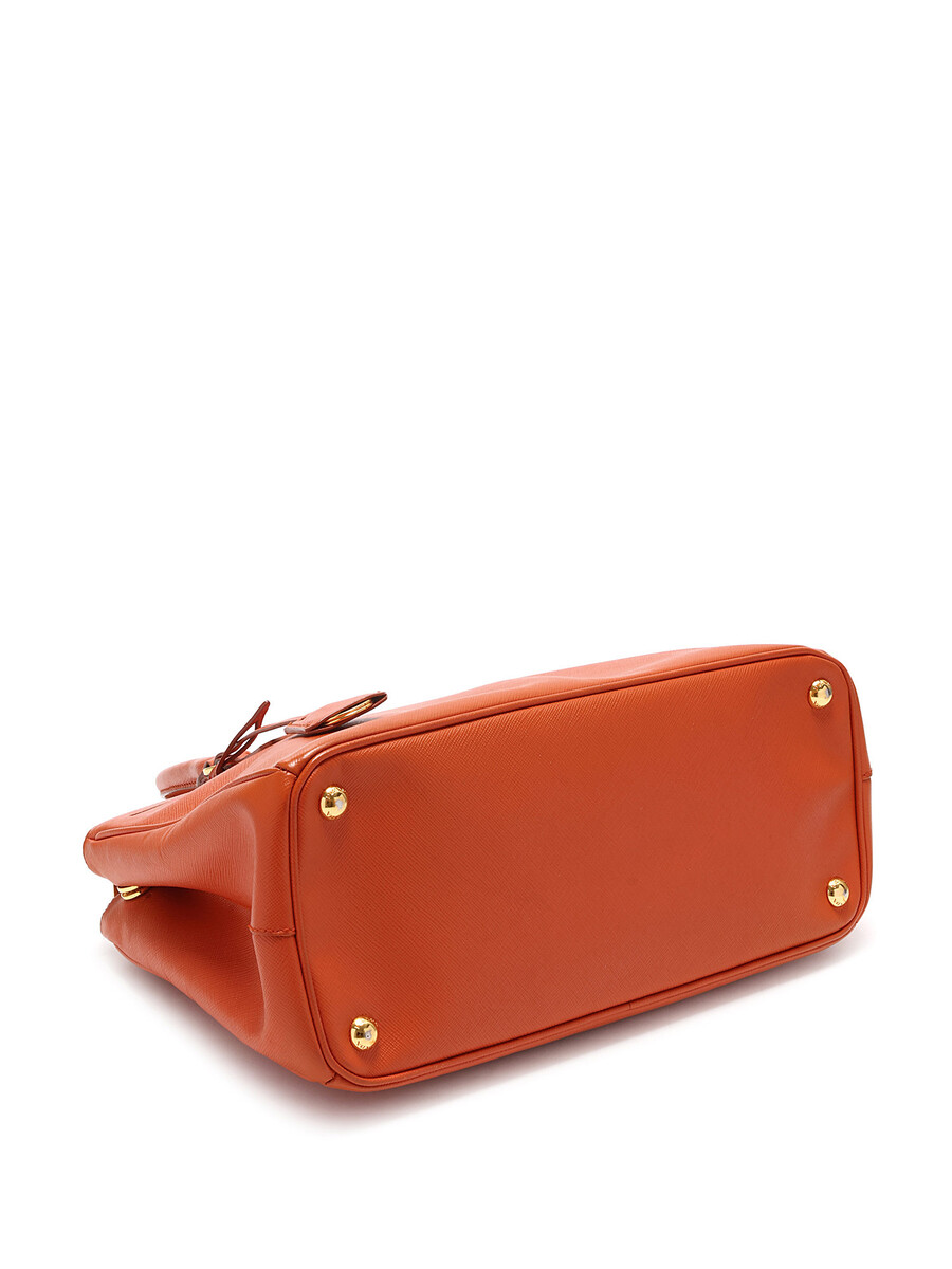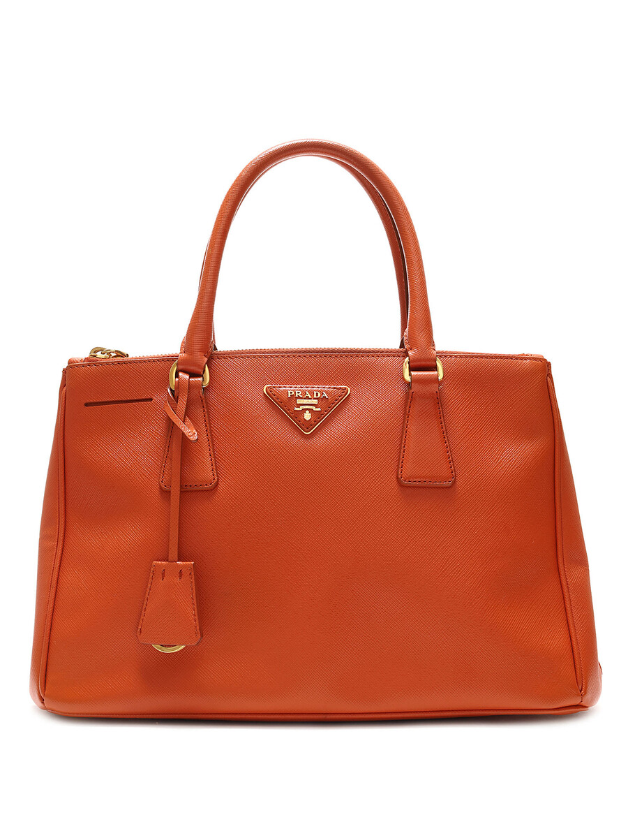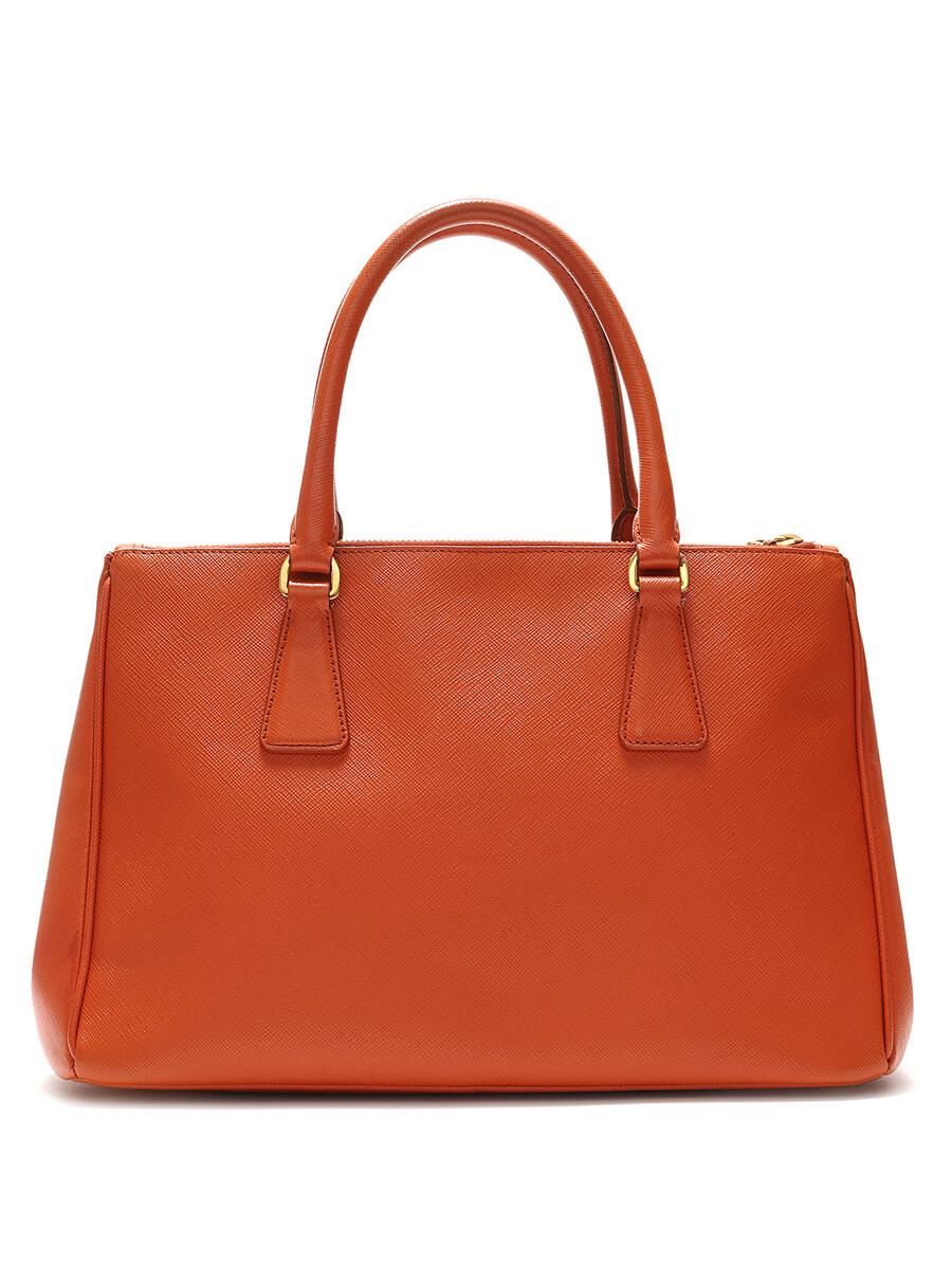 Sac fourre-tout en cuir saffiano couleur mandarine avec grain texturé. Quincaillerie dorée. Livré avec une carte d'authenticité.