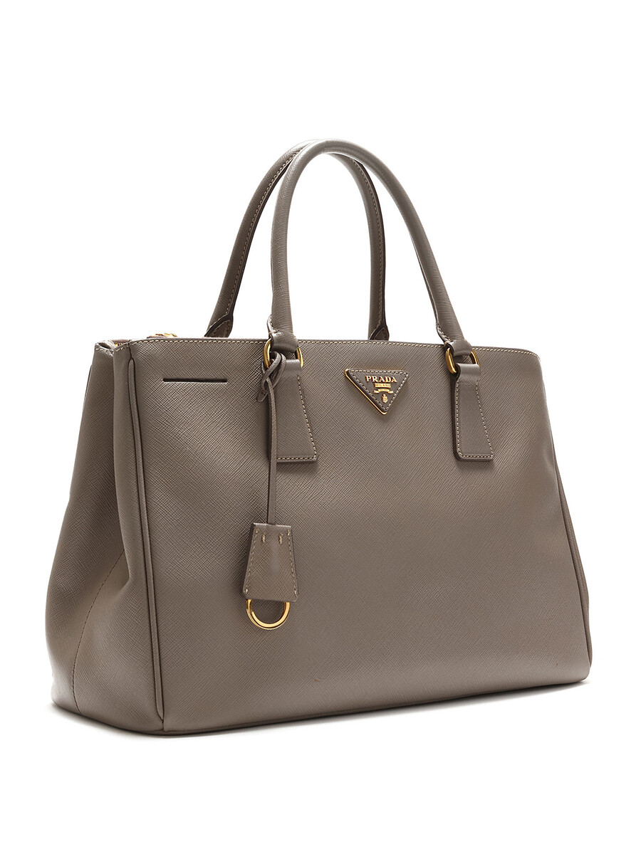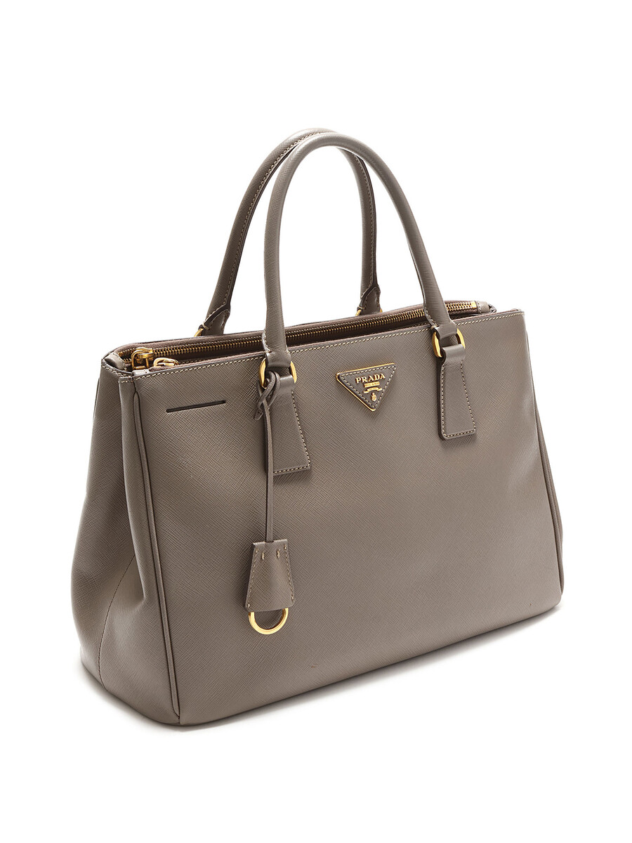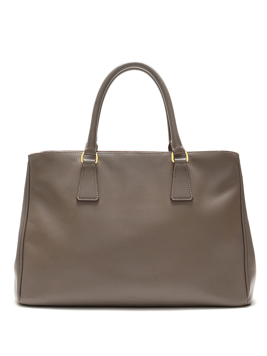 Sac cabas de taille moyenne en cuir saffiano gris. Ferrures de ton doré. Fermeture magnétique et à glissière. Doubles poignées roulées avec bandoulière amovible. Trois compartiments principaux pour un rangement organisé.