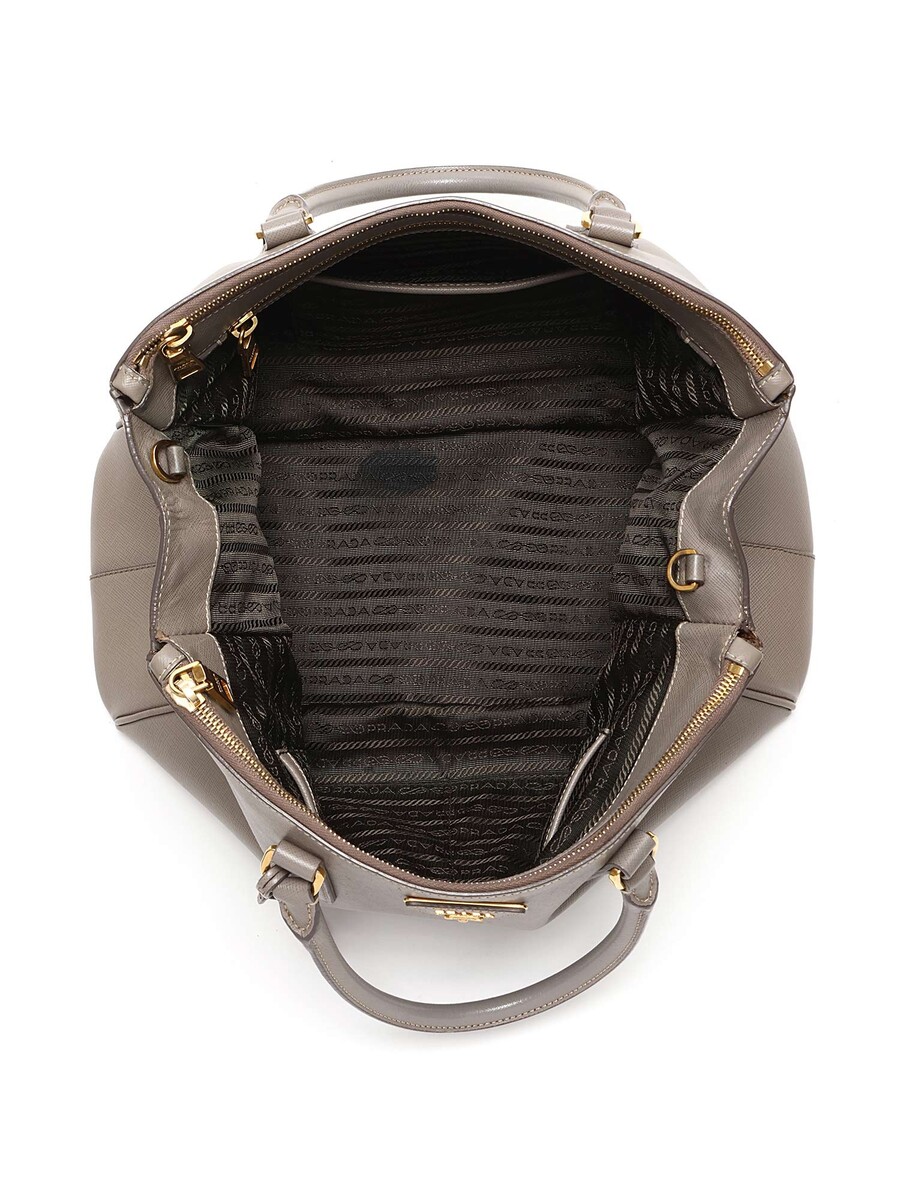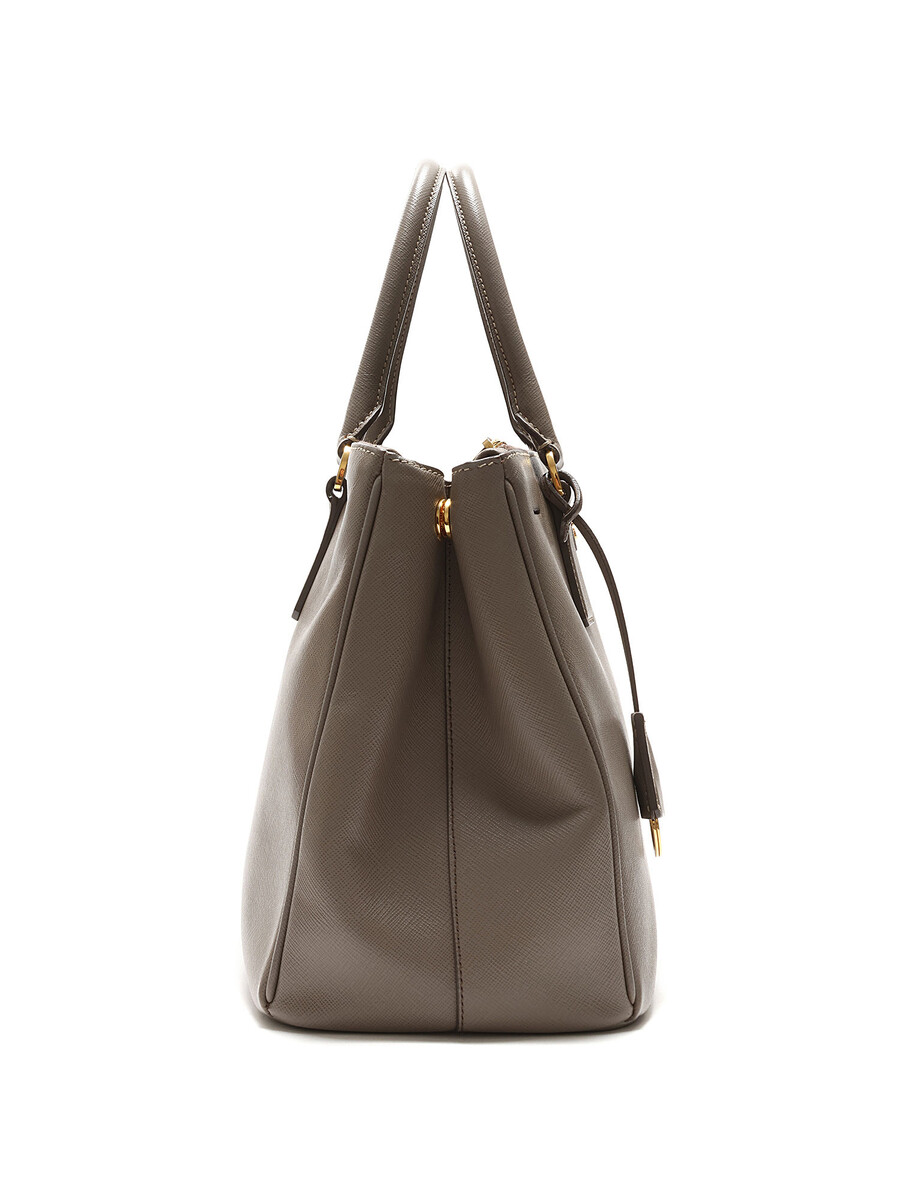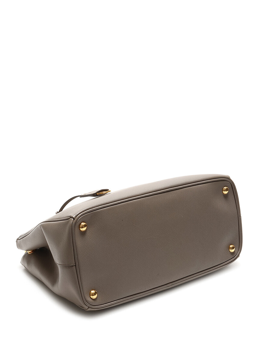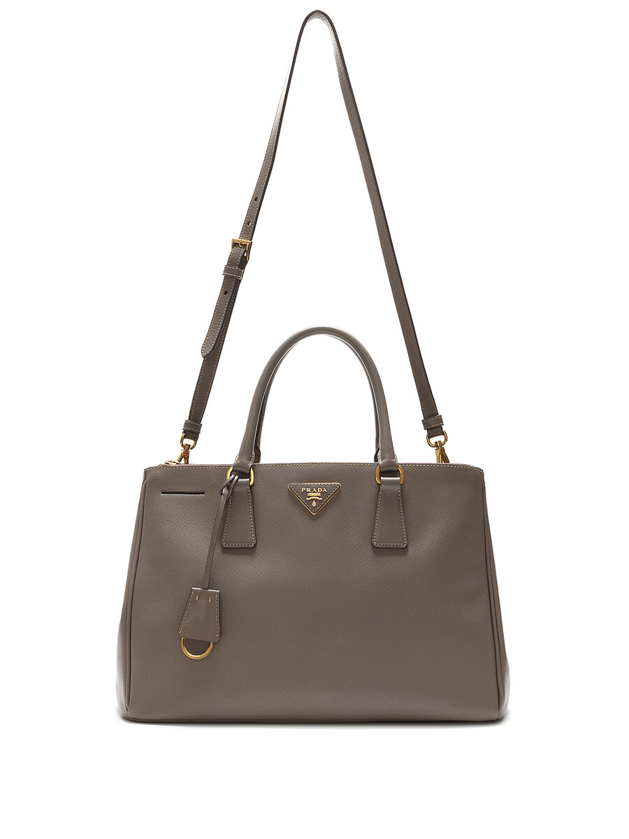 Sac cabas de taille moyenne en cuir saffiano gris. Ferrures de ton doré. Fermeture magnétique et à glissière. Doubles poignées roulées avec bandoulière amovible. Trois compartiments principaux pour un rangement organisé.