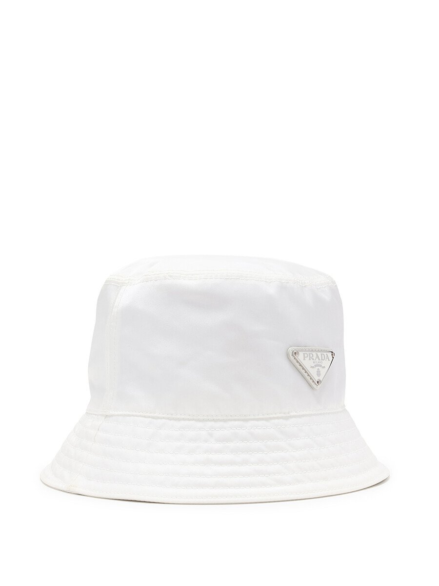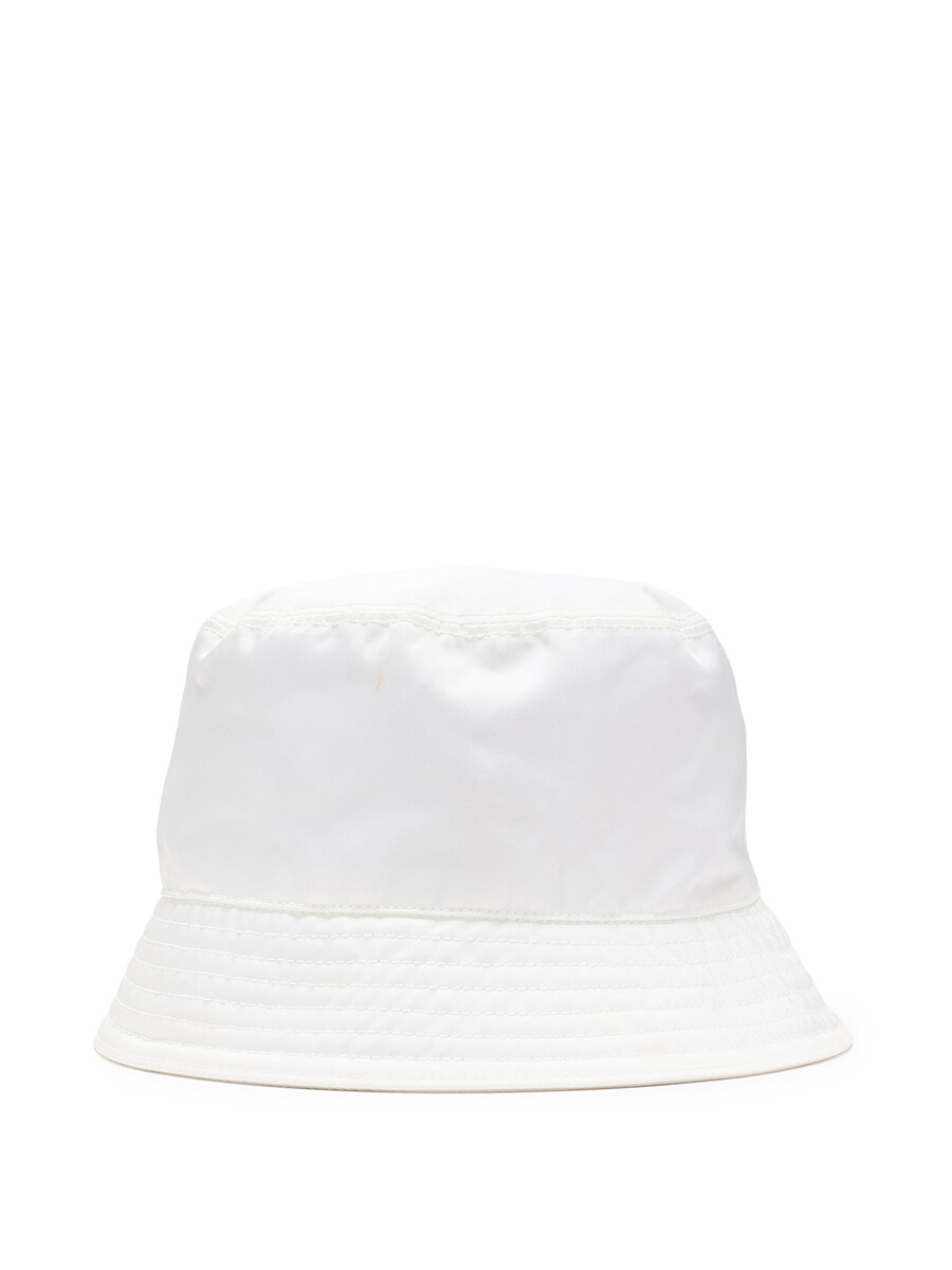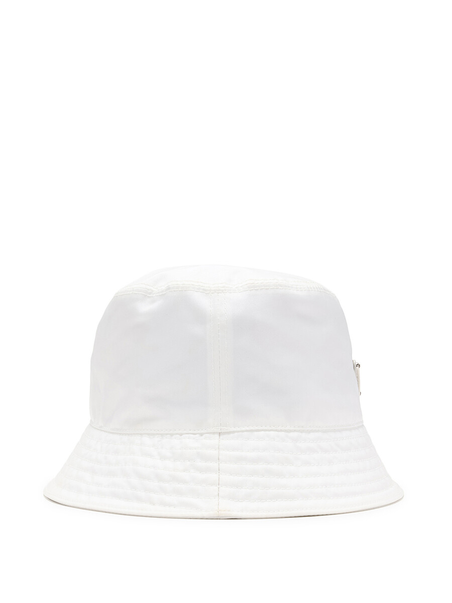 Chapeau seau en tissu Re-Nylon noir. Plaque logo Prada avec quincaillerie argentée et blanche. Coutures ton sur ton.