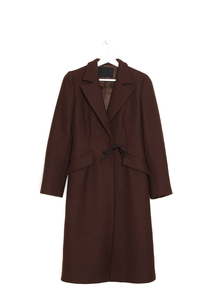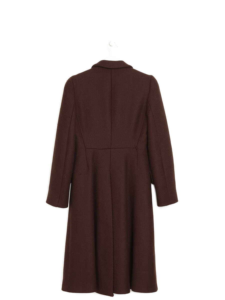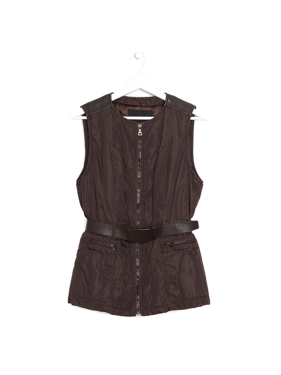Ensemble deux pièces comprenant un manteau en laine marron à manches longues avec col cranté, fermeture à boutons, poches à rabat et ceinture à la taille. Accompagné d'un gilet sans manches en nylon marron avec ceinture de marque et garnitures en cuir.