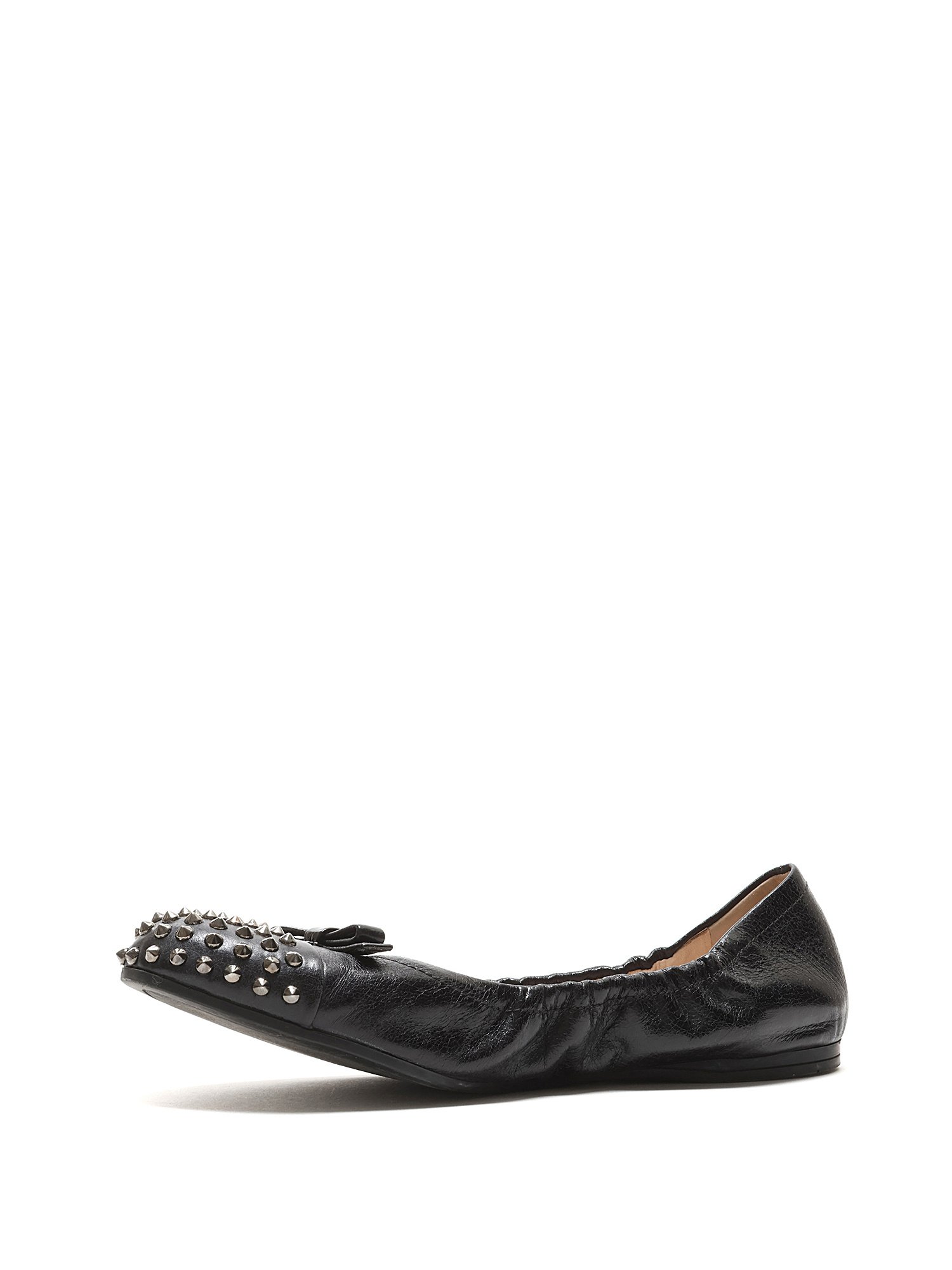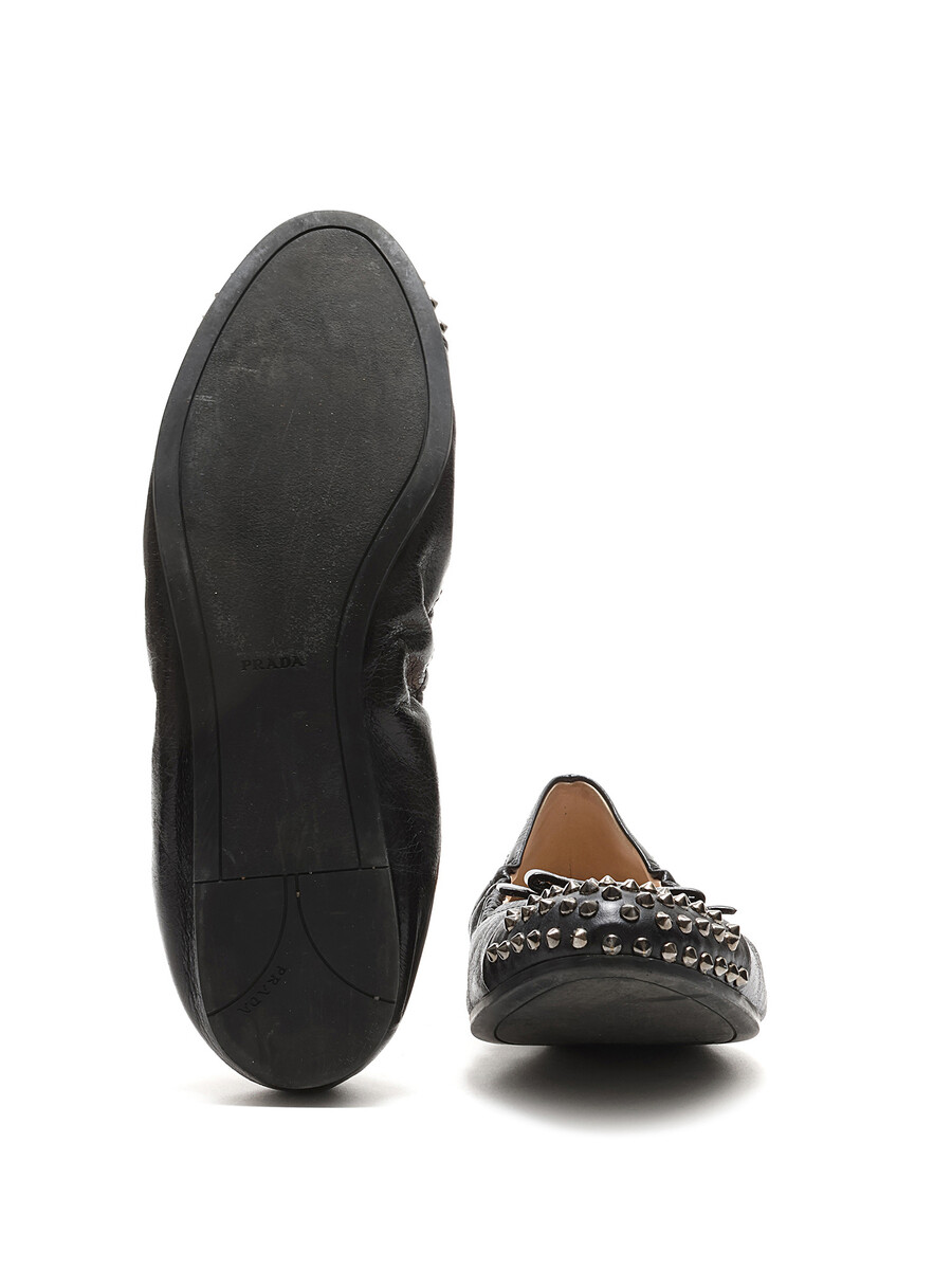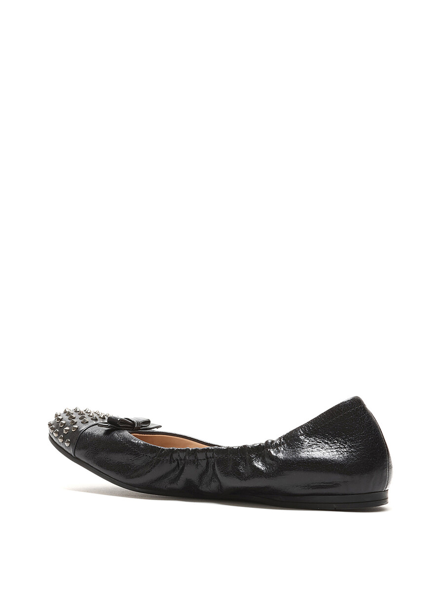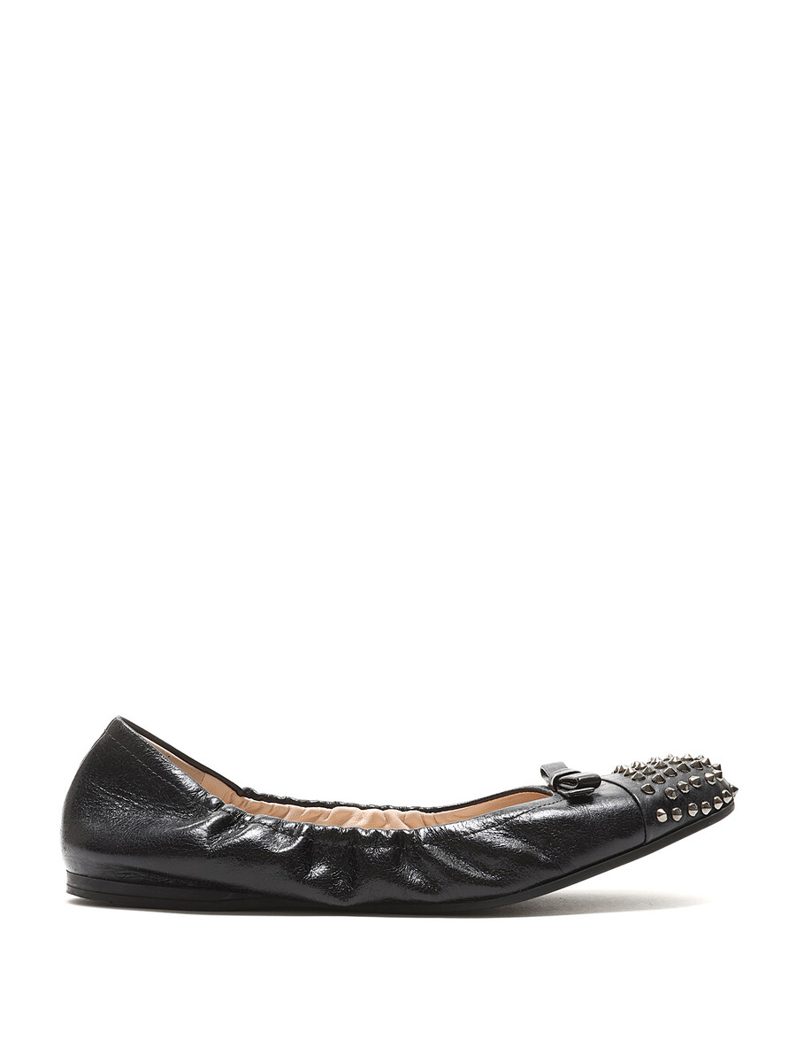 Ballerines en cuir grainé noires avec des clous métalliques décoratifs à l'avant. Style à enfiler avec un bout arrondi et semelle en caoutchouc durable.