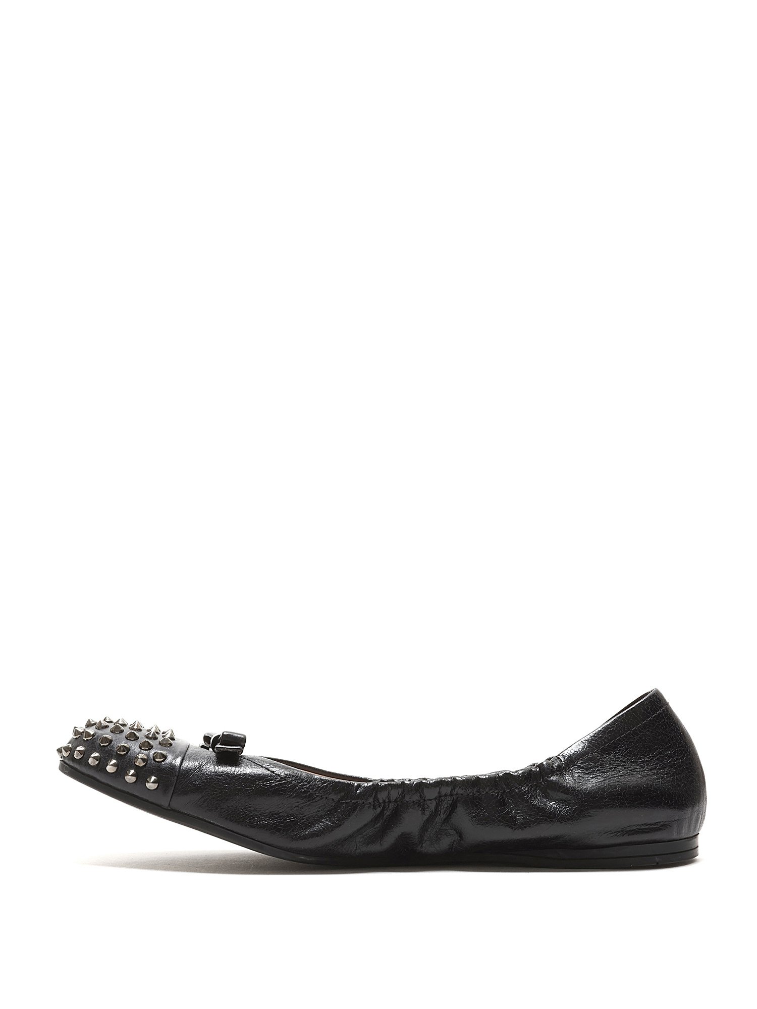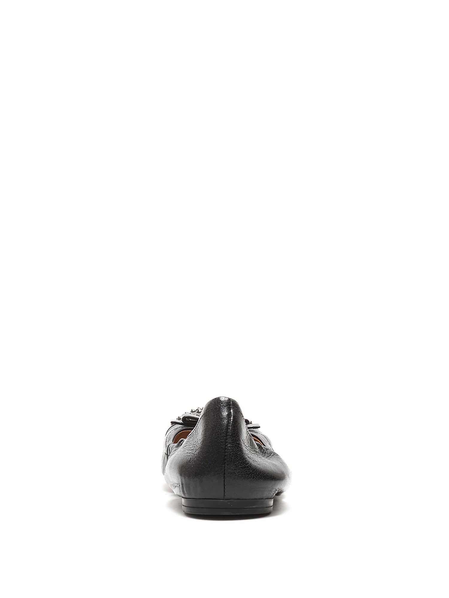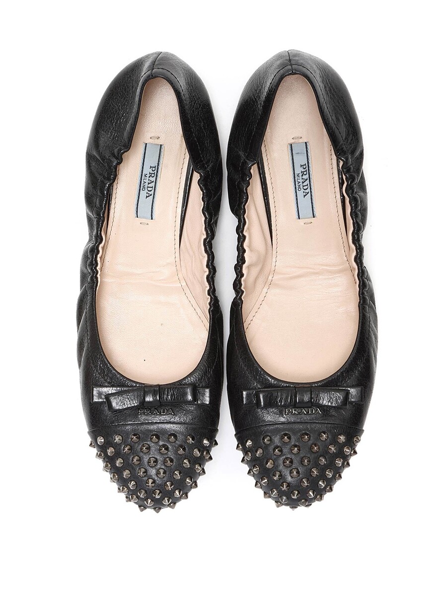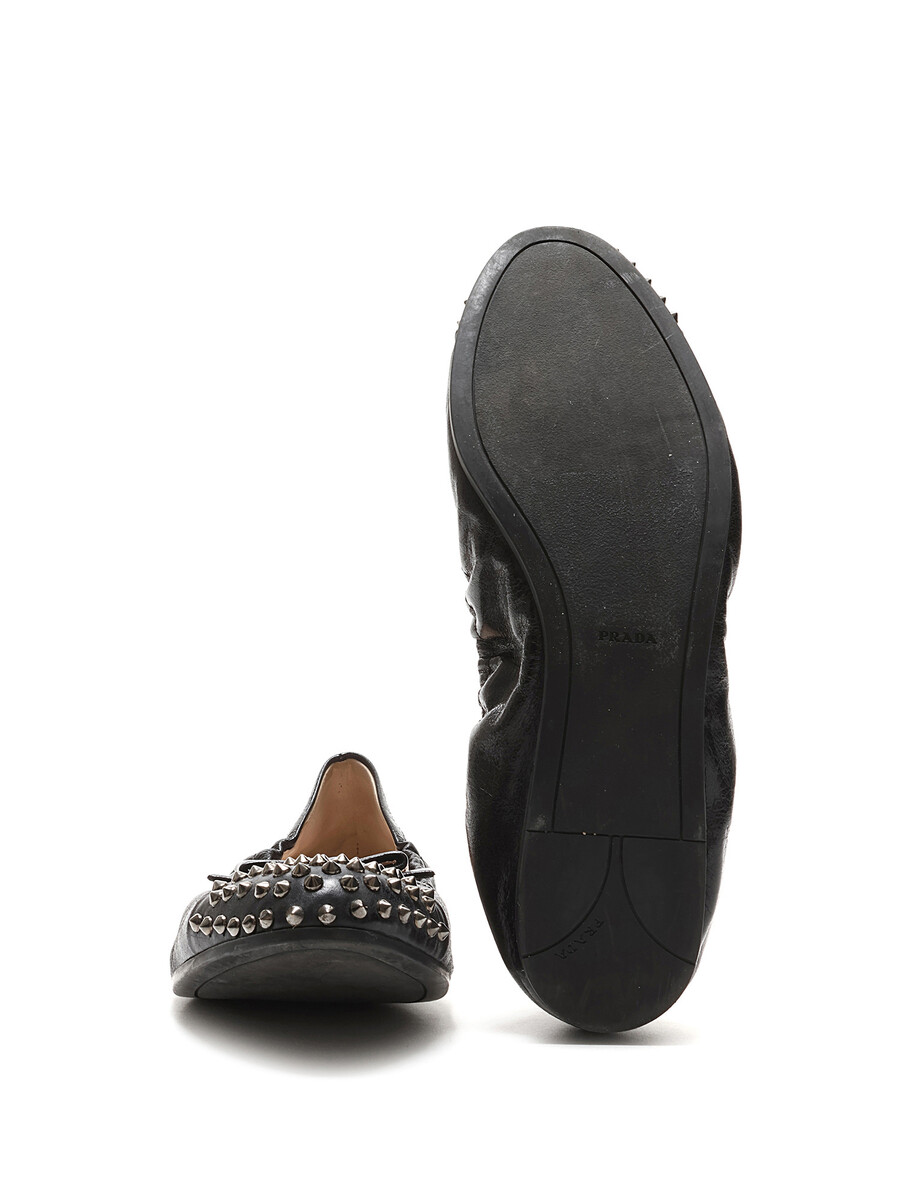 Ballerines en cuir grainé noires avec des clous métalliques décoratifs à l'avant. Style à enfiler avec un bout arrondi et semelle en caoutchouc durable.