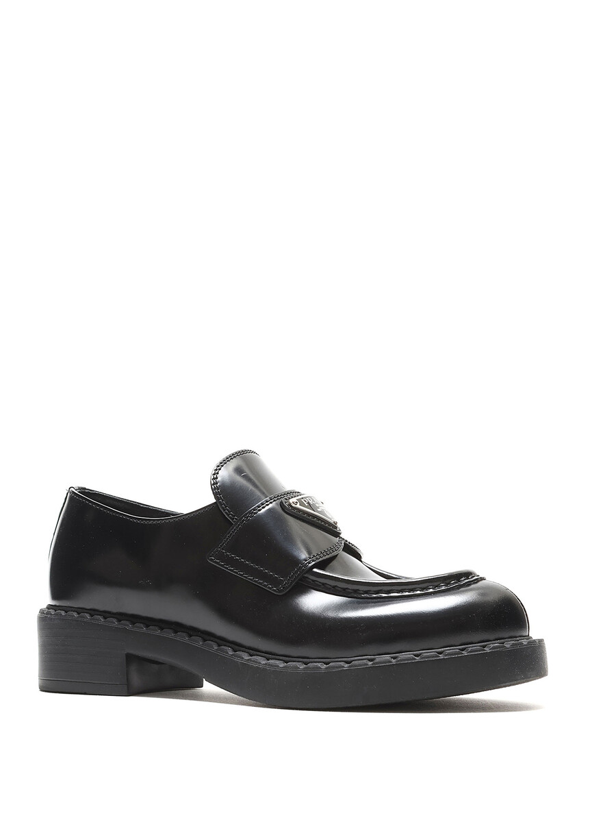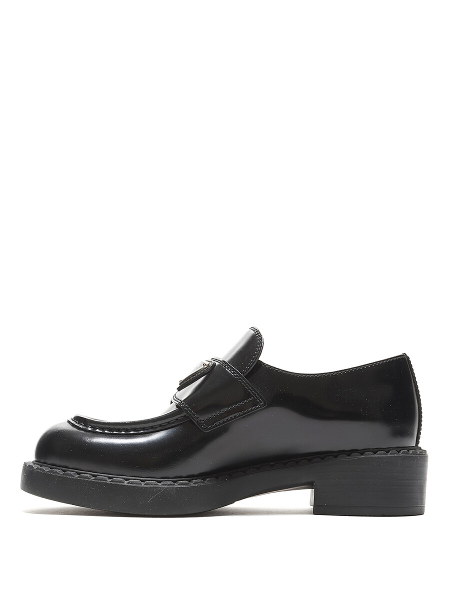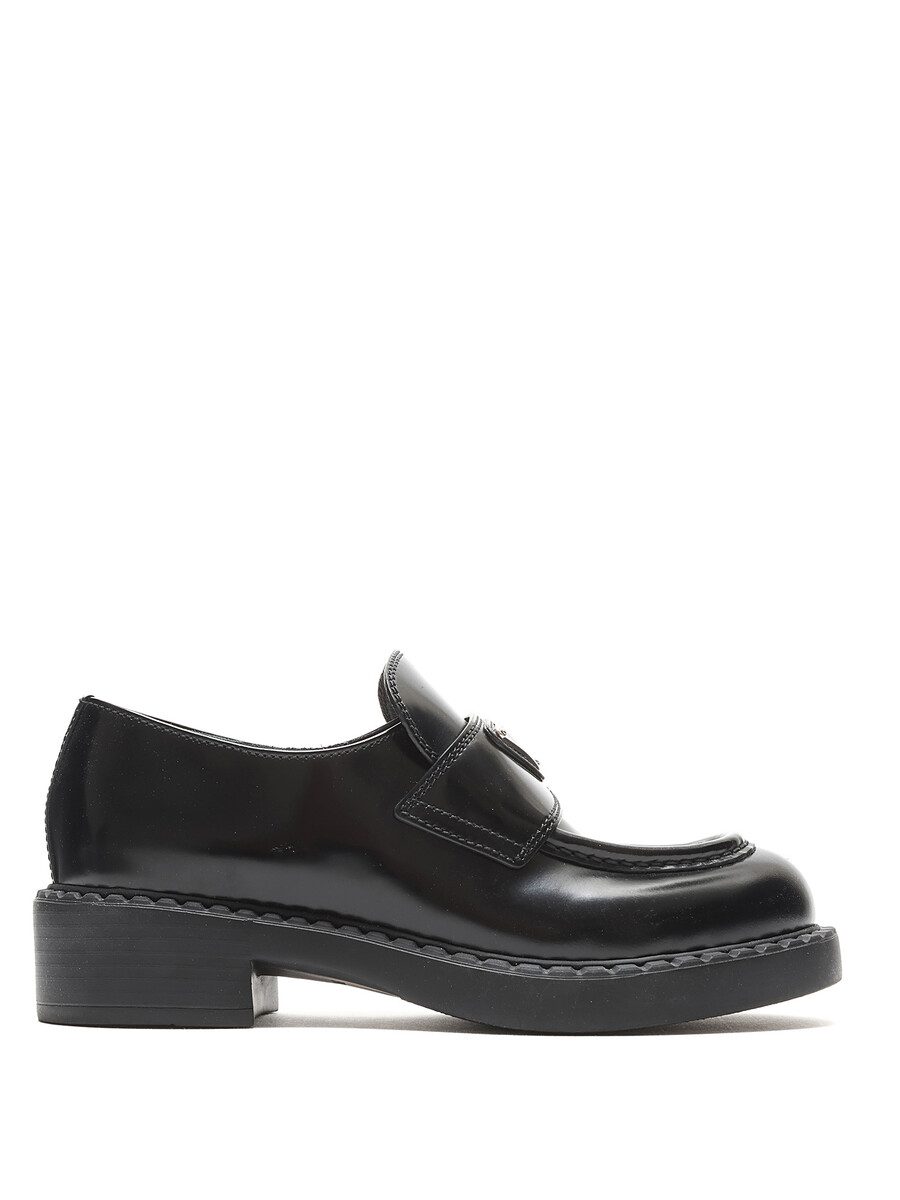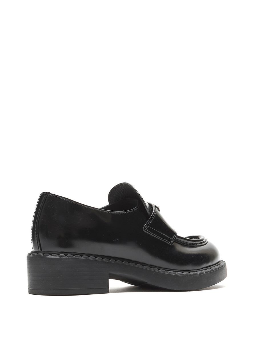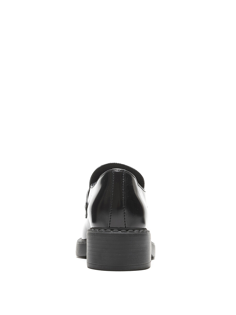 Mocassins en cuir verni noir avec plaque logo. Bout rond. Semelle en caoutchouc.