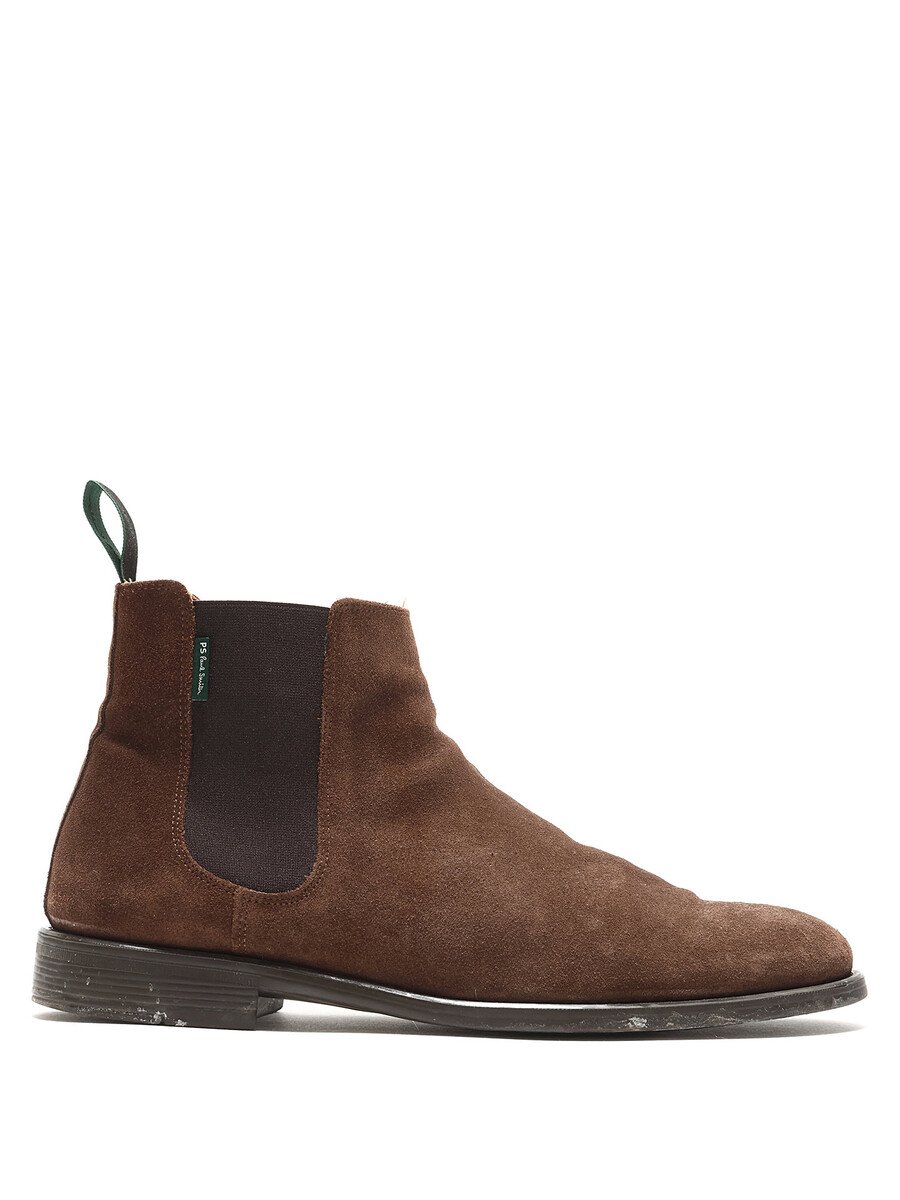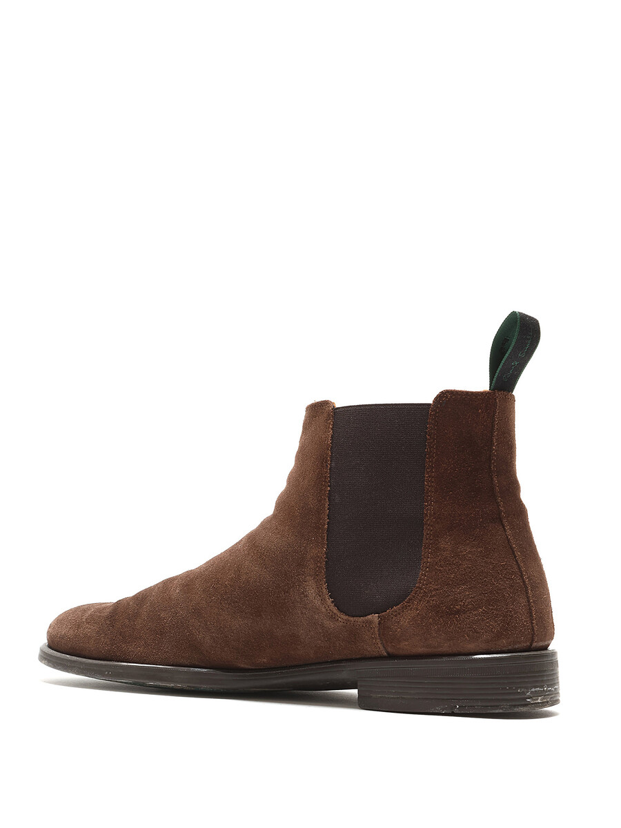 Bottes Chelsea en suède brun avec panneaux élastiques sur les côtés et bout rond. Modèle à enfiler avec semelle en caoutchouc.