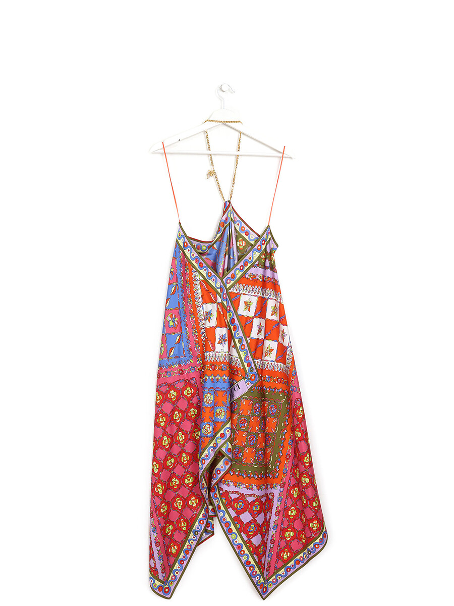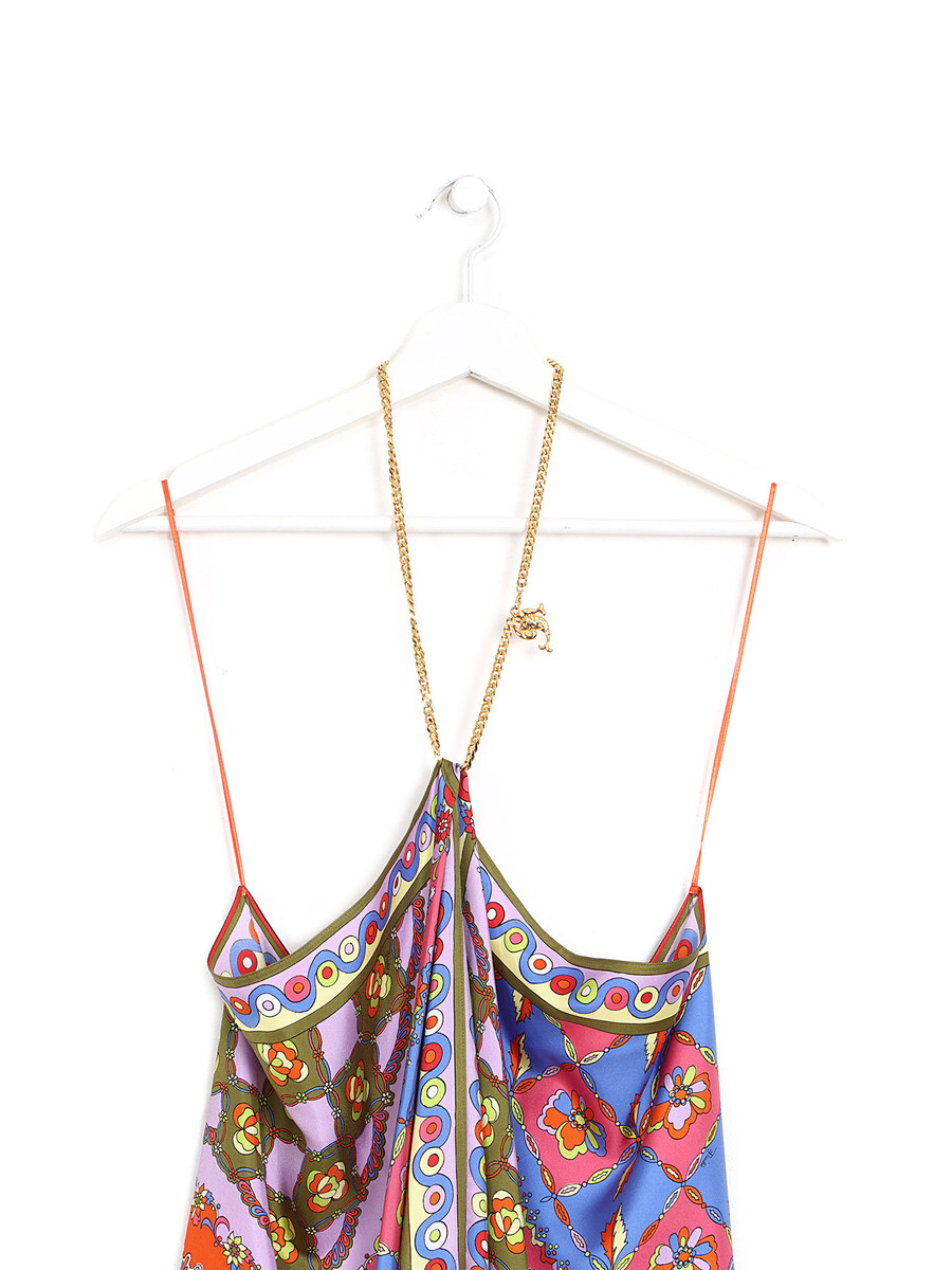 Robe en soie sans manches à motifs géométriques multicolores et bretelle à chaîne. Encolure en V et silhouette fluide.