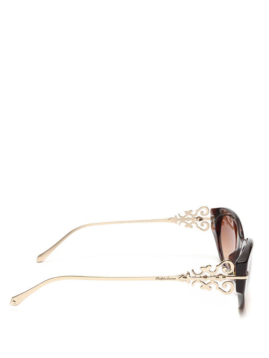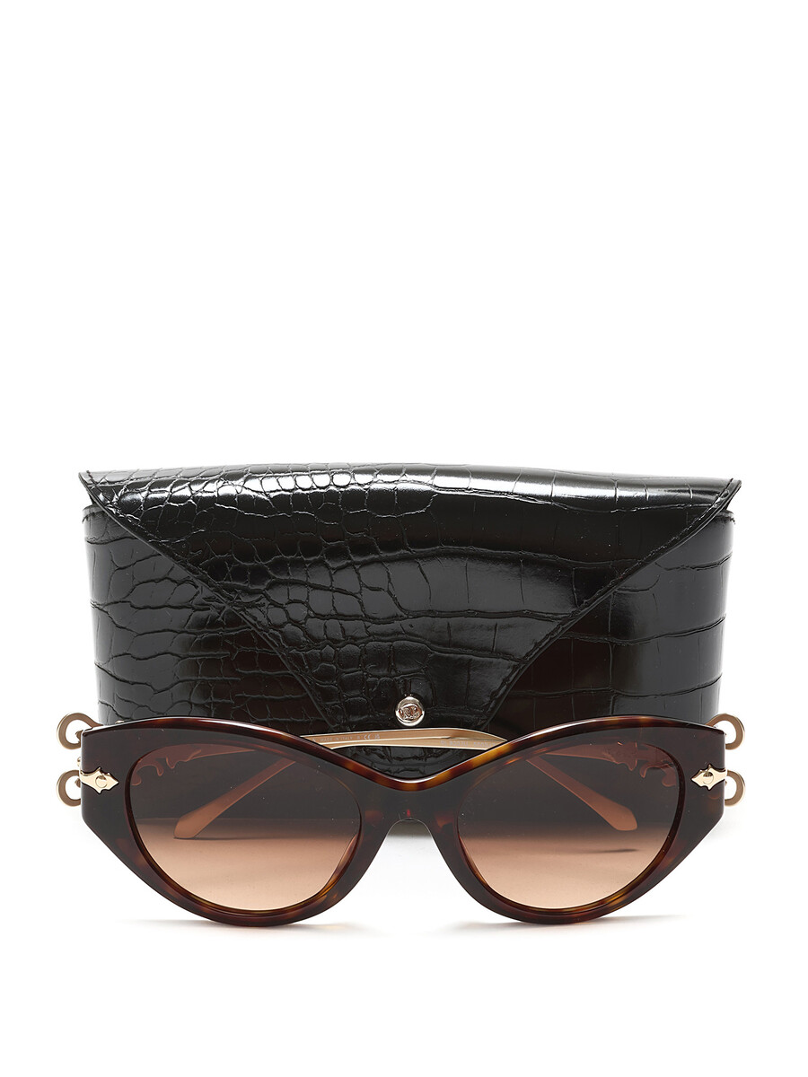 Lunettes de soleil œil-de-chat en acétate de qualité supérieure avec motif écaille de tortue. Éléments décoratifs dorés sur les branches. Livrées avec un étui à embossage crocodile.