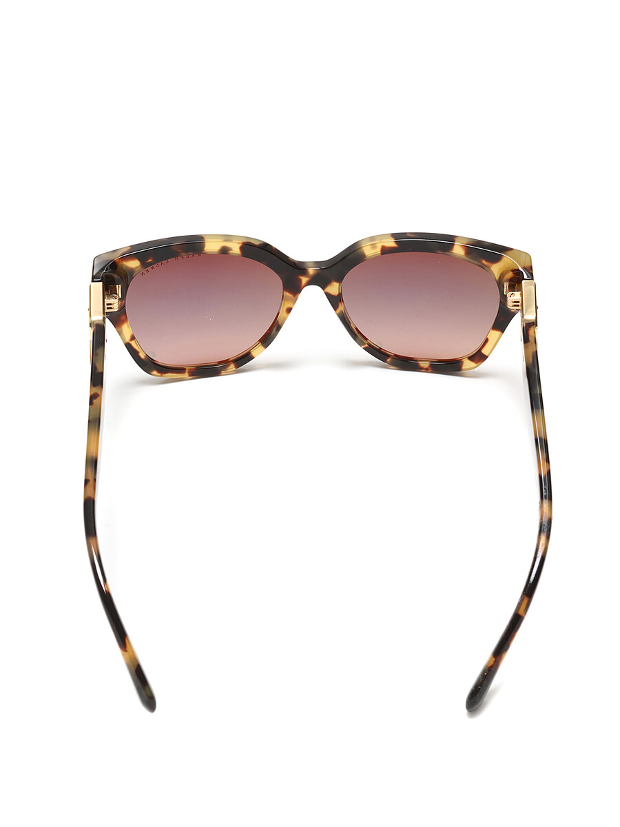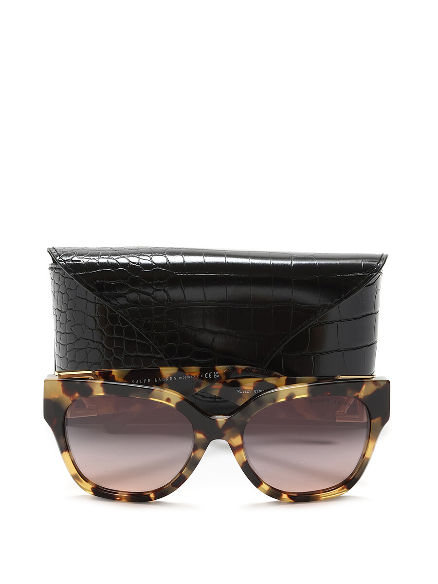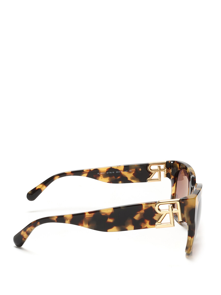 Lunettes de soleil en acétate écaille de tortue avec ornements métalliques dorés emblématiques. Monture carrée classique. Logo sur les branches.
