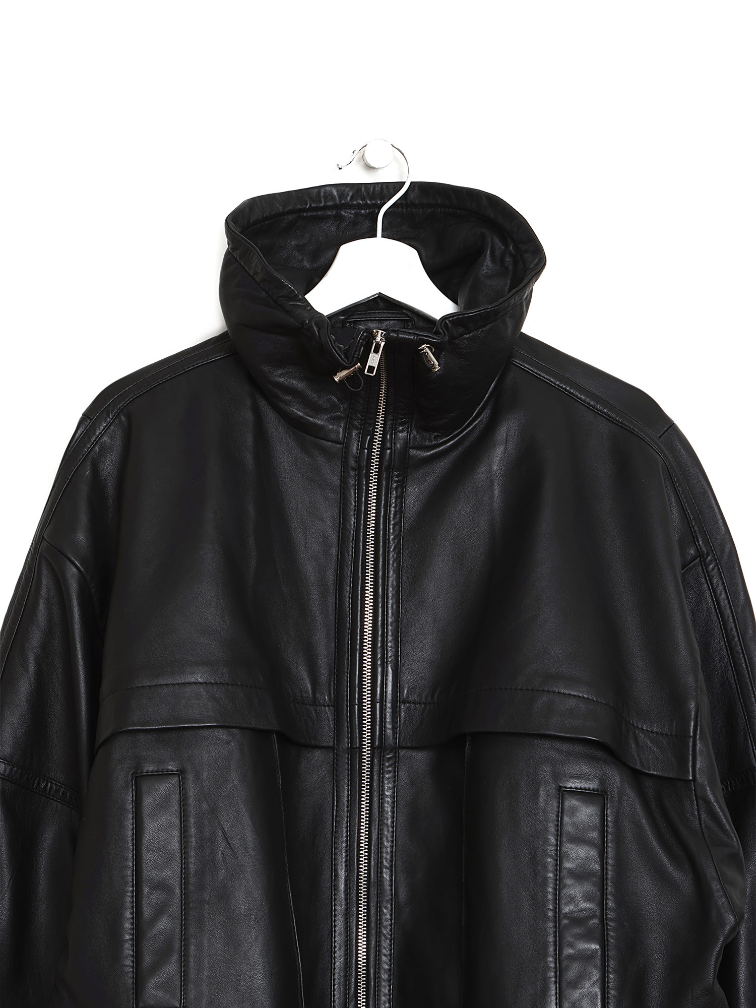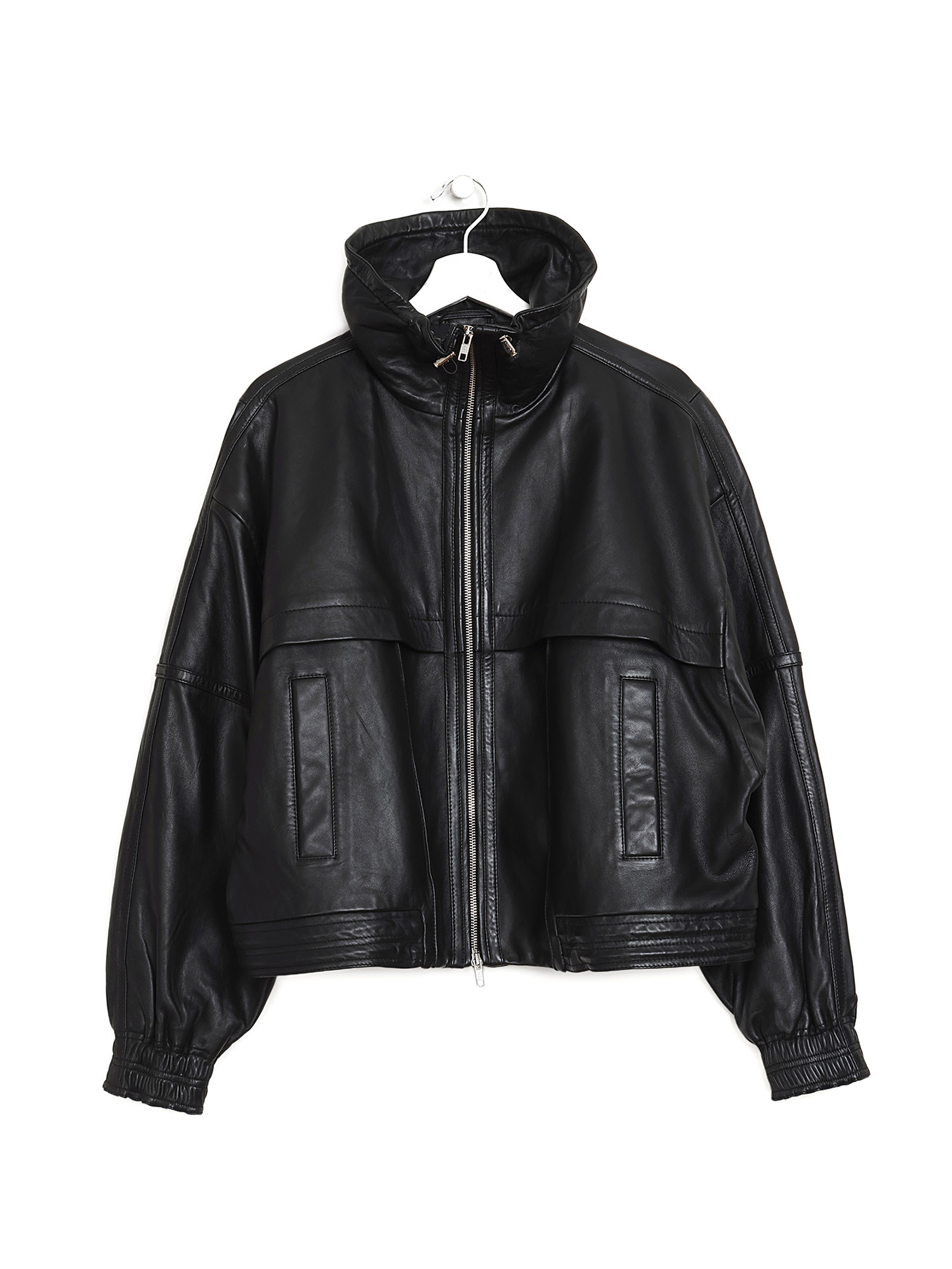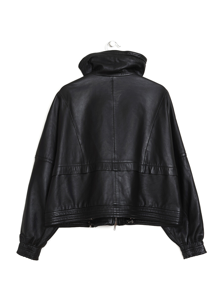 Veston en cuir grainé noir avec un col droit et une fermeture éclair au devant. Texture subtile grâce au cuir grainé. Coupe ajustée.
