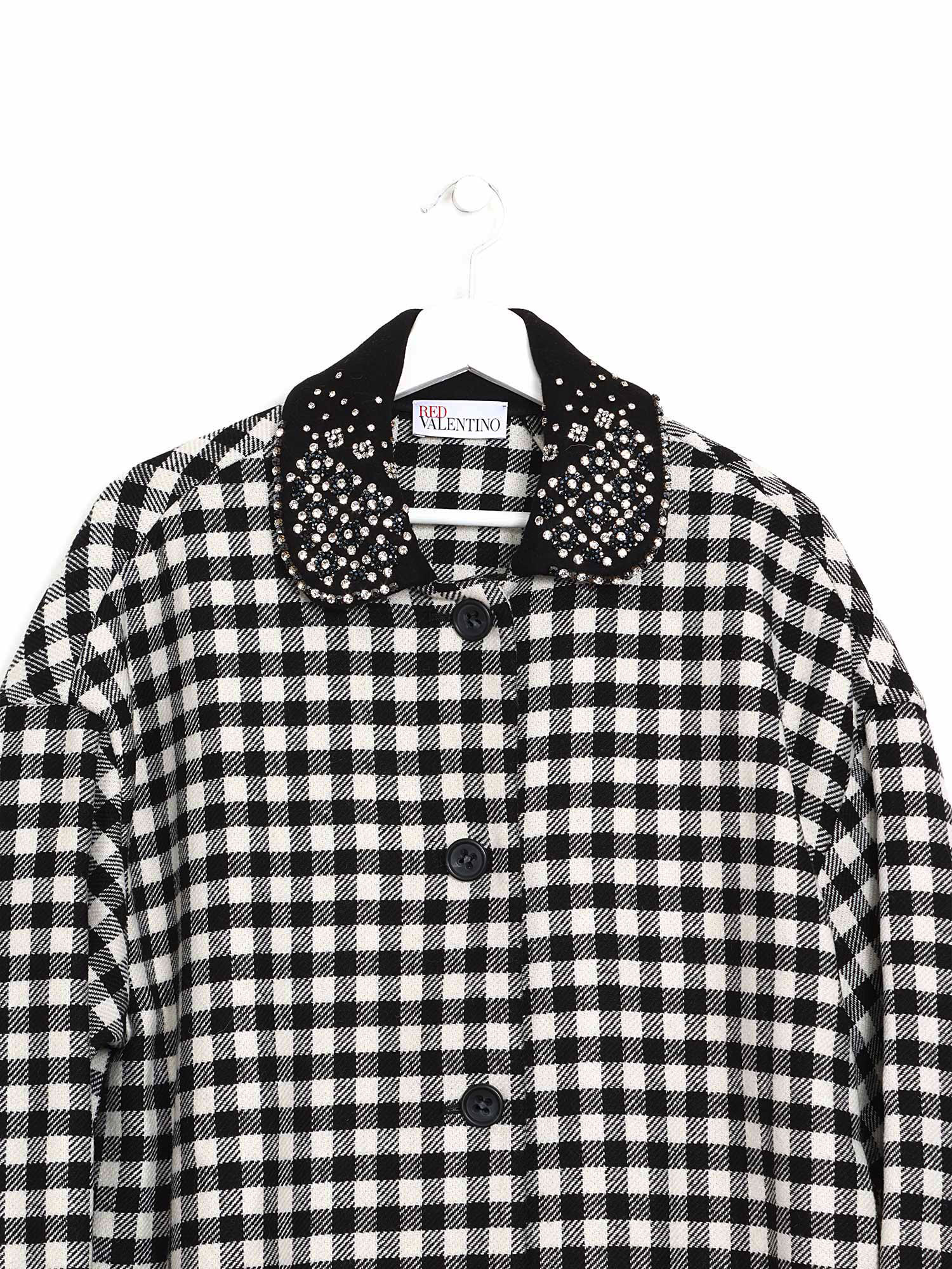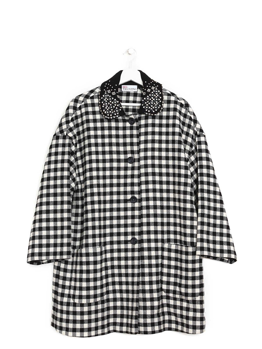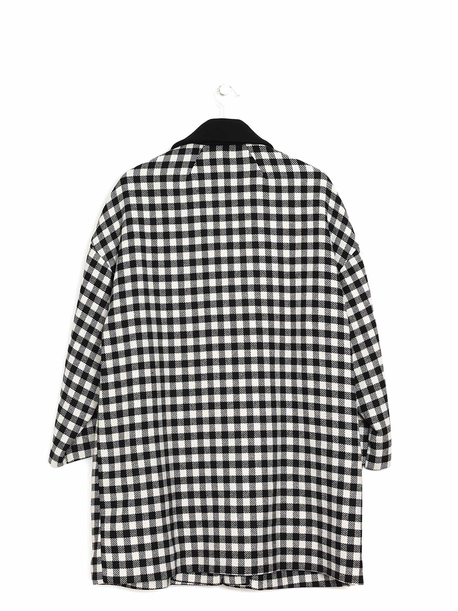 Veste mi-longue à manches longues avec motif à carreaux noirs et blancs et col orné. En mélange de laine.