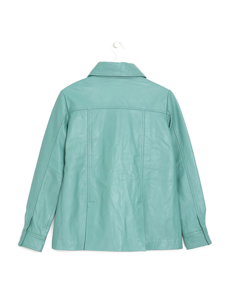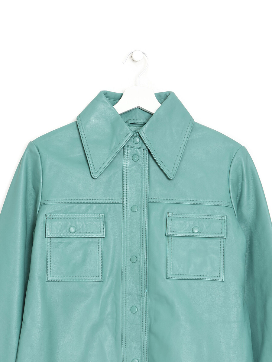 Veste en cuir à manches longues dans un style épuré en menthe. Fermeture à boutons, boutons menthe. Col de chemise. Deux poches avant avec rabats.