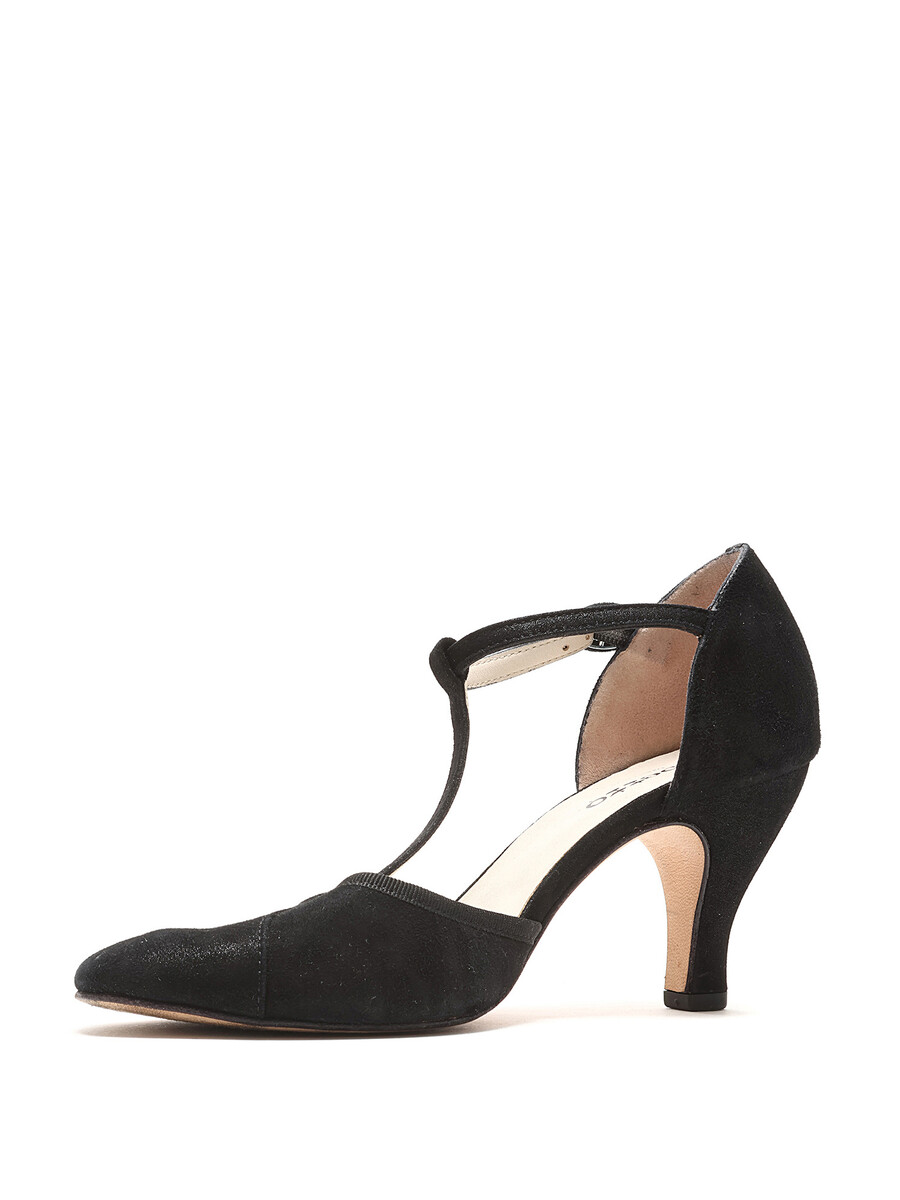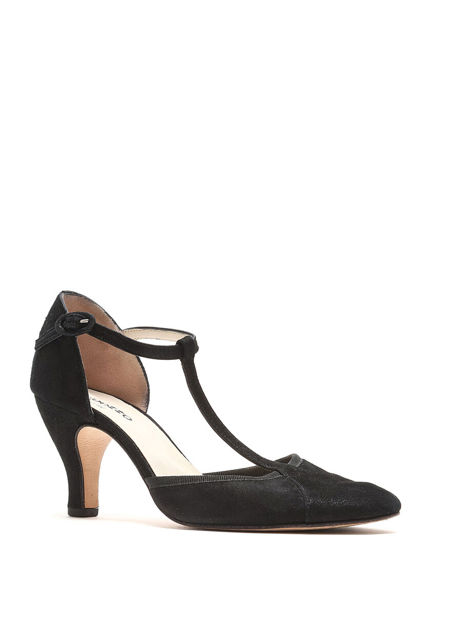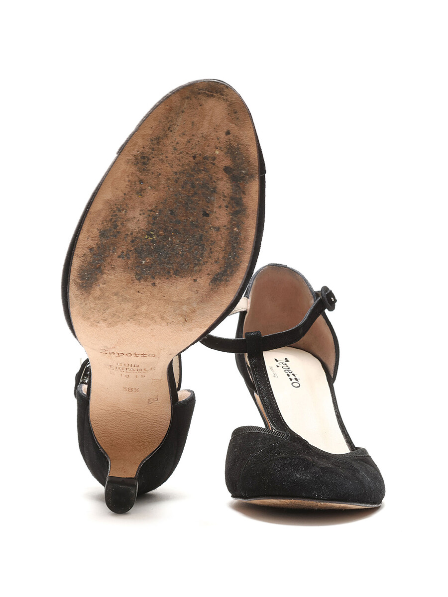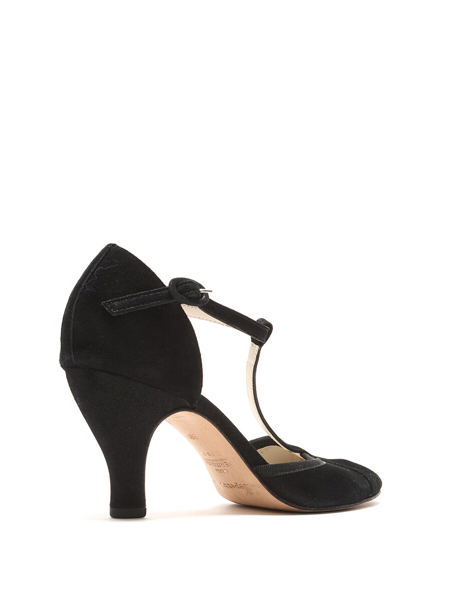 Talons hauts à bride arrière en suède noir avec motif uni. Fermeture à boucle. Bout rond fermé. Semelle en cuir.