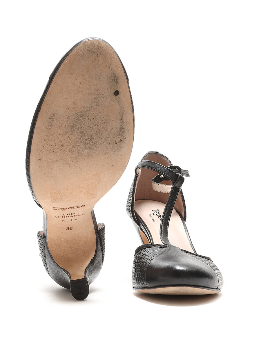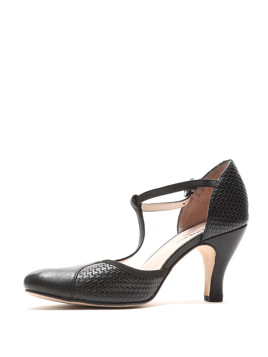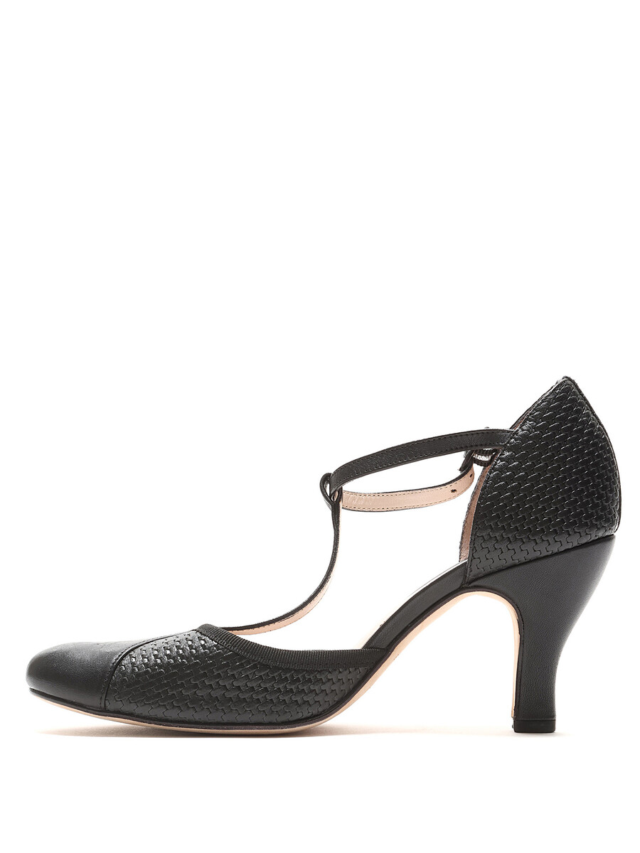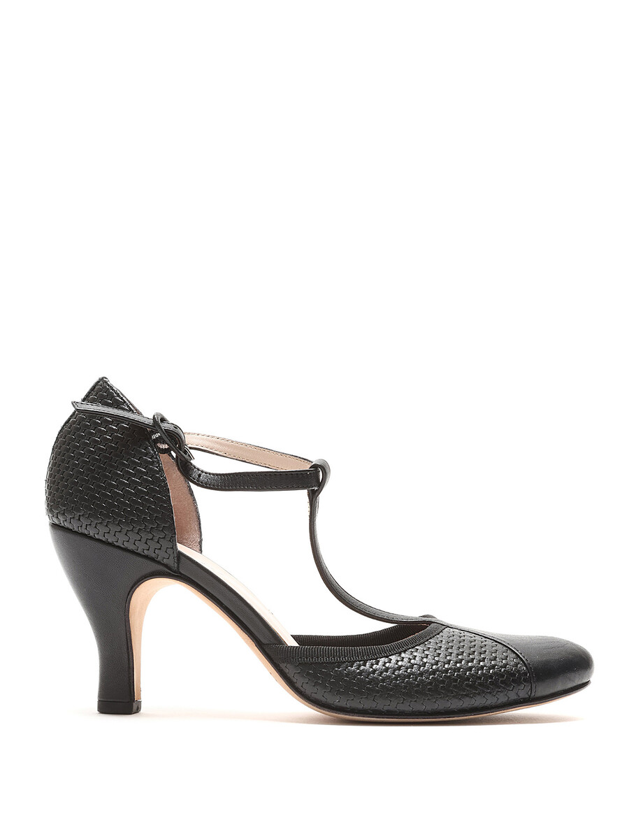 Talons hauts à bride cheville en noir avec une texture tissée. Fermeture à boucle. Style à bout rond. Semelle en cuir.