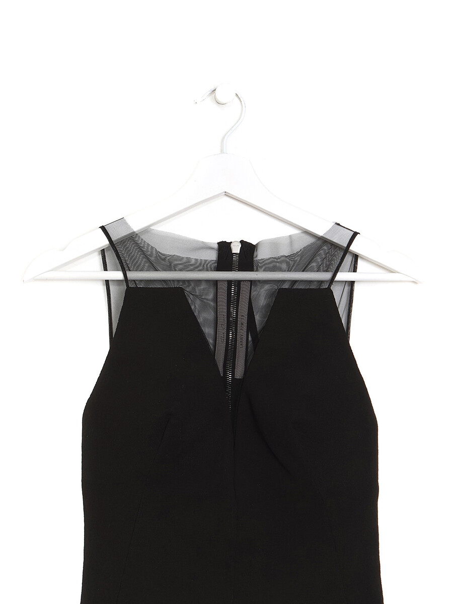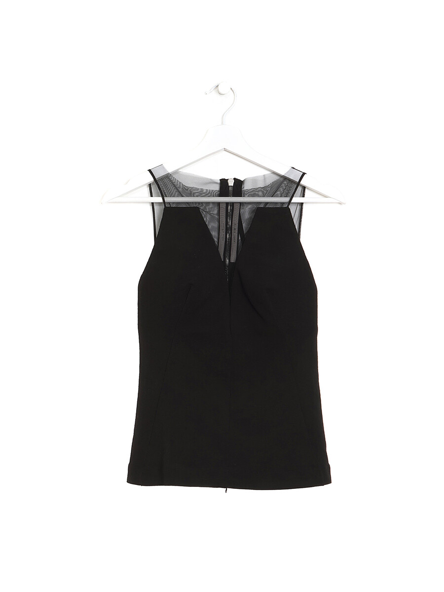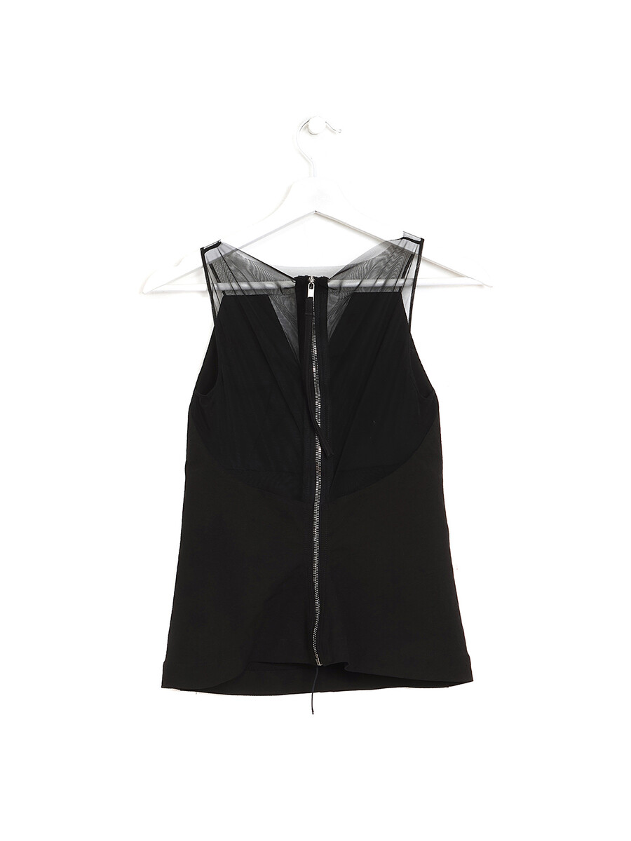 Débardeur style corset noir avec empiècement en tulle transparent. Fermeture à glissière au dos.