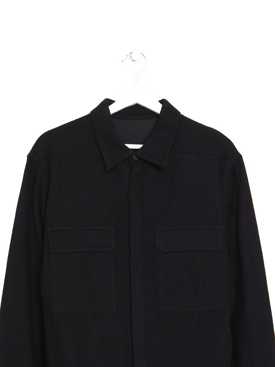 Chemise de travail à manches longues en mélange de laine noire. Fermeture à boutons au devant et col classique de chemise. Poches à rabat sur le devant. Coupe décontractée.