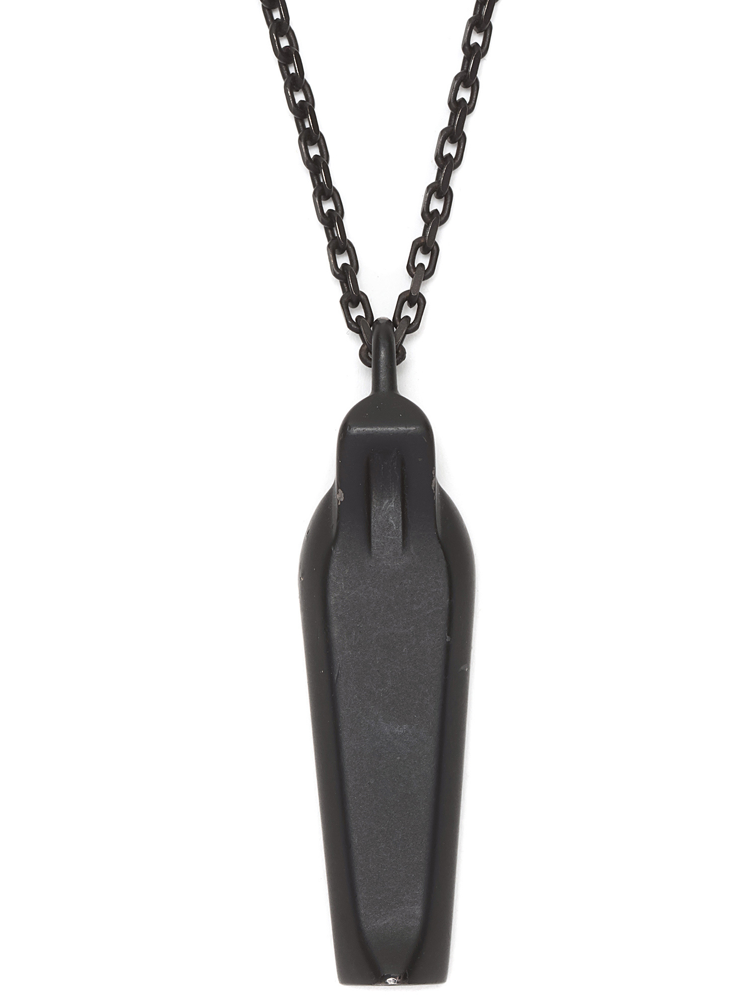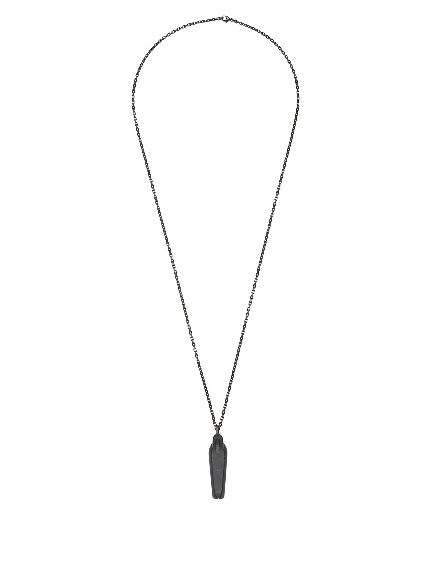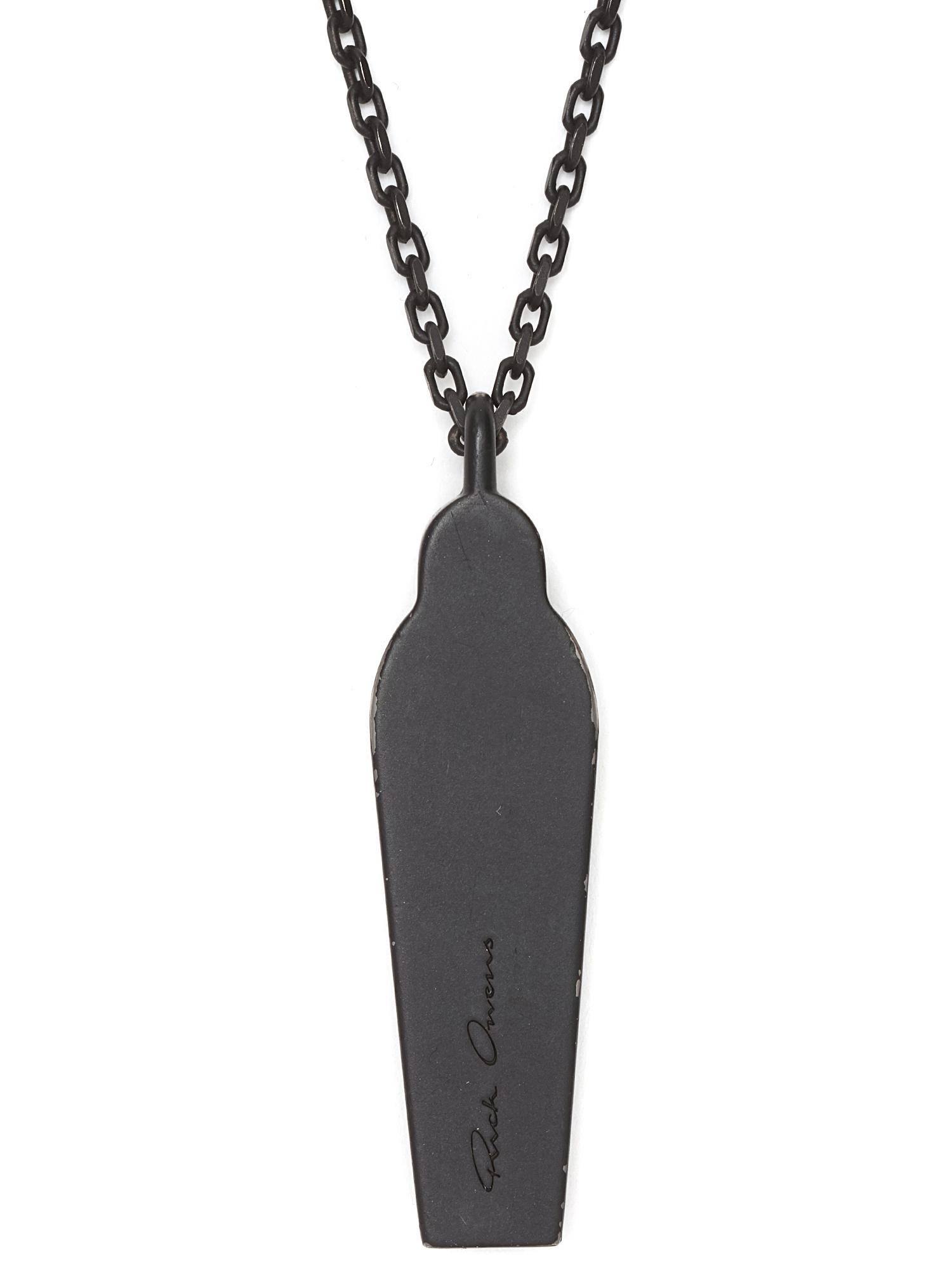 Collier à pendentif en métal noir au design géométrique, avec gravure signature Rick Owens. Esthétique minimaliste et épurée avec une touche architecturale.