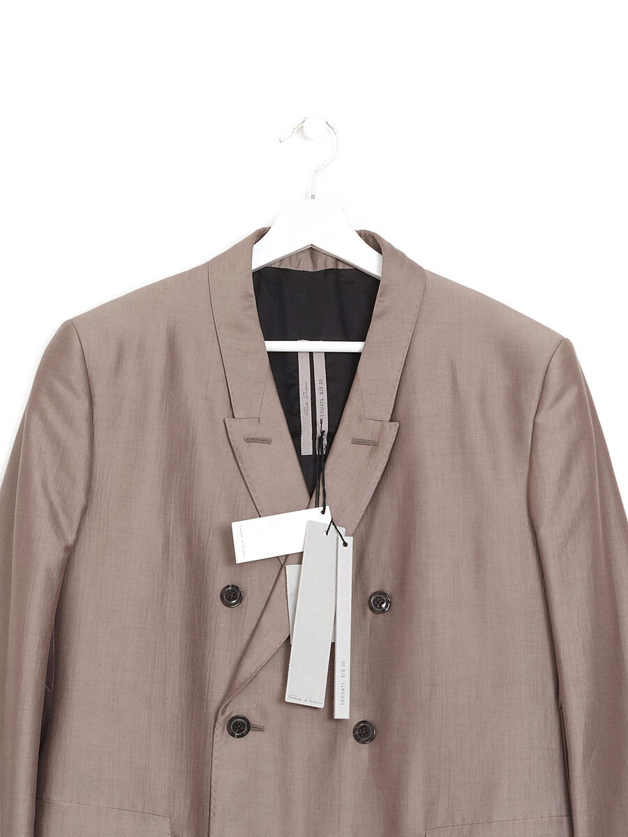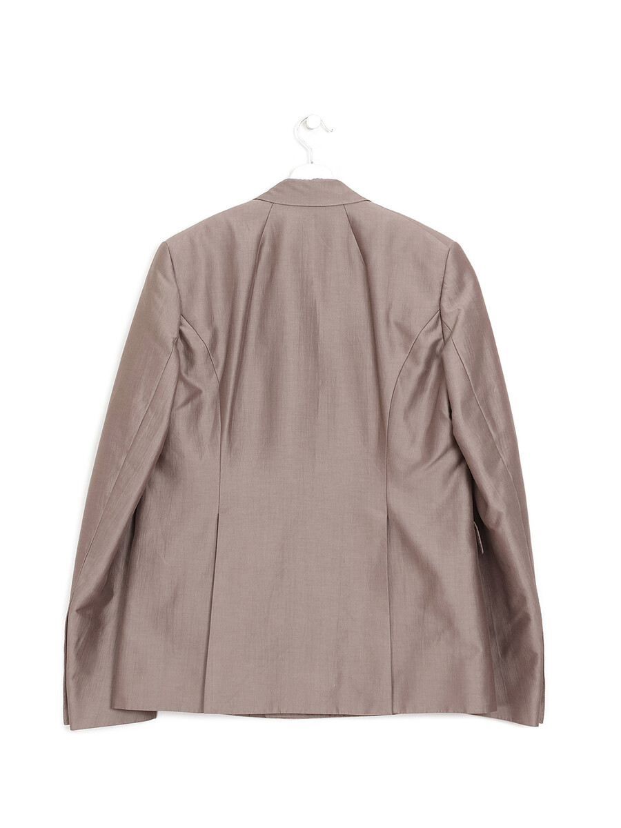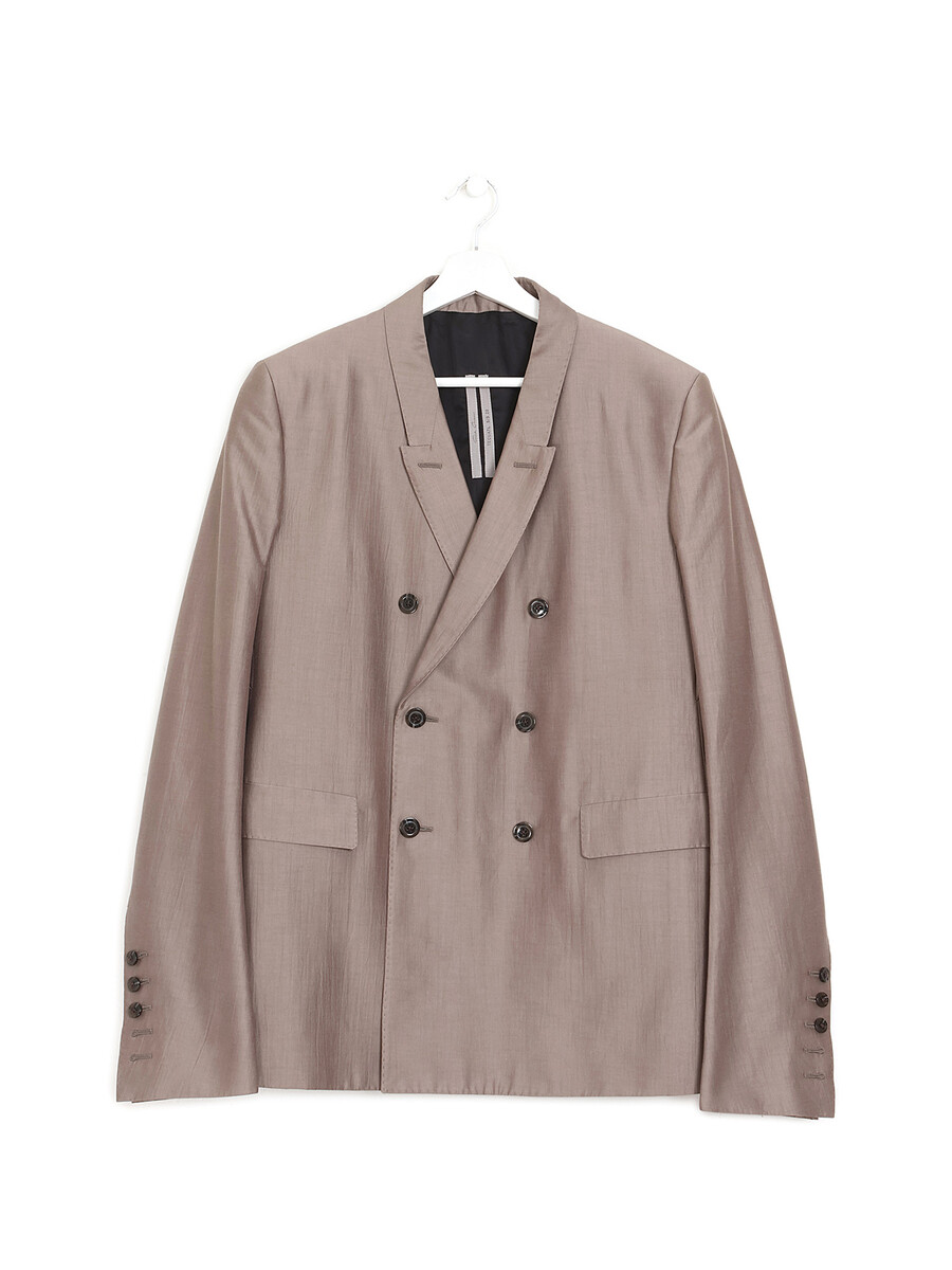 Veston à double boutonnage en gris. Col à revers en pointe. Poches à rabat.
