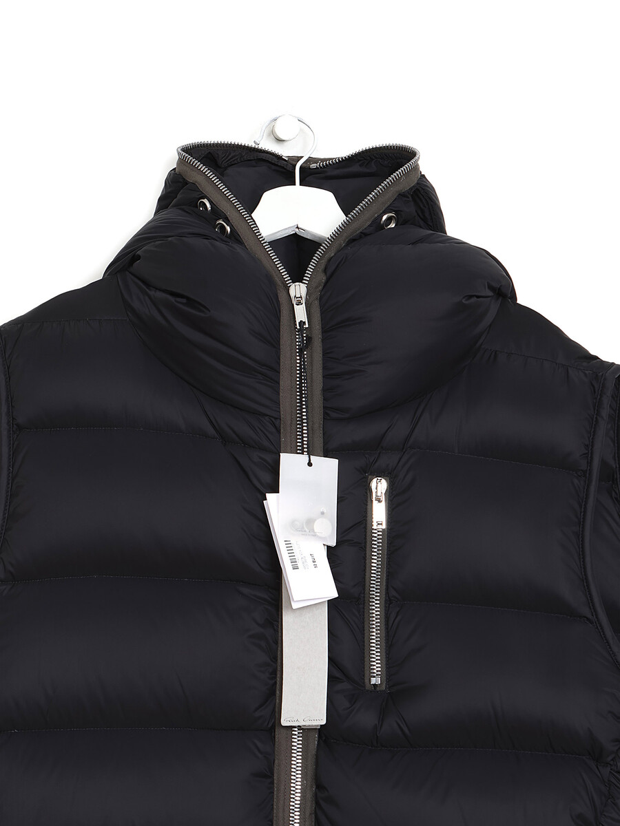 Veste sans manches Jumbo Gimp Down en noir. Fermeture zippée frontale. Capuche intégrée. Matelassée pour la chaleur. De la collection Runway FW'22.