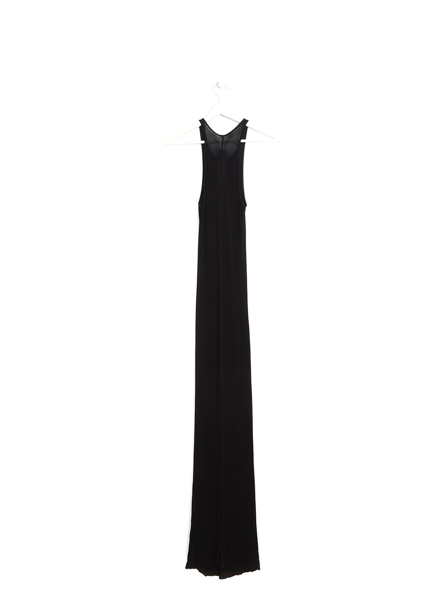 Robe maxi sans manches en tricot côtelé et semi-transparente noire. Dos nageur. Design minimaliste et léger avec une silhouette ajustée.