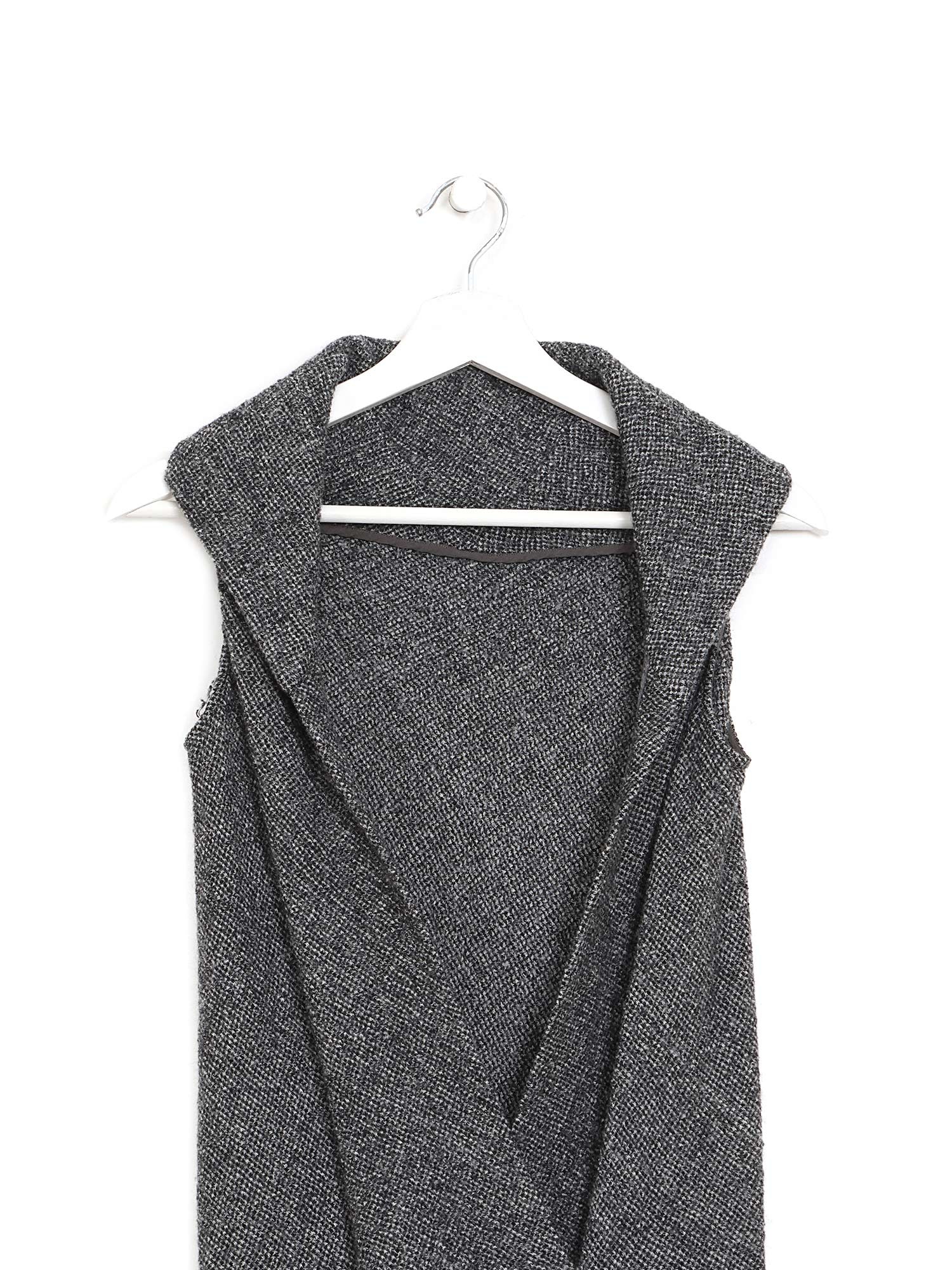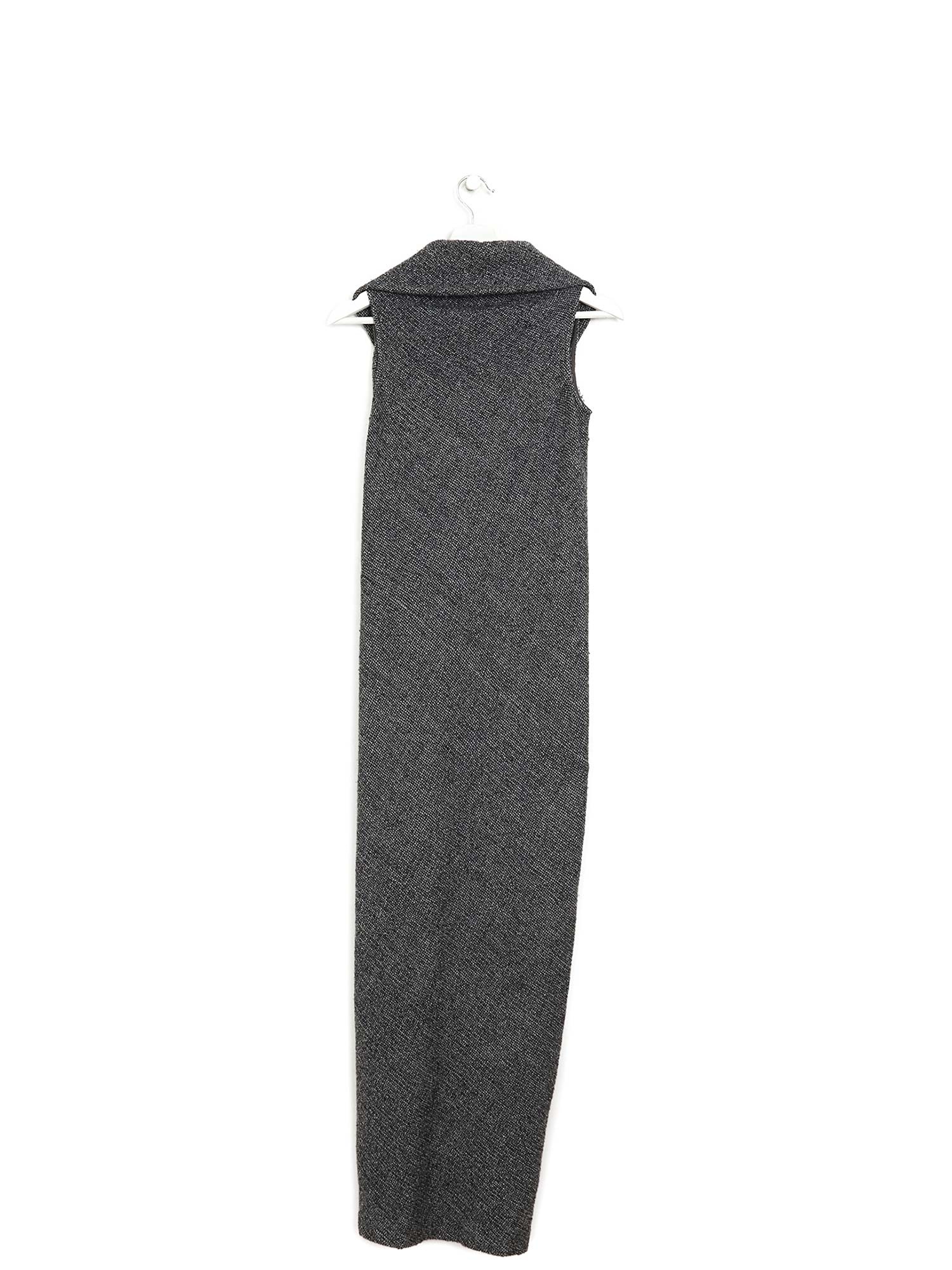 Robe longue sans manches en tricot de laine noir et blanc. Col montant.