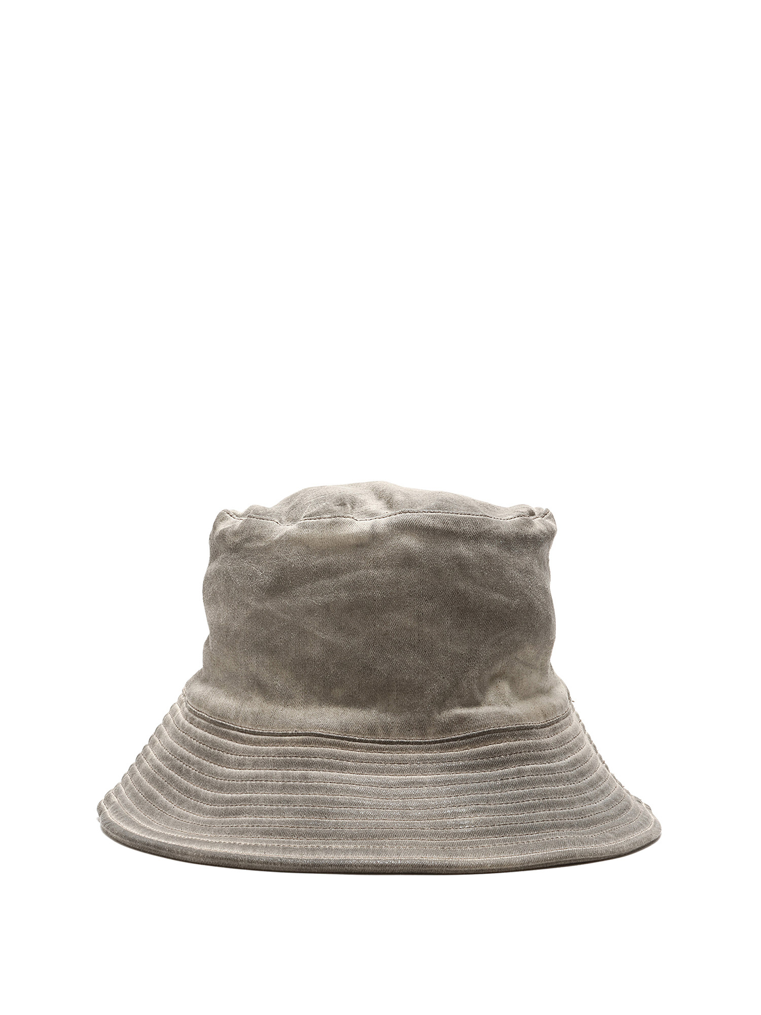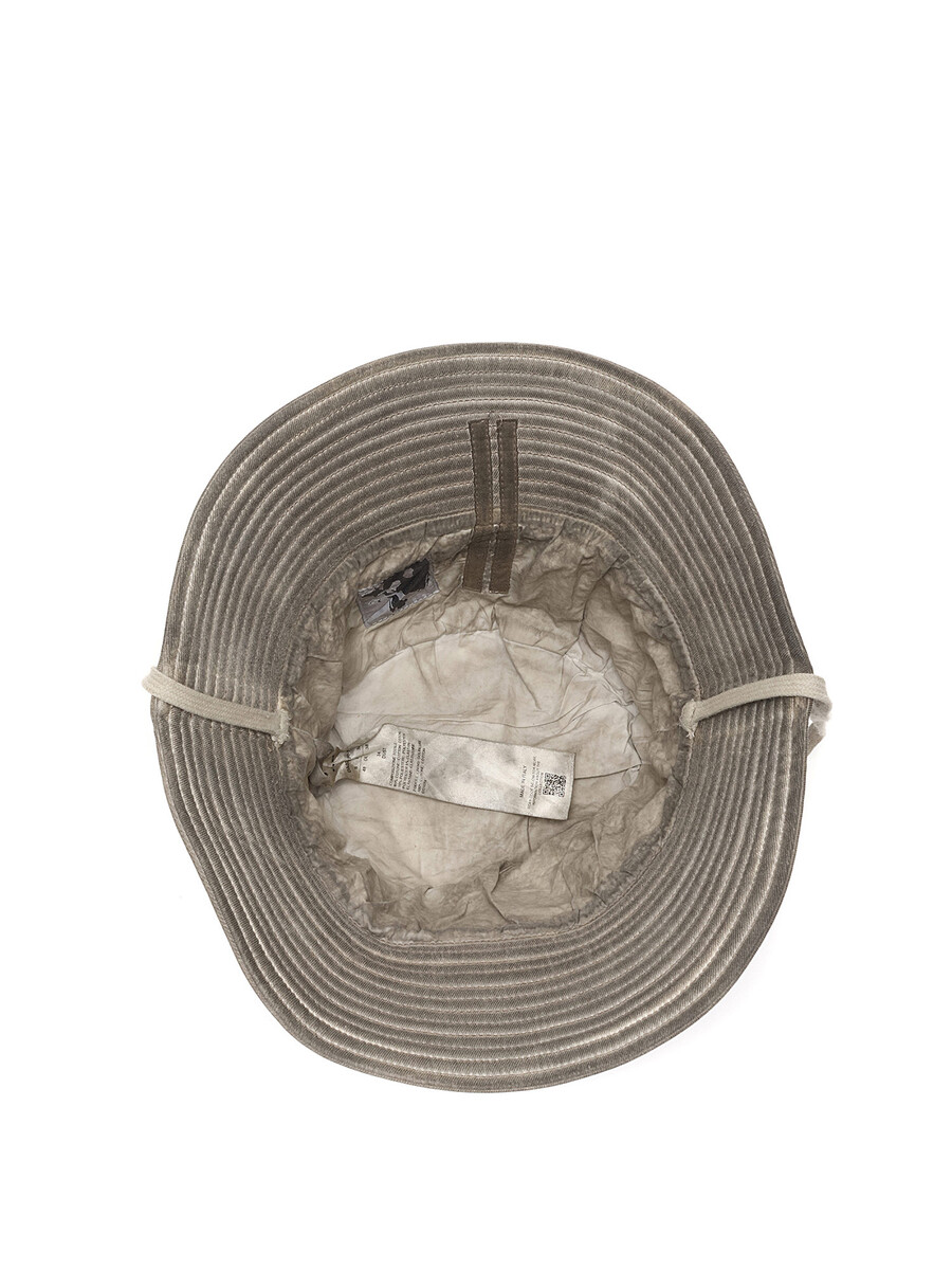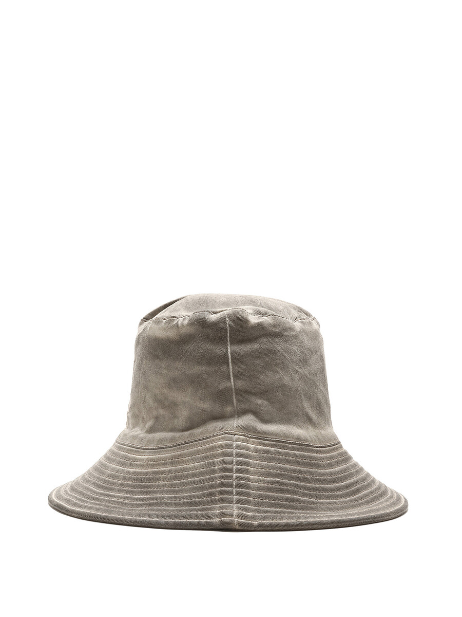 Chapeau bob à finition cirée en gris. Présente un bord structuré et un détail de couture signature.