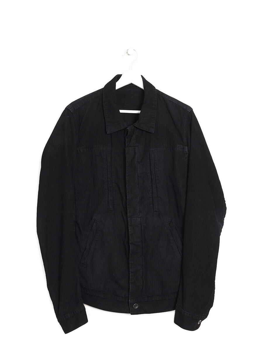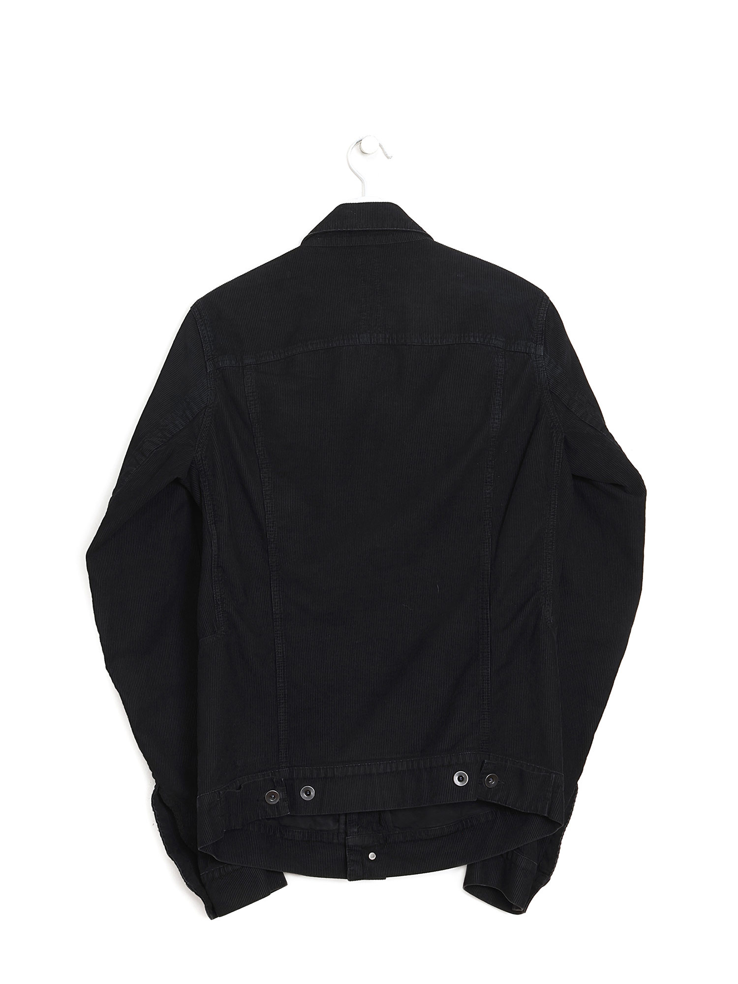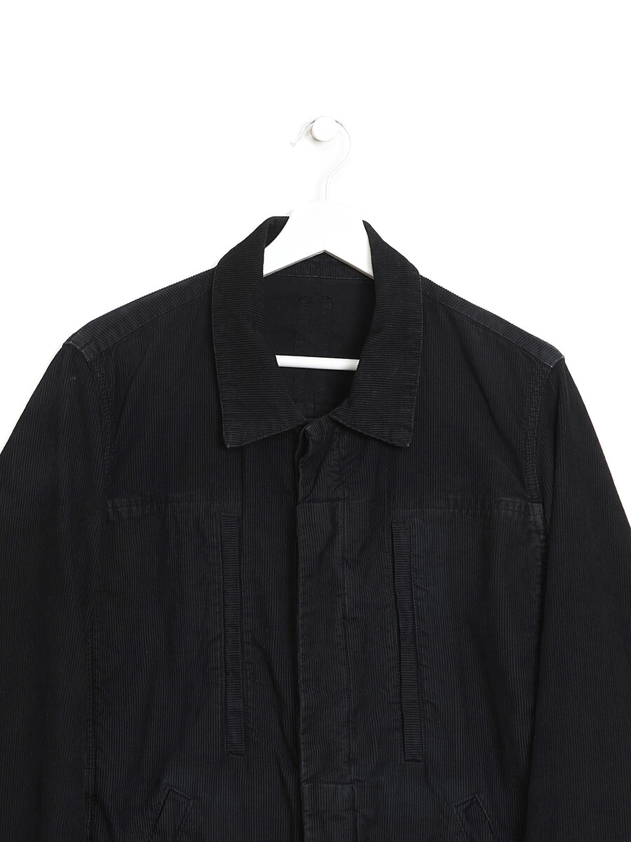 Veston en velours côtelé noir avec fermeture à boutons. Col chemise classique. Quatre poches pour l'utilité et le style.