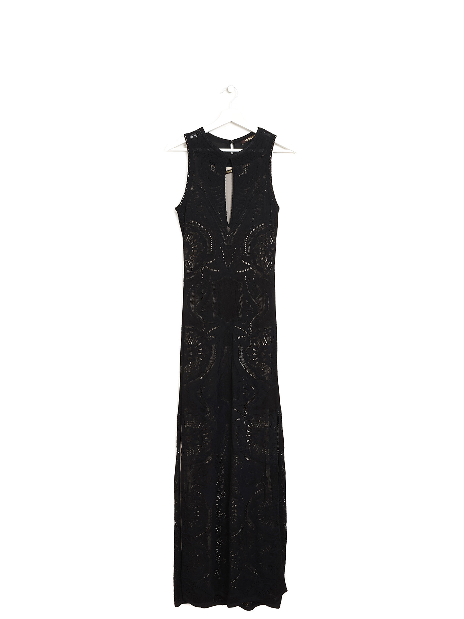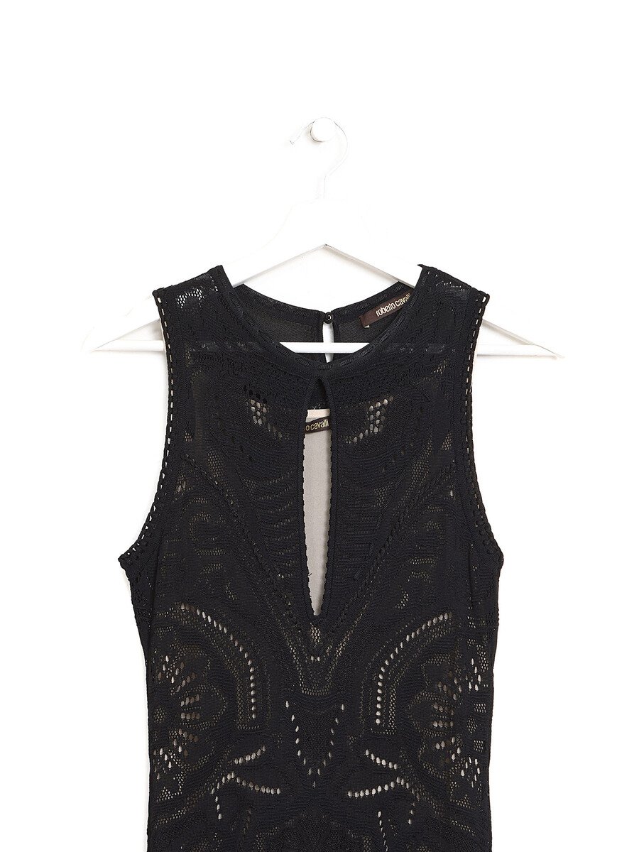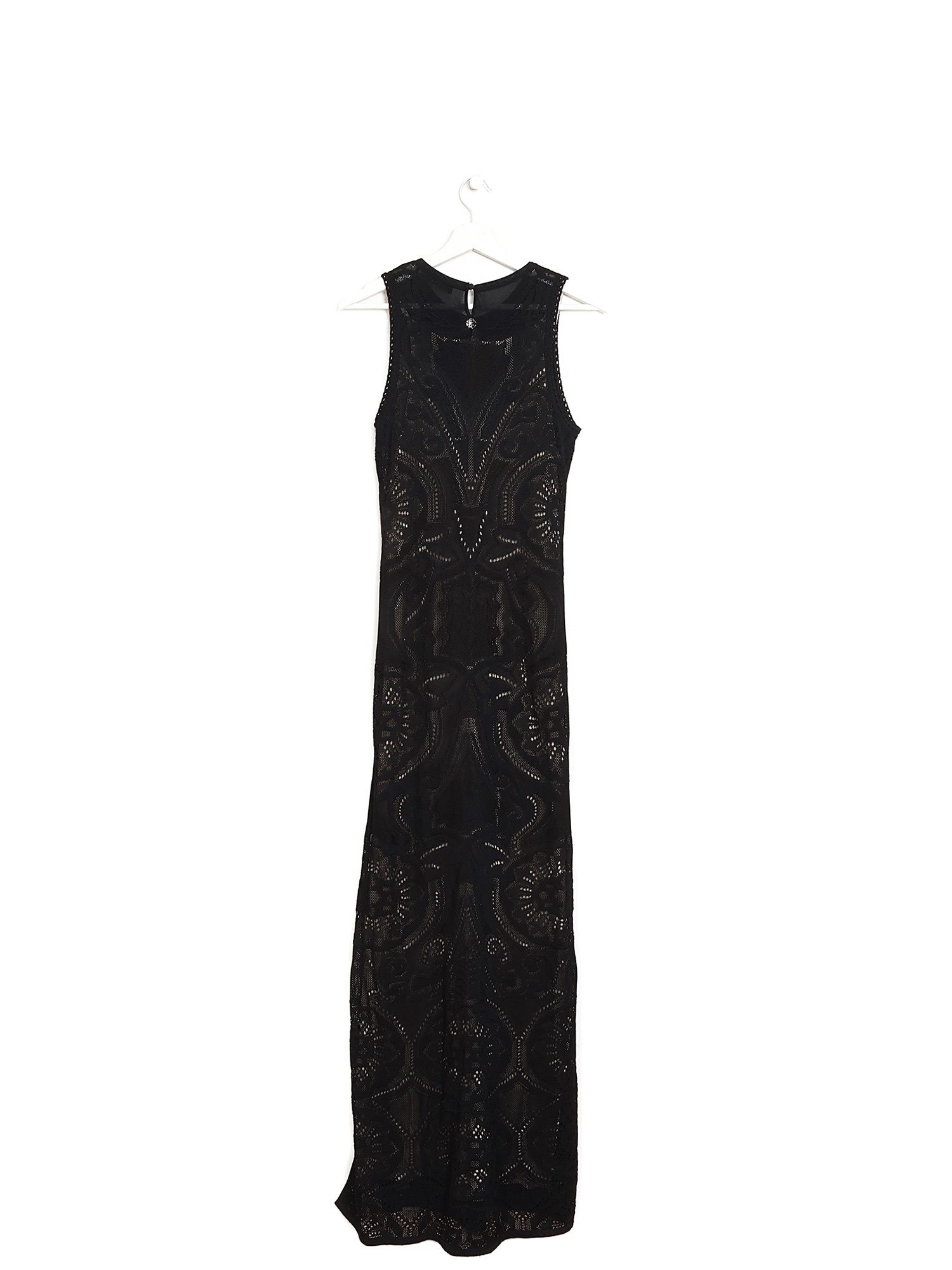 Robe maxi sans manches en dentelle noire avec doublure. Détails en dentelle sophistiquée sur l’ensemble.