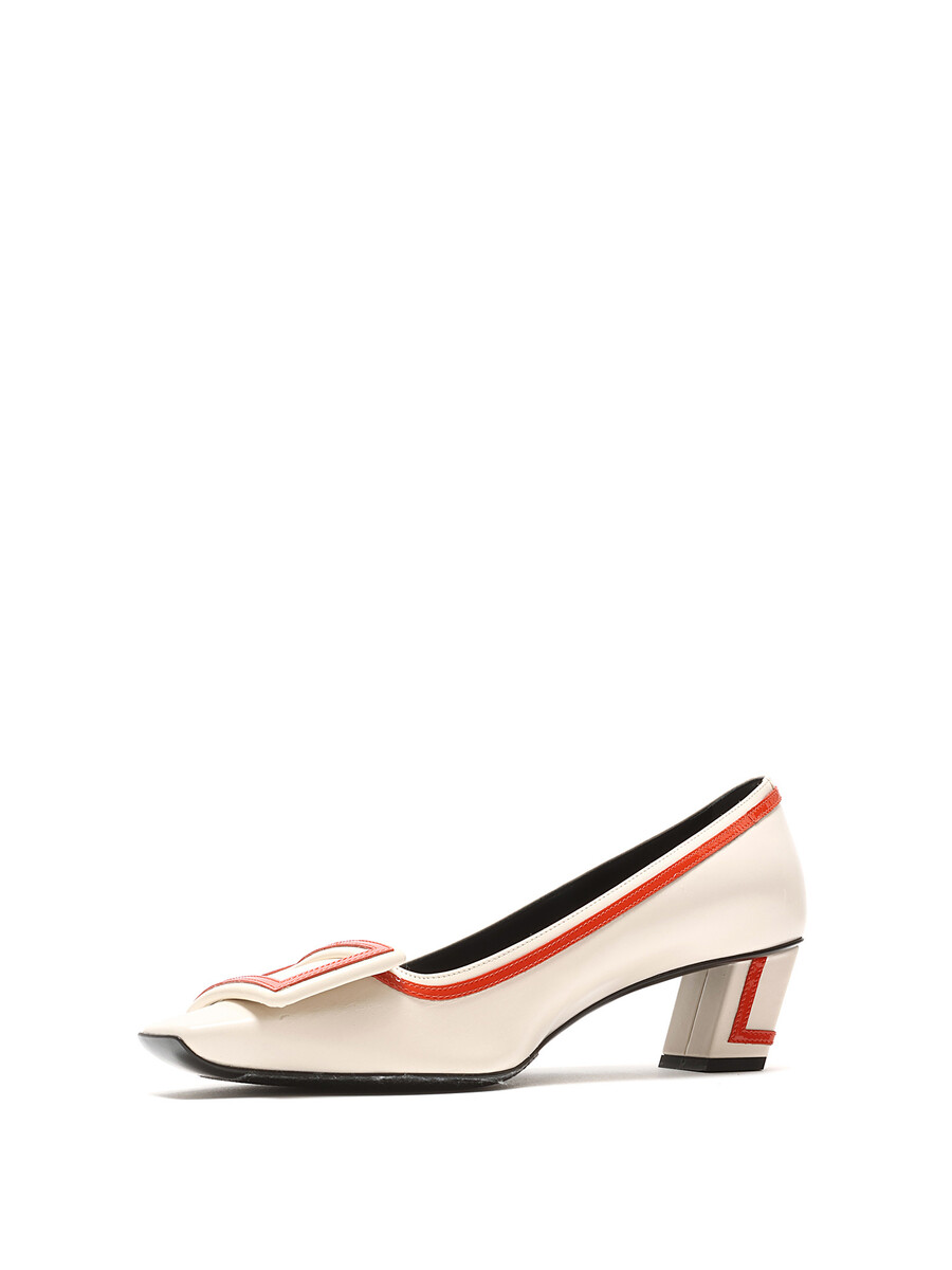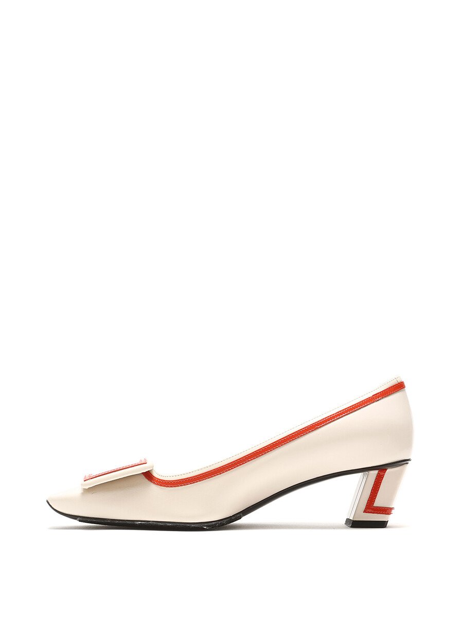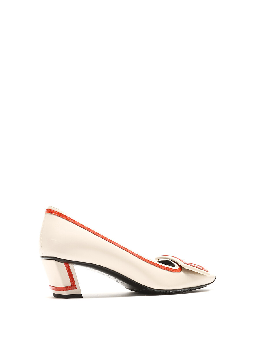 Mocassins en cuir orange et blanc avec détail de grande boucle. Style à enfiler avec bout carré et semelle en caoutchouc. Avec dust bag.