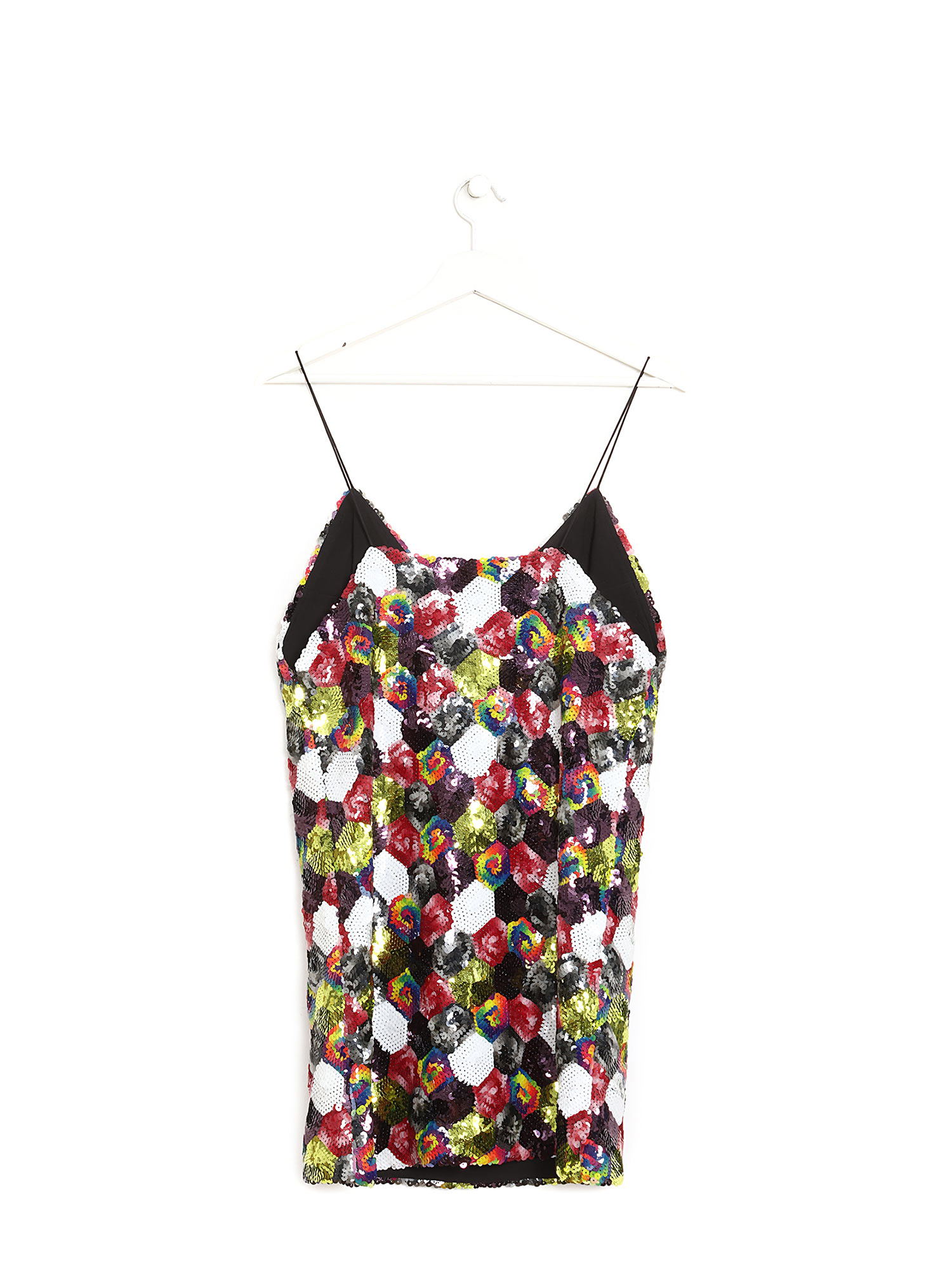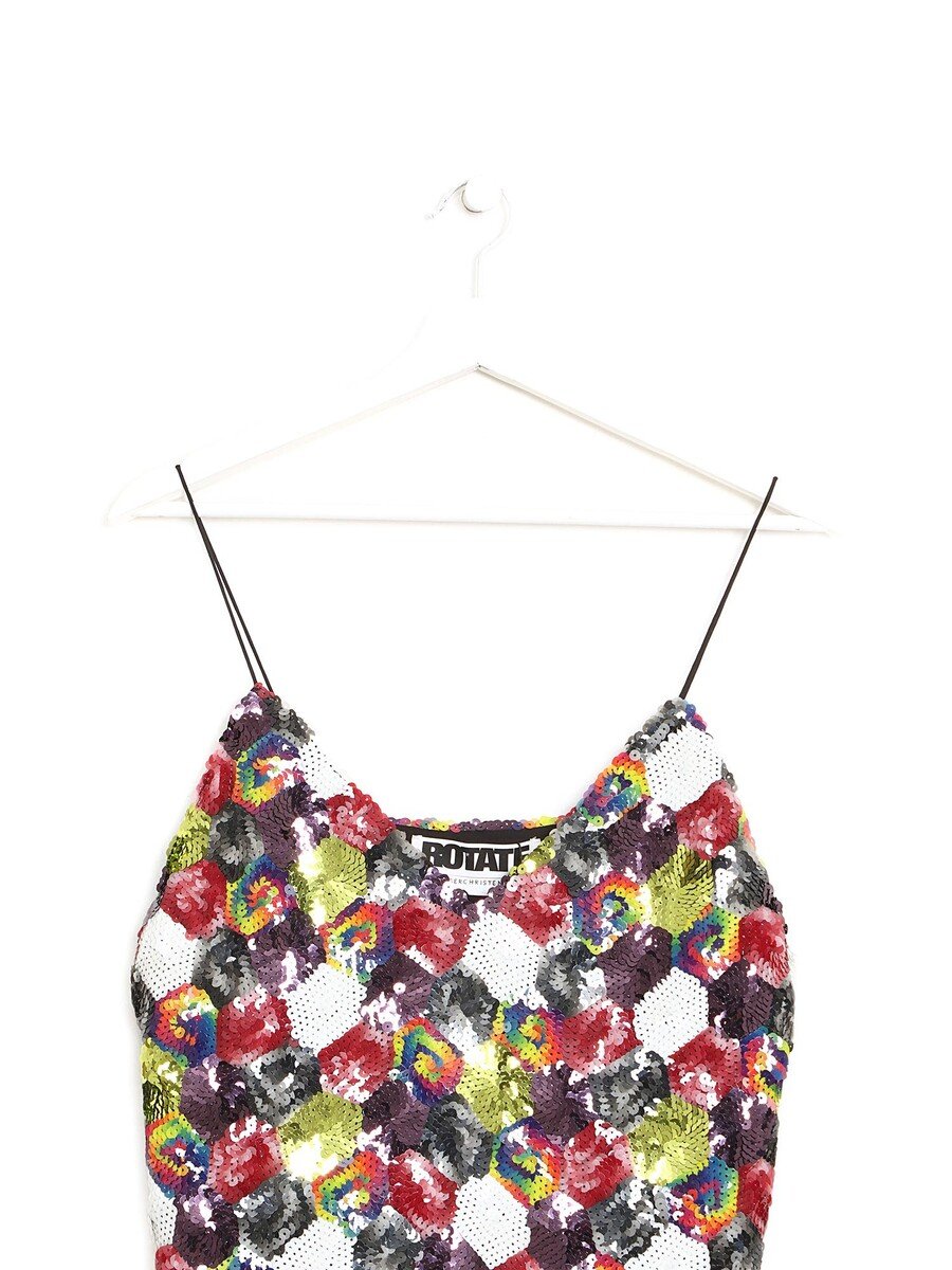 Robe sans manches entièrement ornée de paillettes multicolores. Coupe ajustée. Fermeture zippée à l'arrière. Effet scintillant.