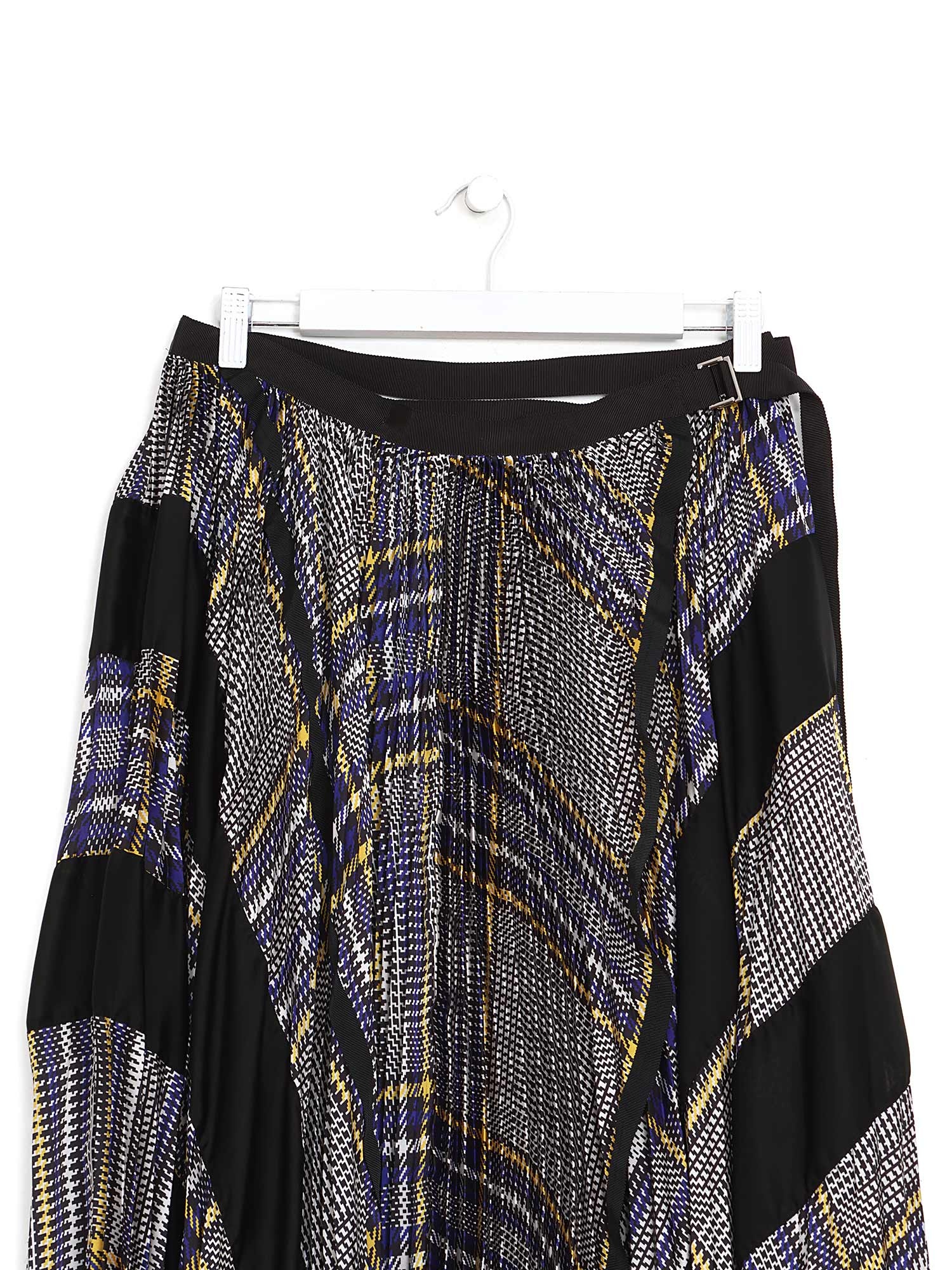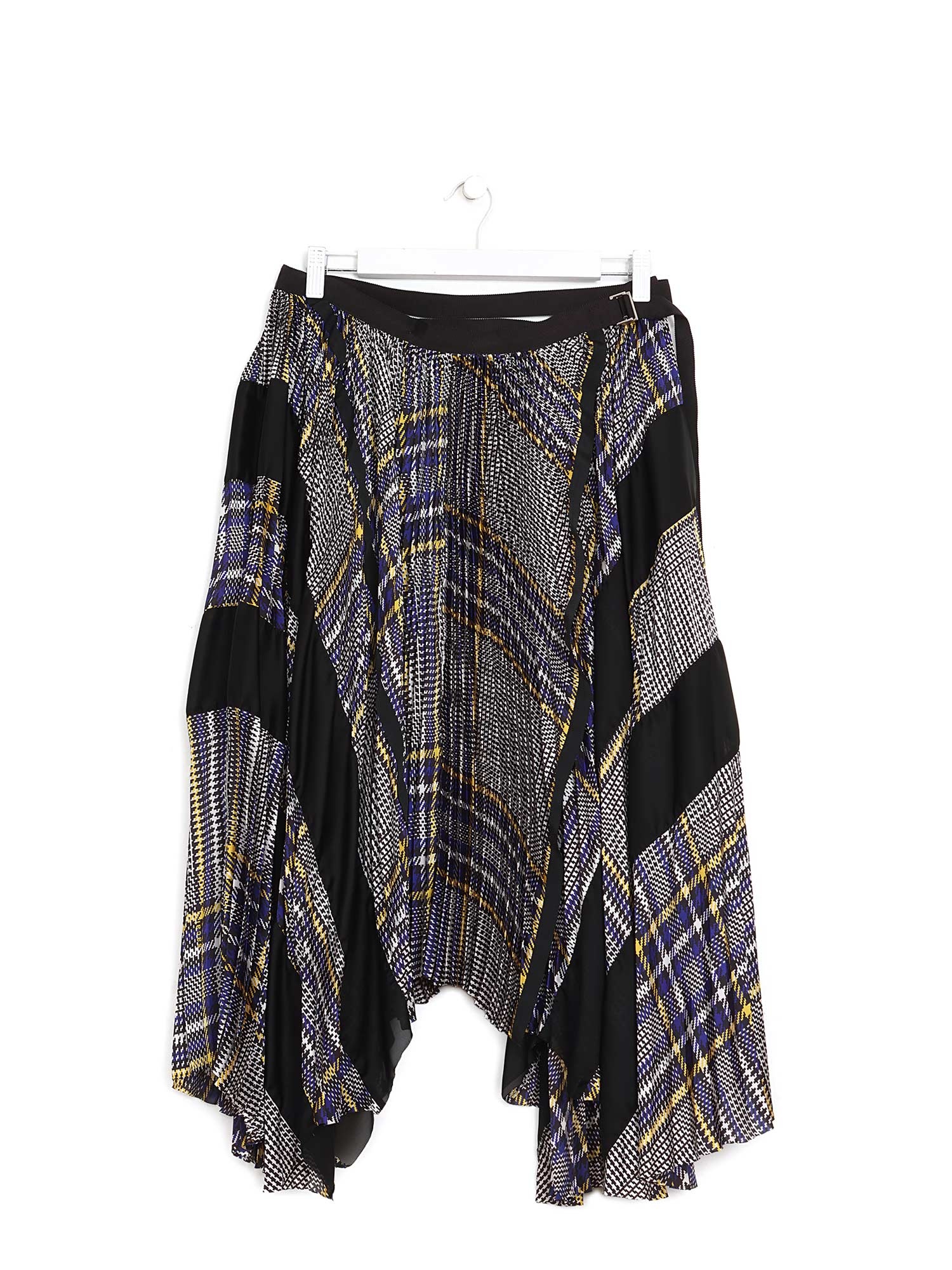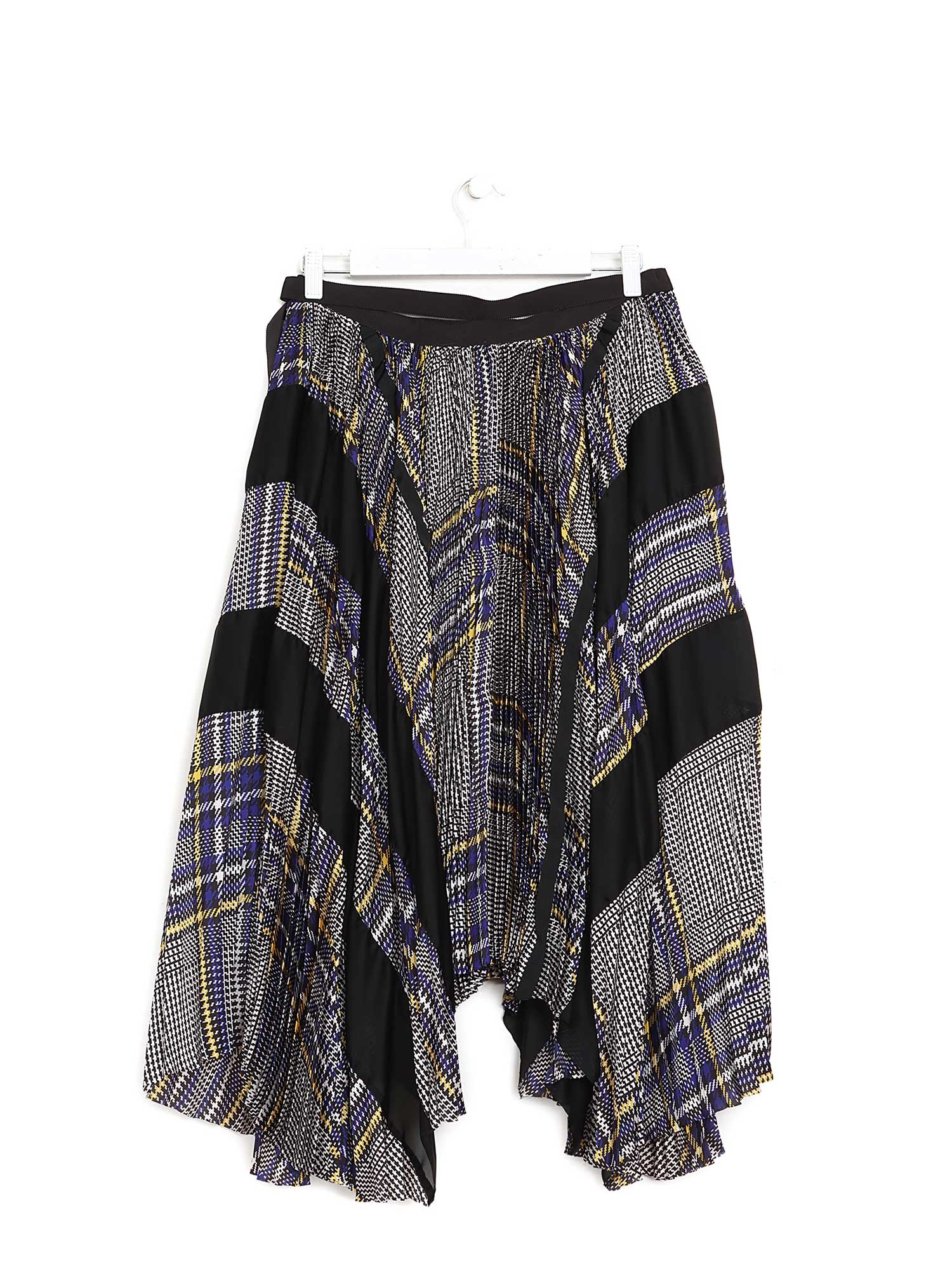 Jupe mi-longue plissée et à étages en noir, jaune, et bleu. Imprimé à carreaux sur l'ensemble. Ourlet asymétrique.
