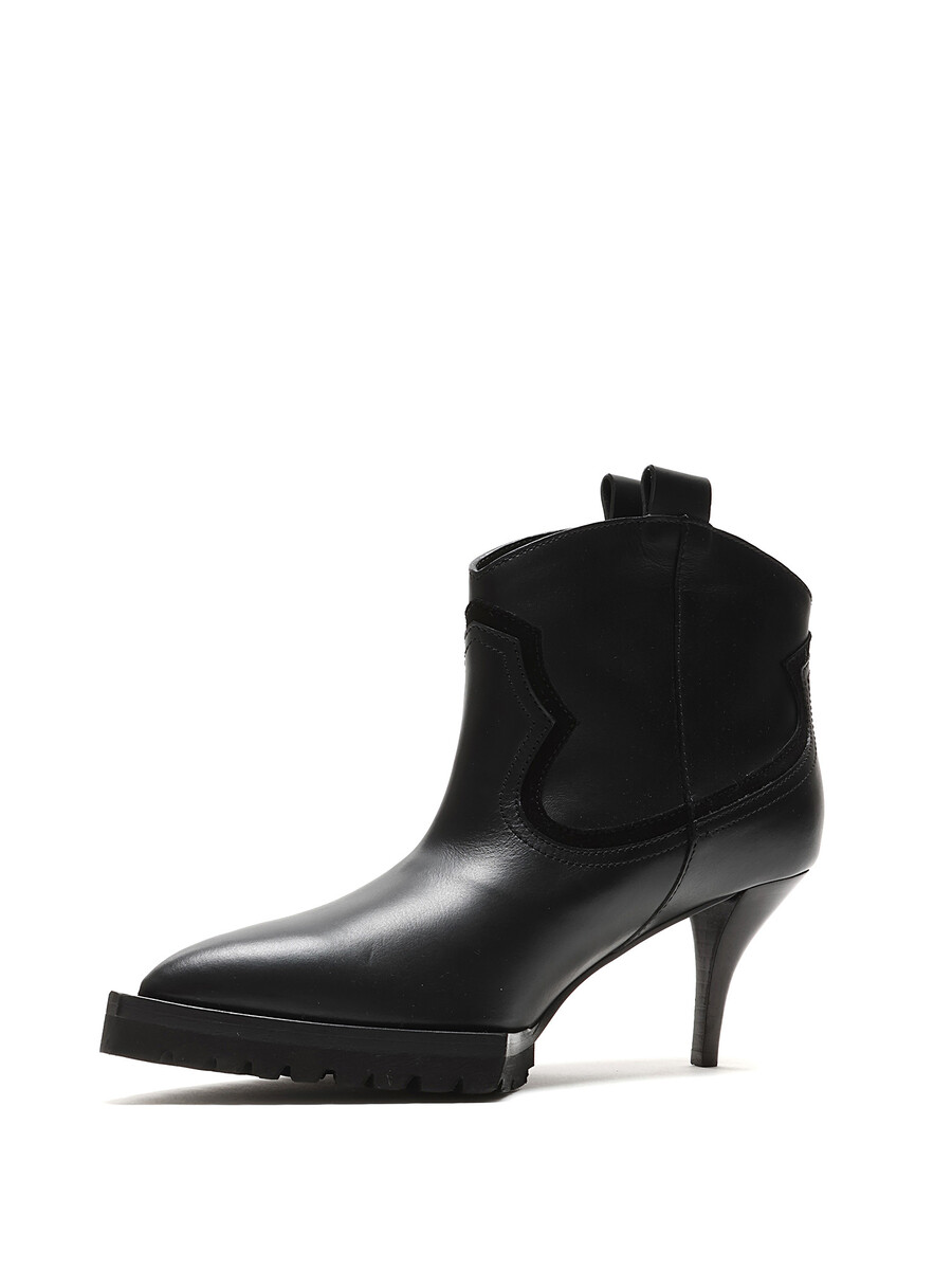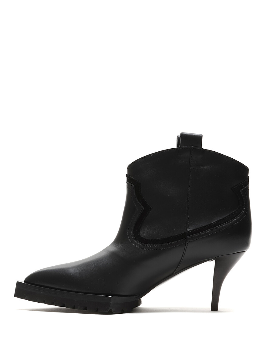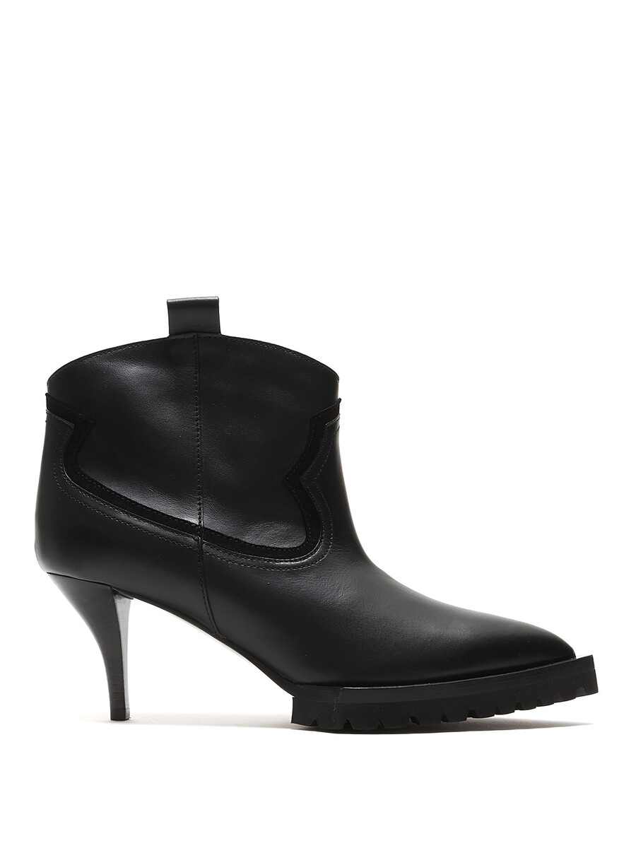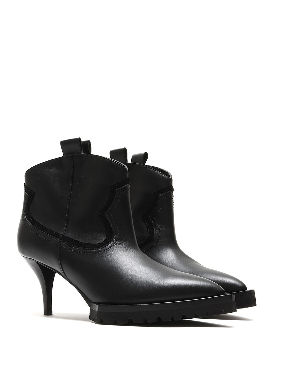 Bottines en cuir lisse noires avec surpiqûres ton sur ton et talon bas. Style à enfiler avec semelle à crampons en caoutchouc. Bout pointu.