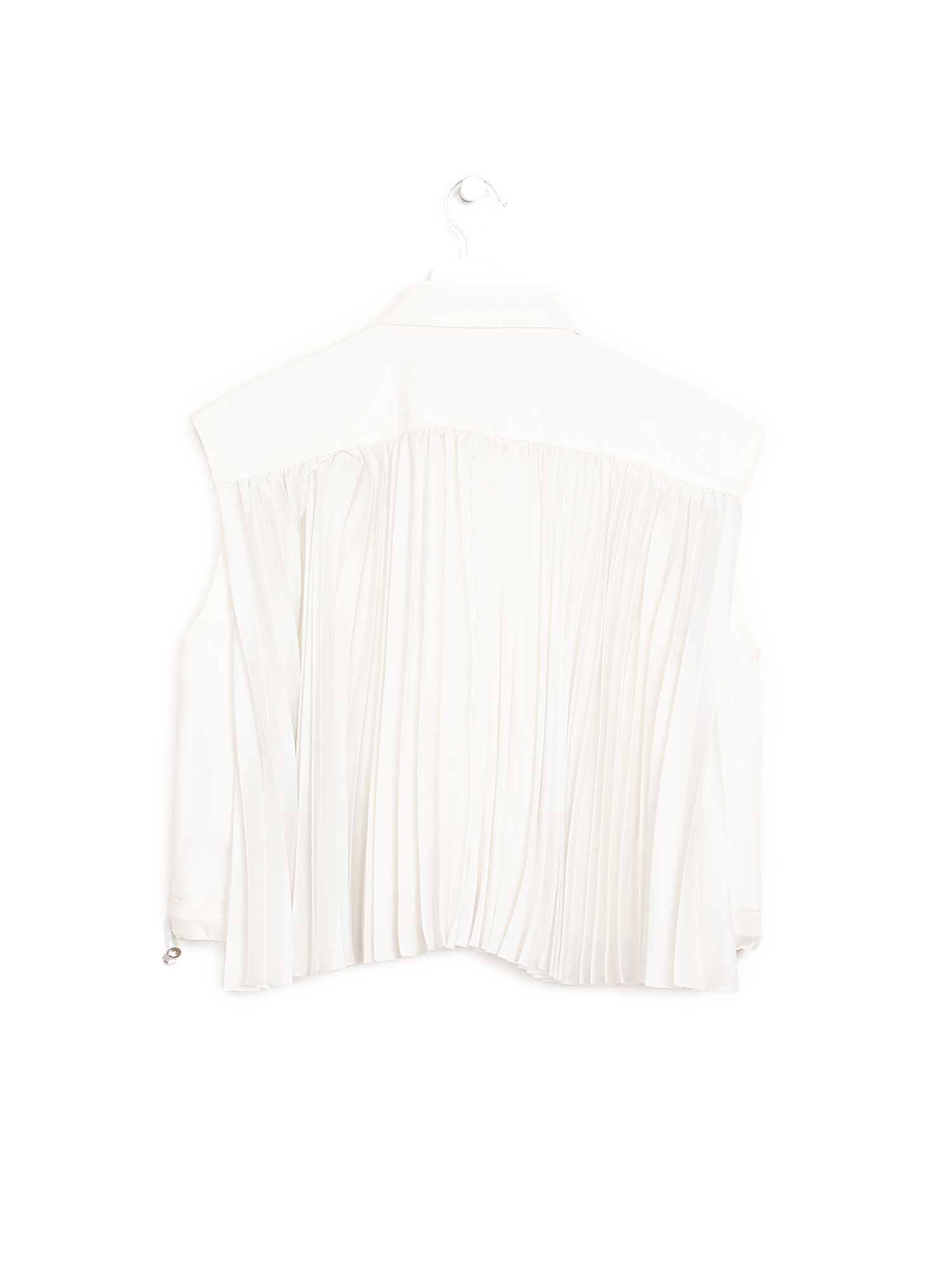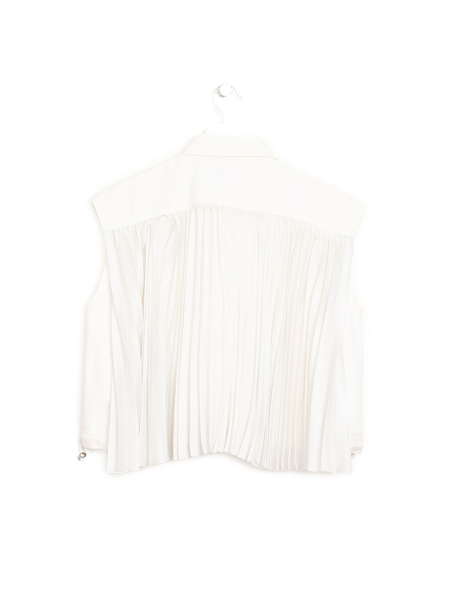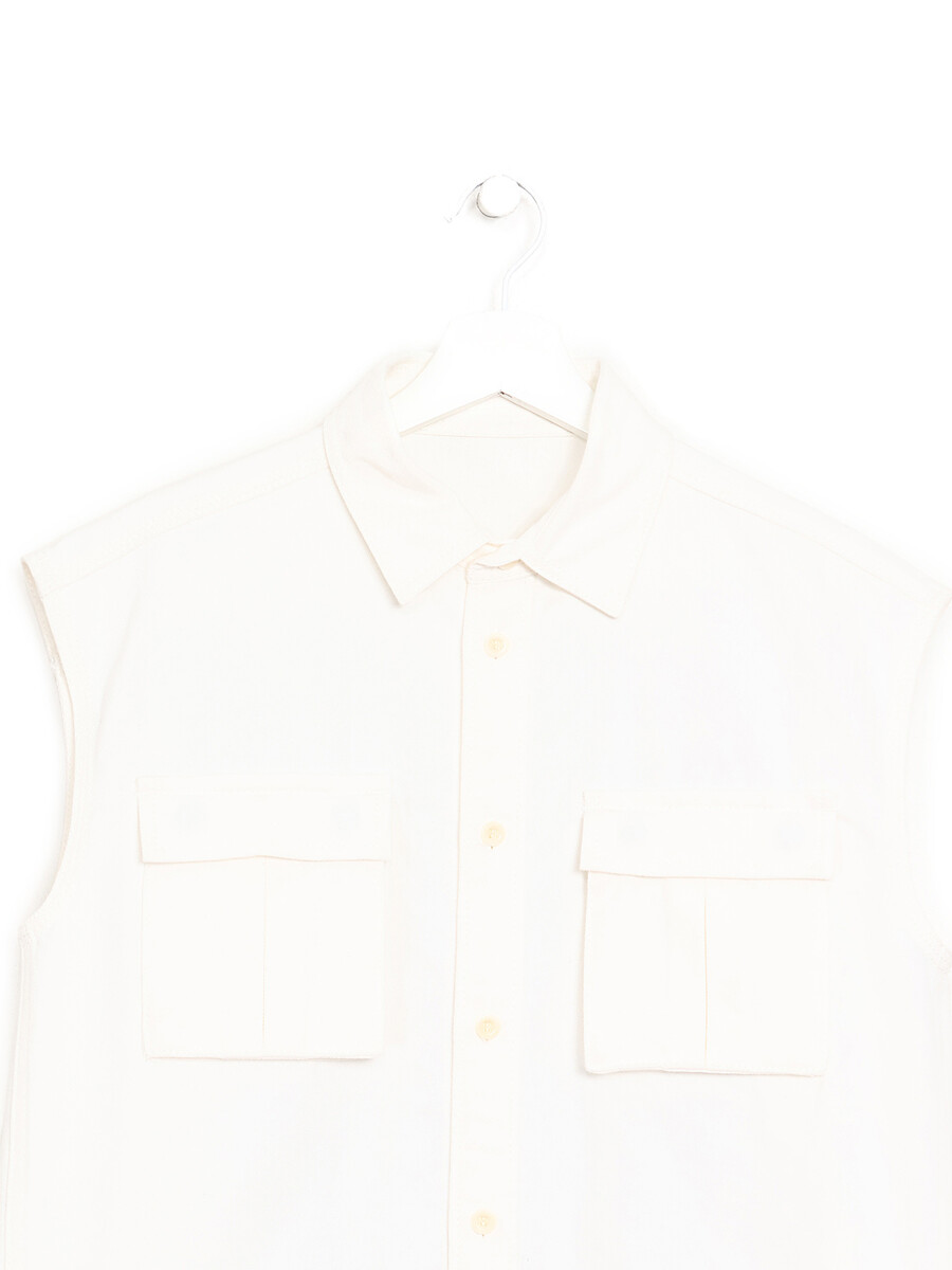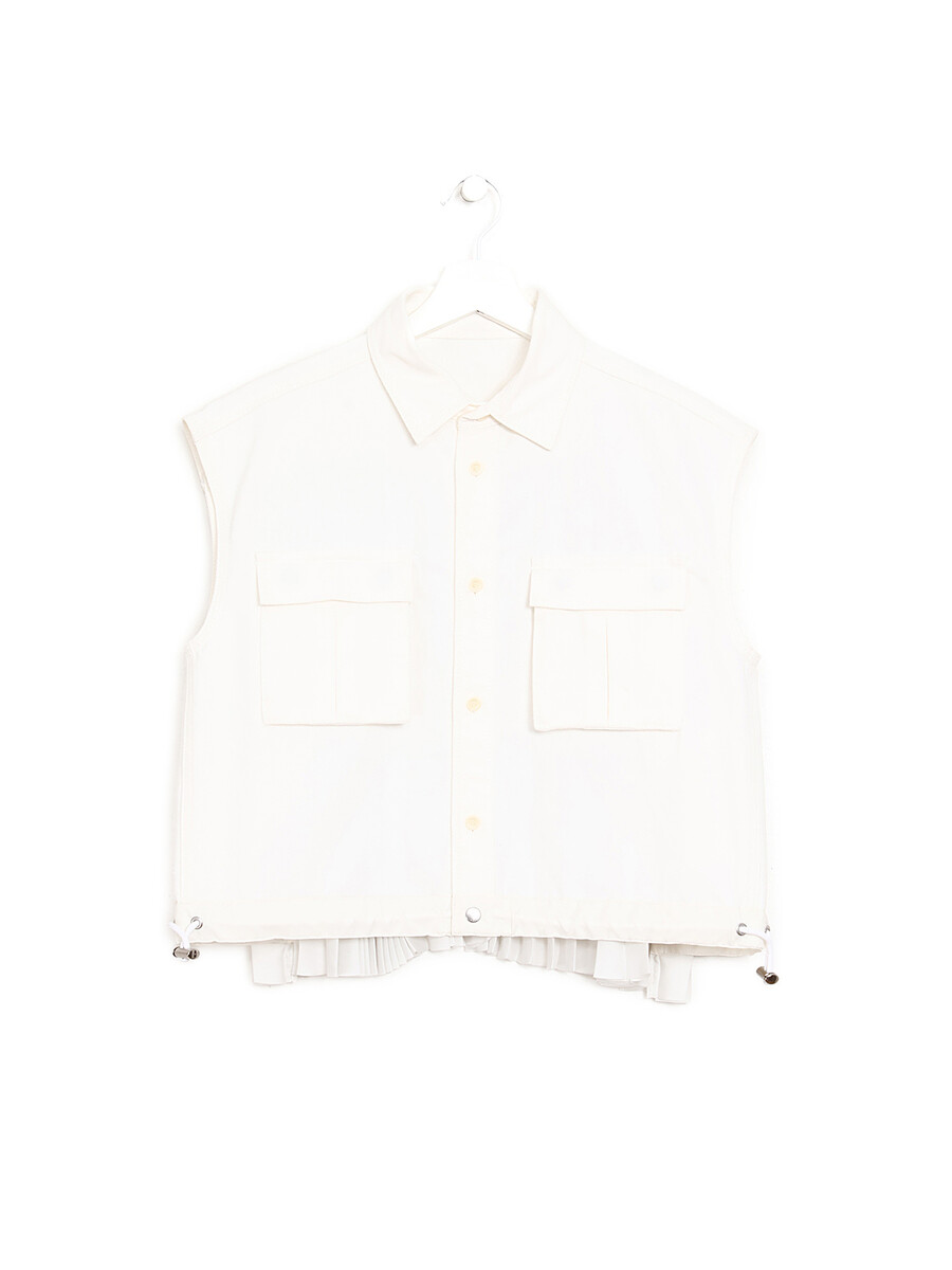 Haut en jean blanc sans manches avec fermeture boutonnée sur le devant. Comprend deux poches à rabat et un dos plissé. Ourlet ajustable.