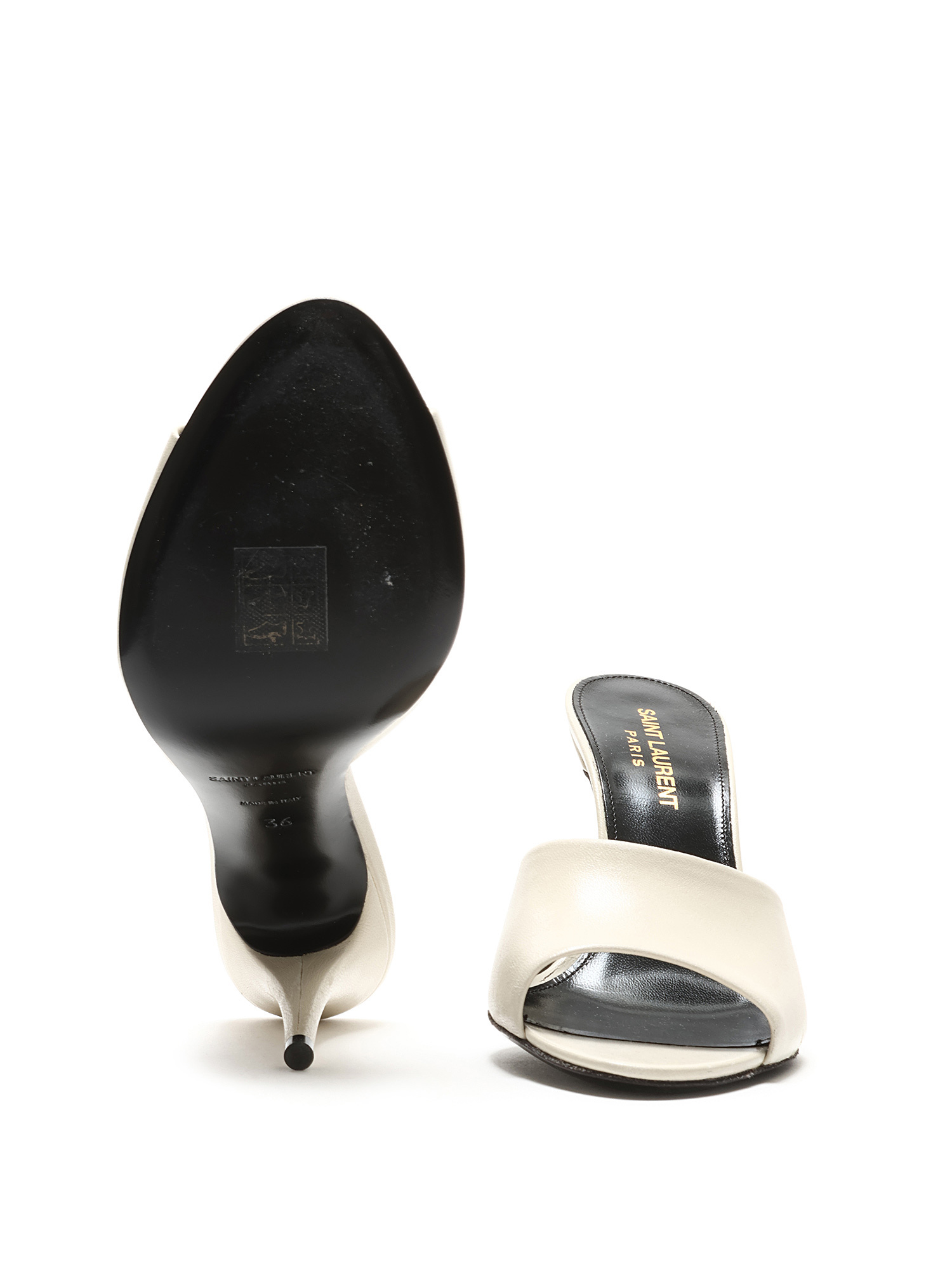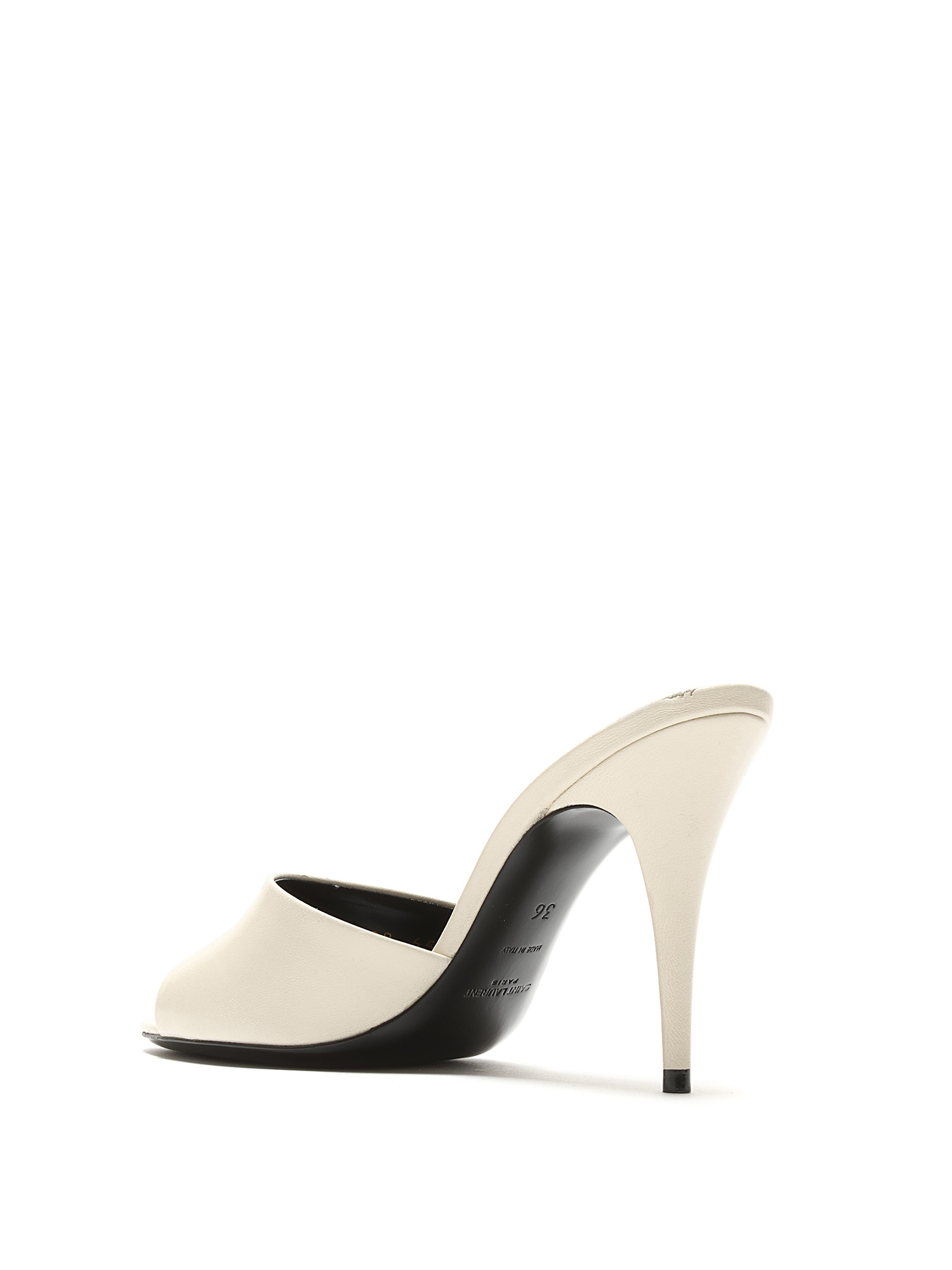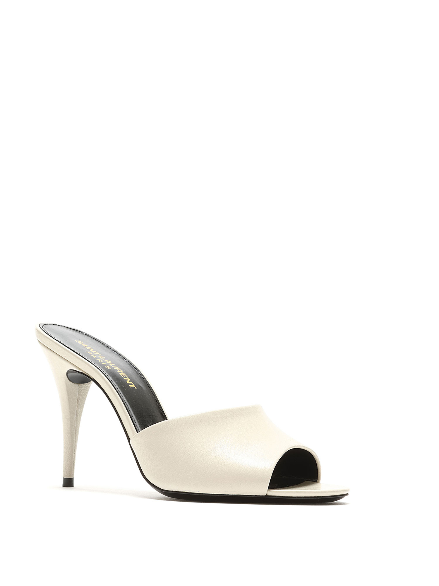 Sandales à talon en cuir blanc crème. Style à enfiler avec talon stiletto. Bout ouvert. Silhouette épurée. Livrées avec dust bag.