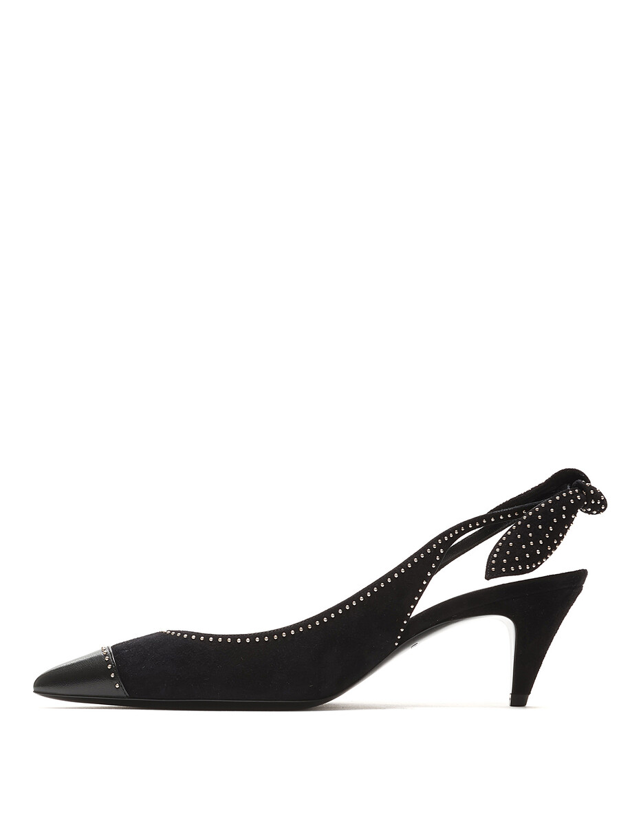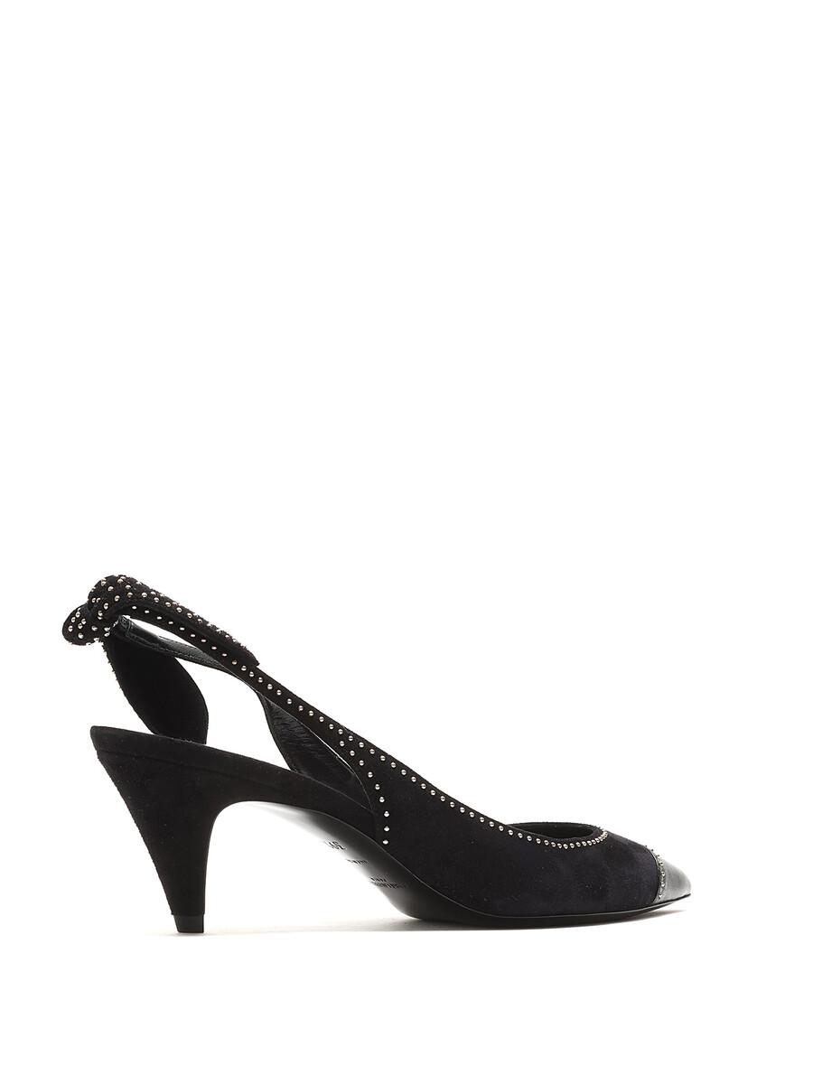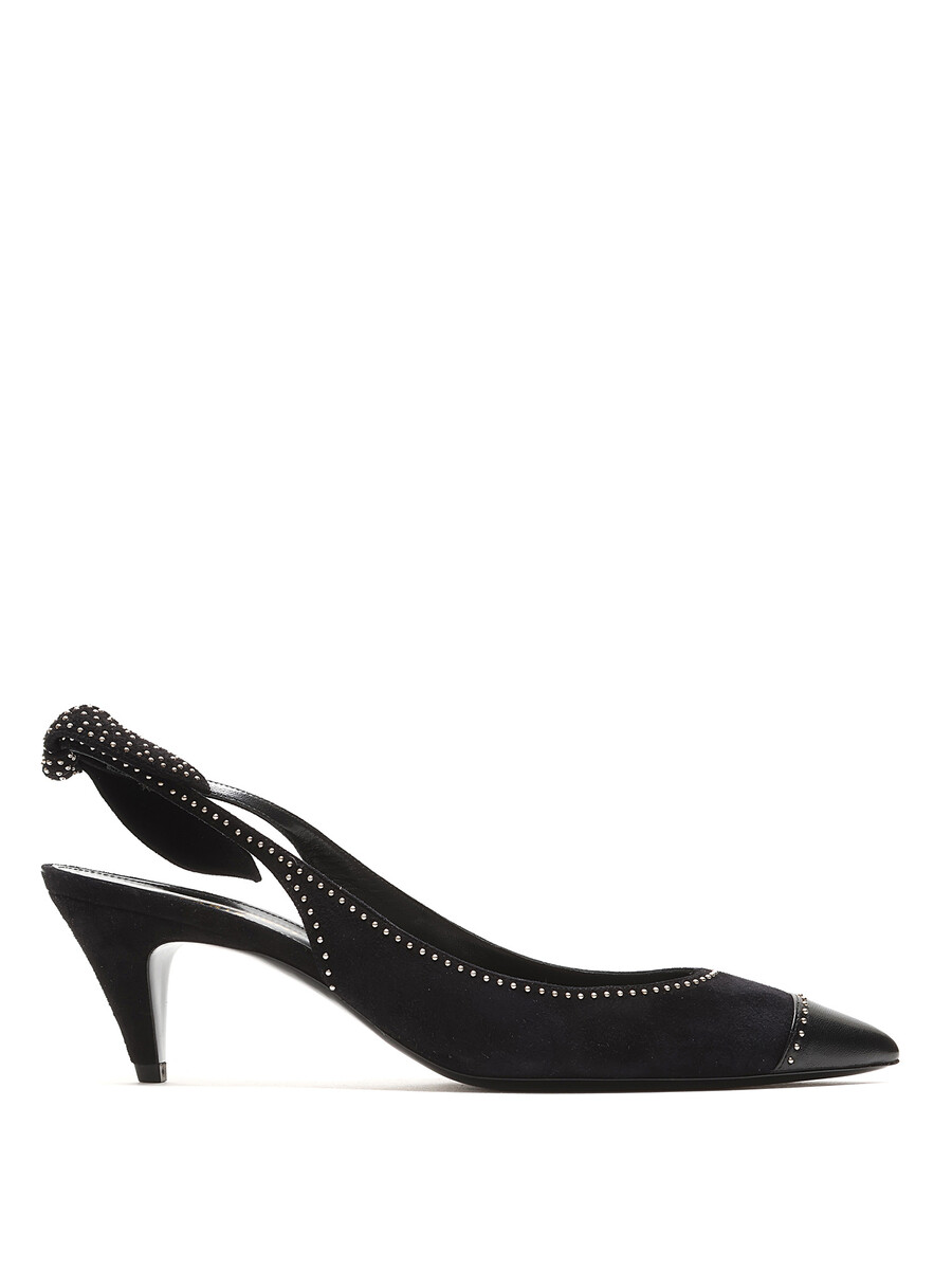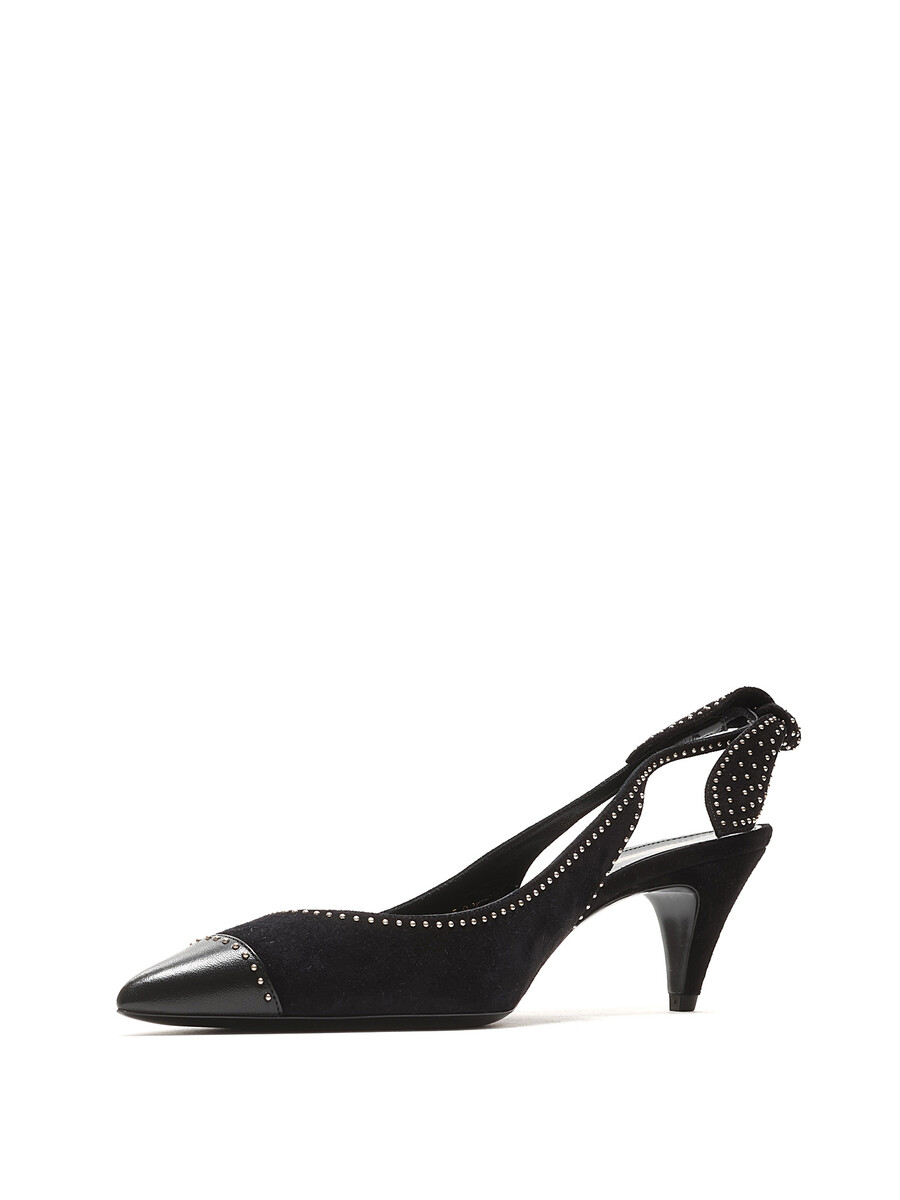 Escarpins en daim noir à bout pointu et bride arrière cloutés. Fermeture à bride élastique. Semelle en cuir. Ferrures en métal argenté. Avec boîte.
