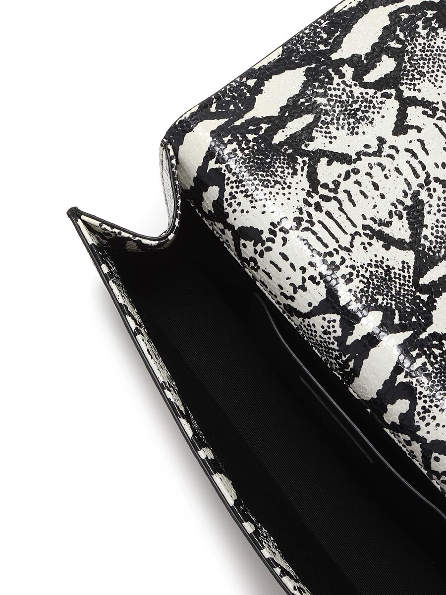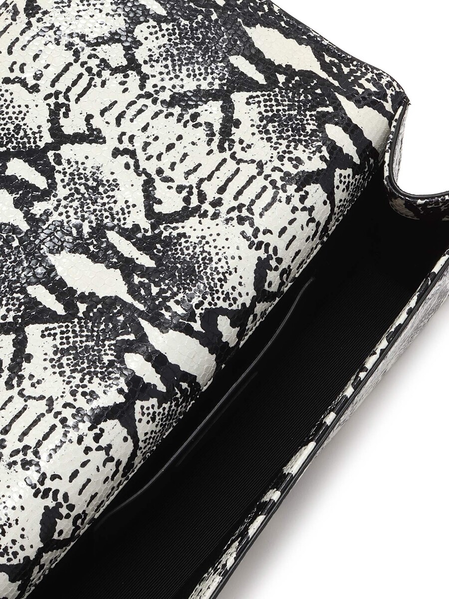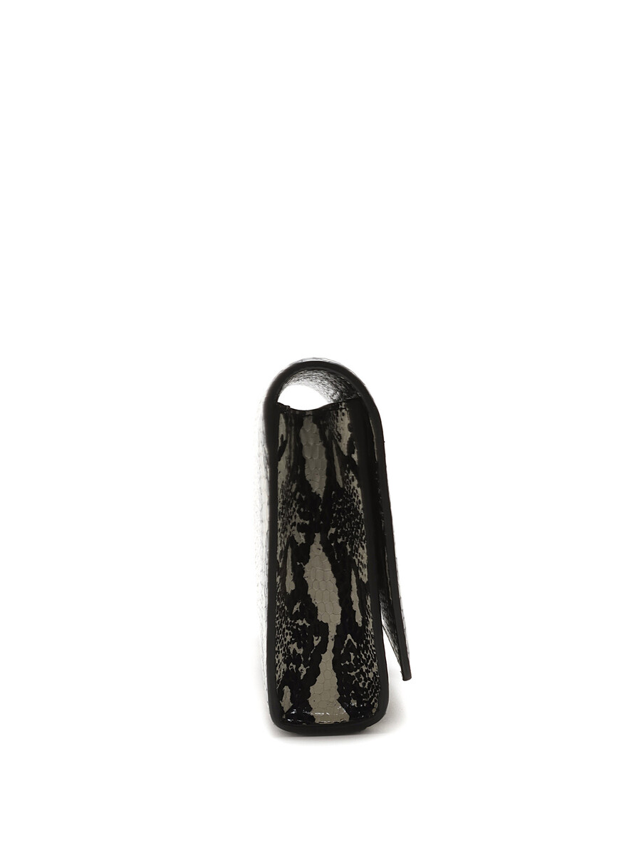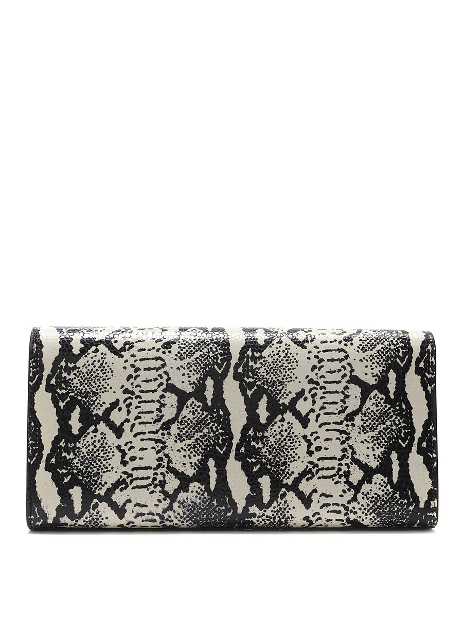 Pochette en cuir embossé à motif python noir et blanc cassé. Fermeture par bouton-pression magnétique. Ferrures argentées. Livrée avec dust bag.