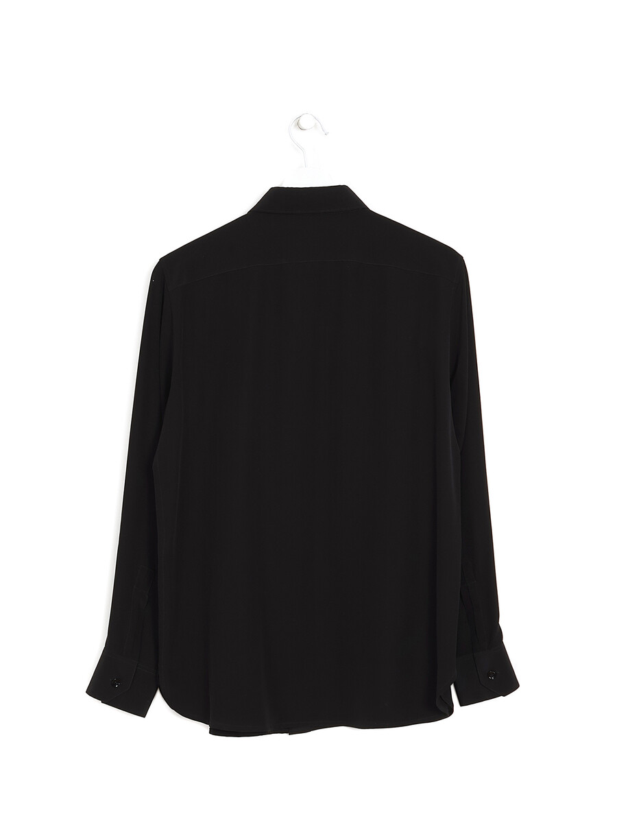 Chemise en soie noire à manches longues. Col chemise classique. Poignets ajustables à boutons.