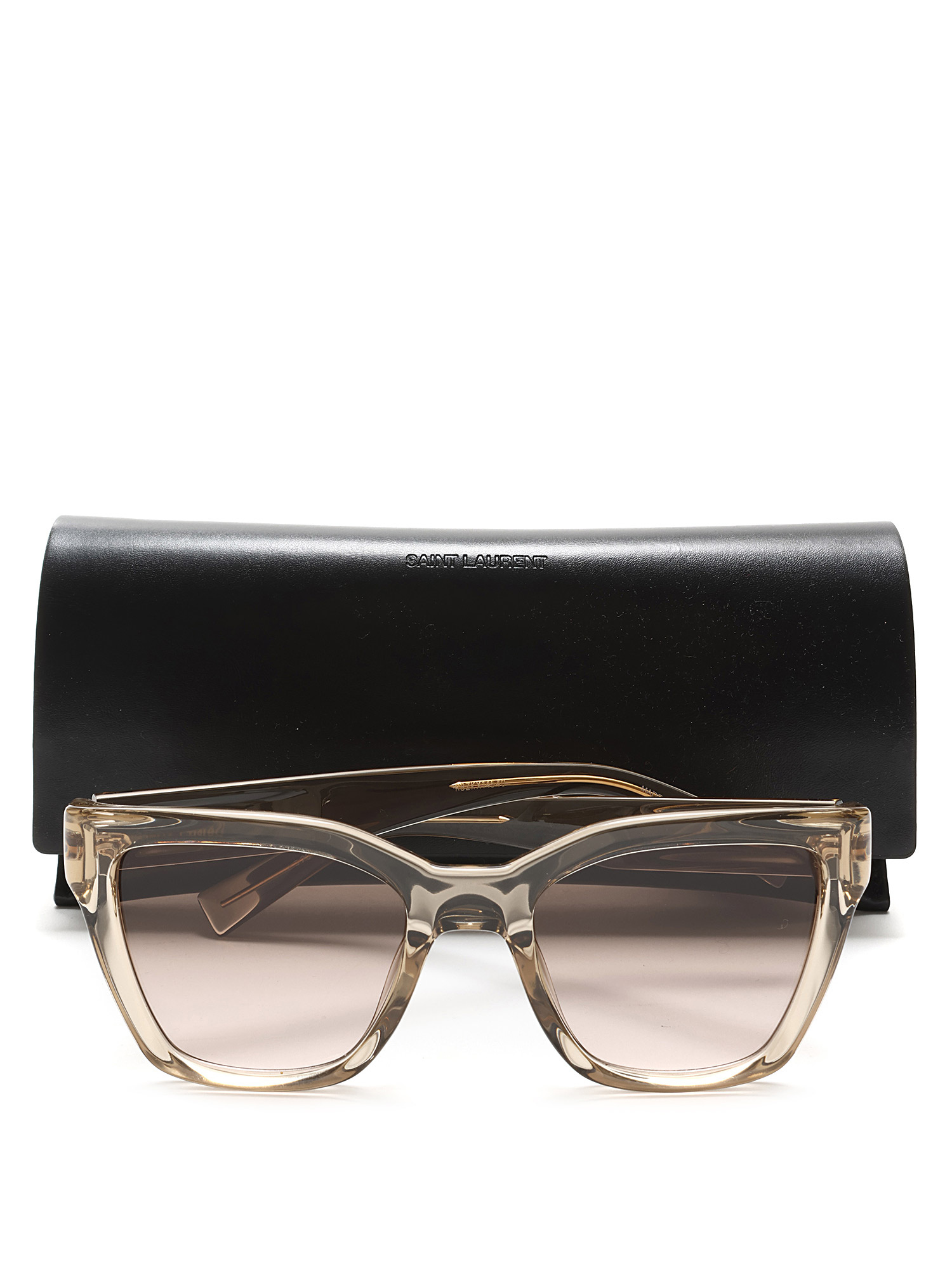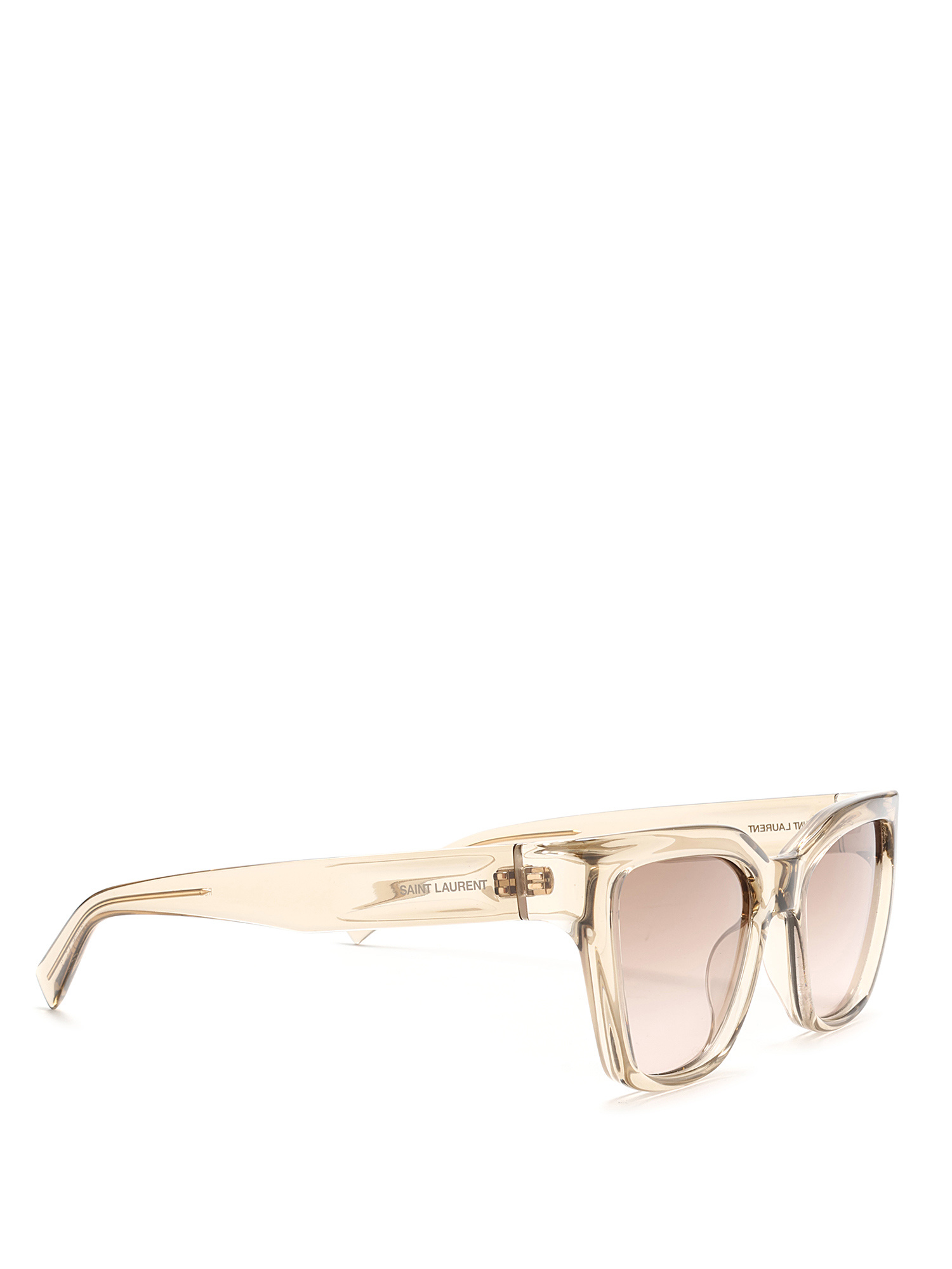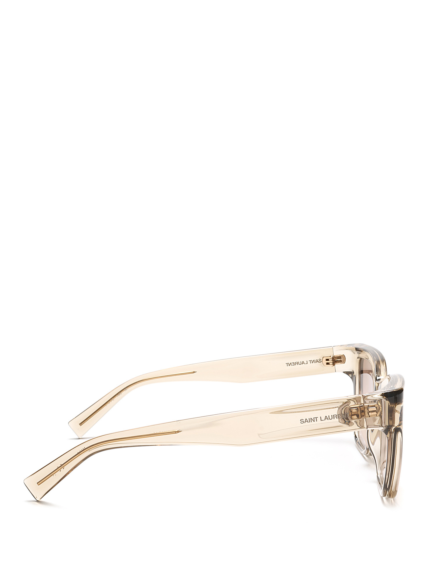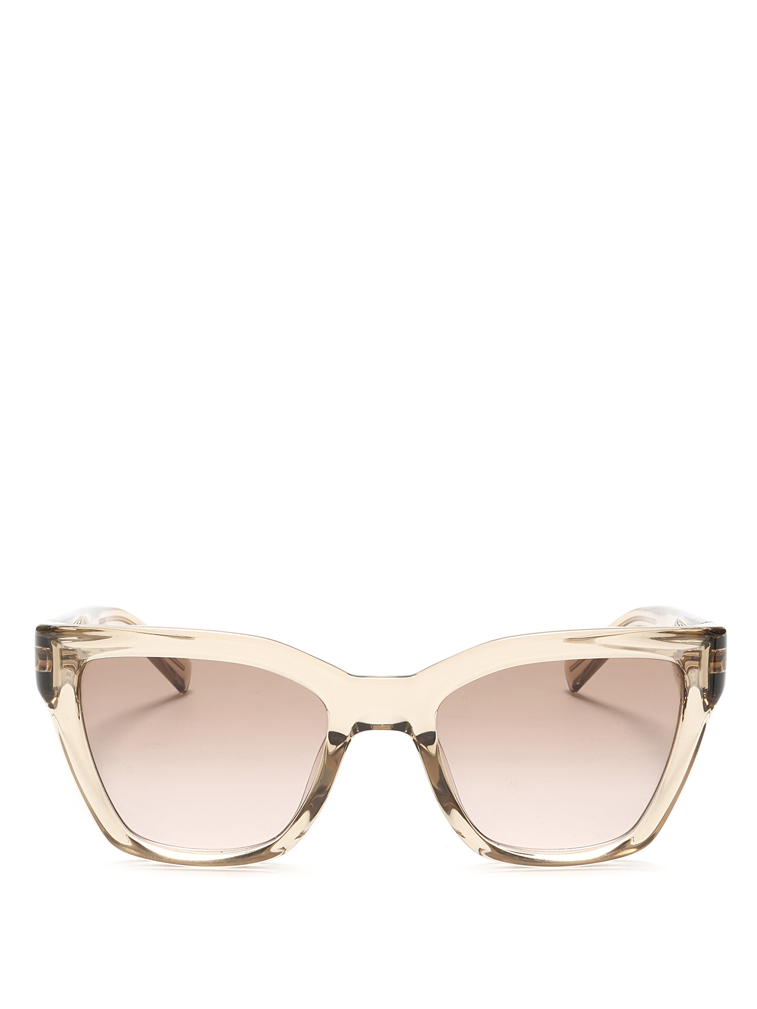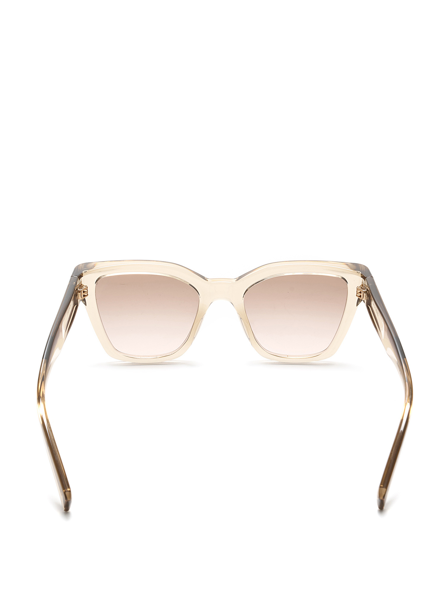 Lunettes de soleil en acétate brun transparent avec logo doré sur la branche.