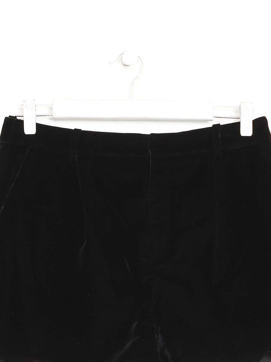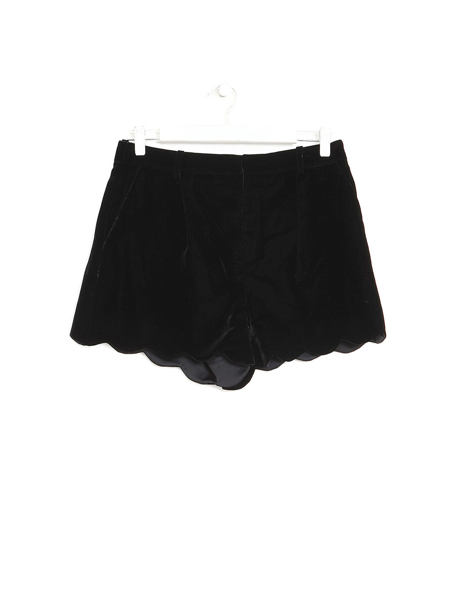 Shorts en velours noir festonné avec fermeture à glissière. Quatre poches.