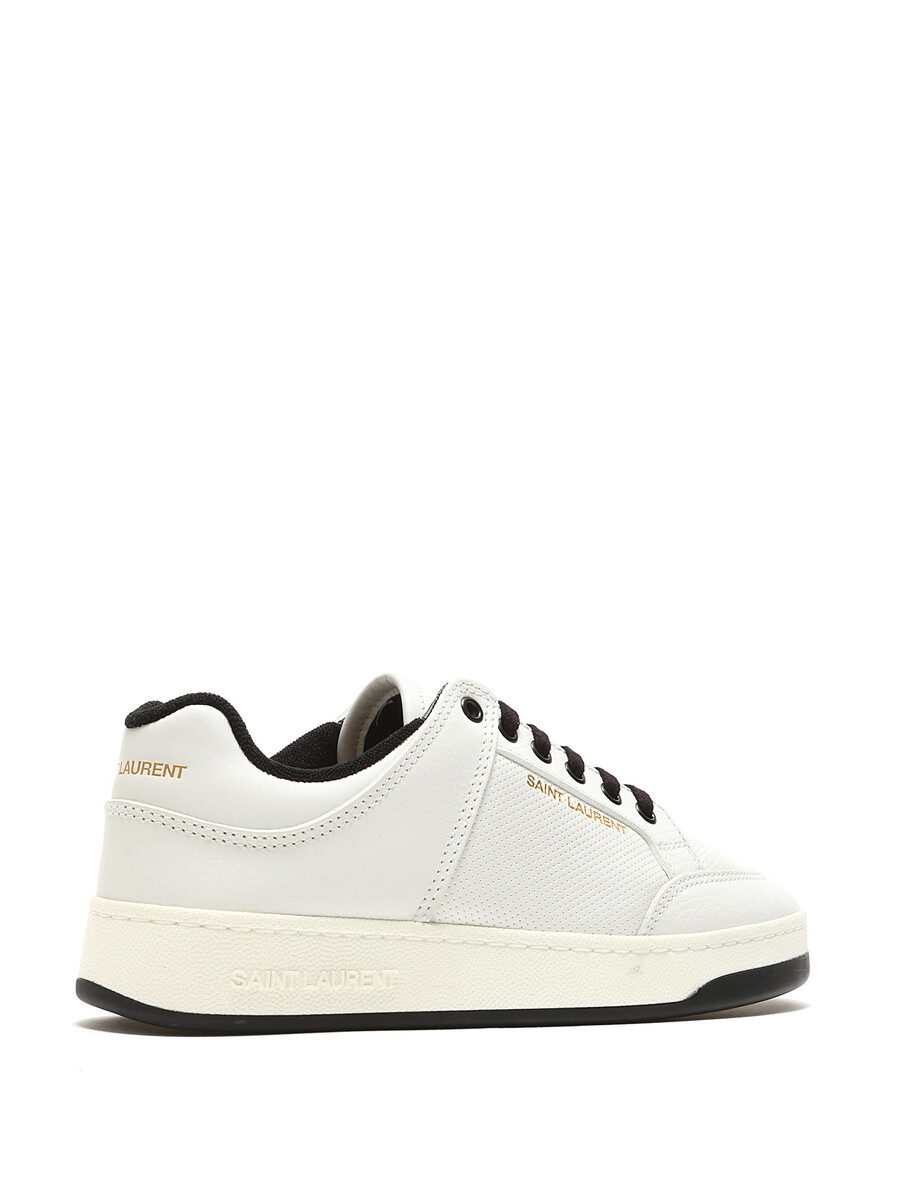 Baskets basses en cuir perforé blanches avec accents noirs. Fermeture à lacets avec oeillets métalliques. Bout rond. Semelle plate en caoutchouc.