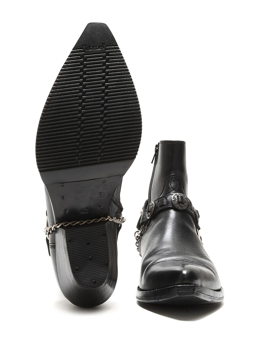 Bottes en cuir grainé noir à talons avec harnais amovible. Bout pointu. Fermeture à glissière latérale. Semelle en caoutchouc.