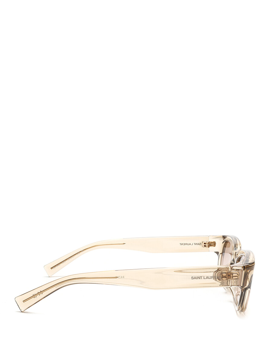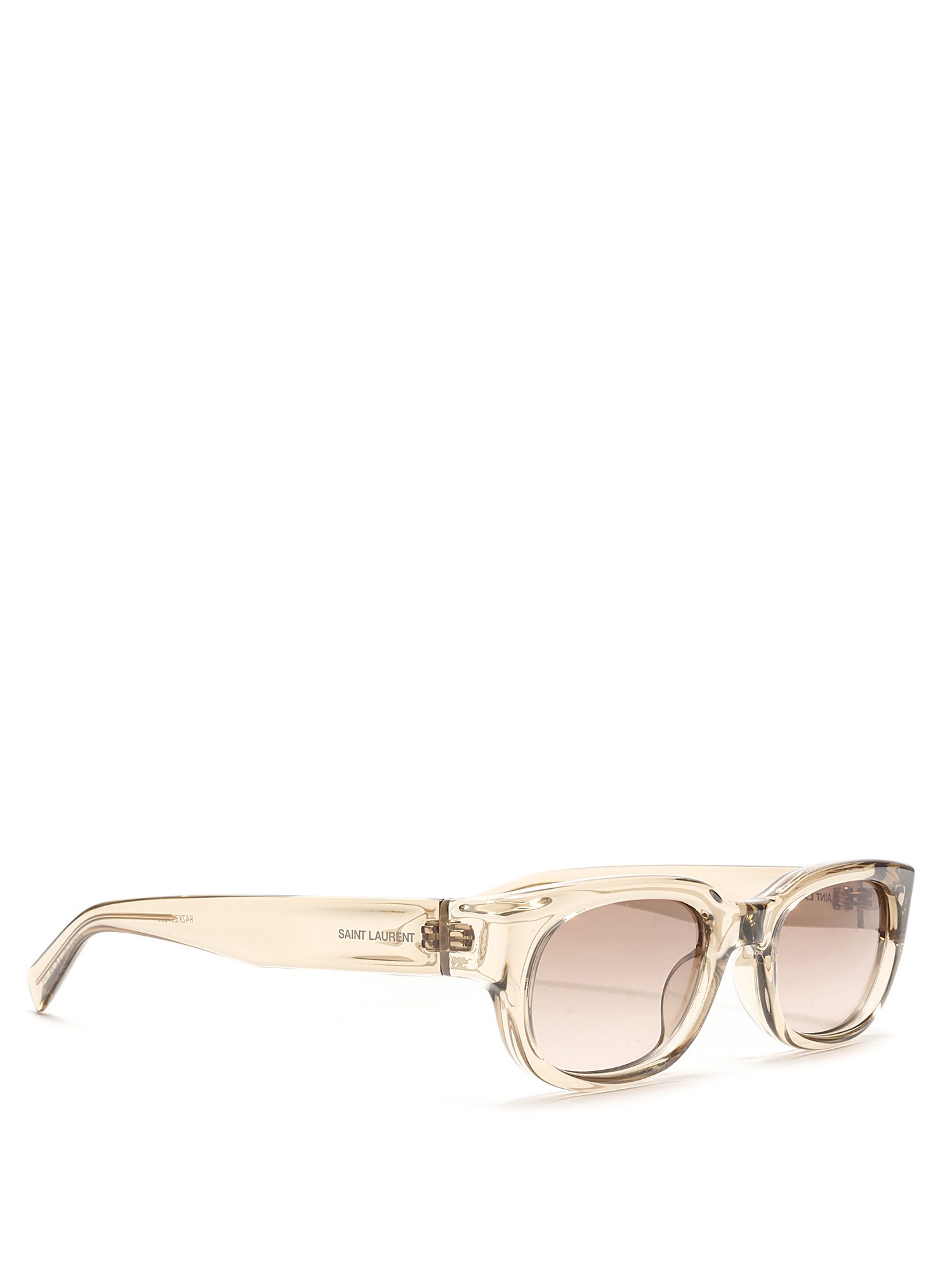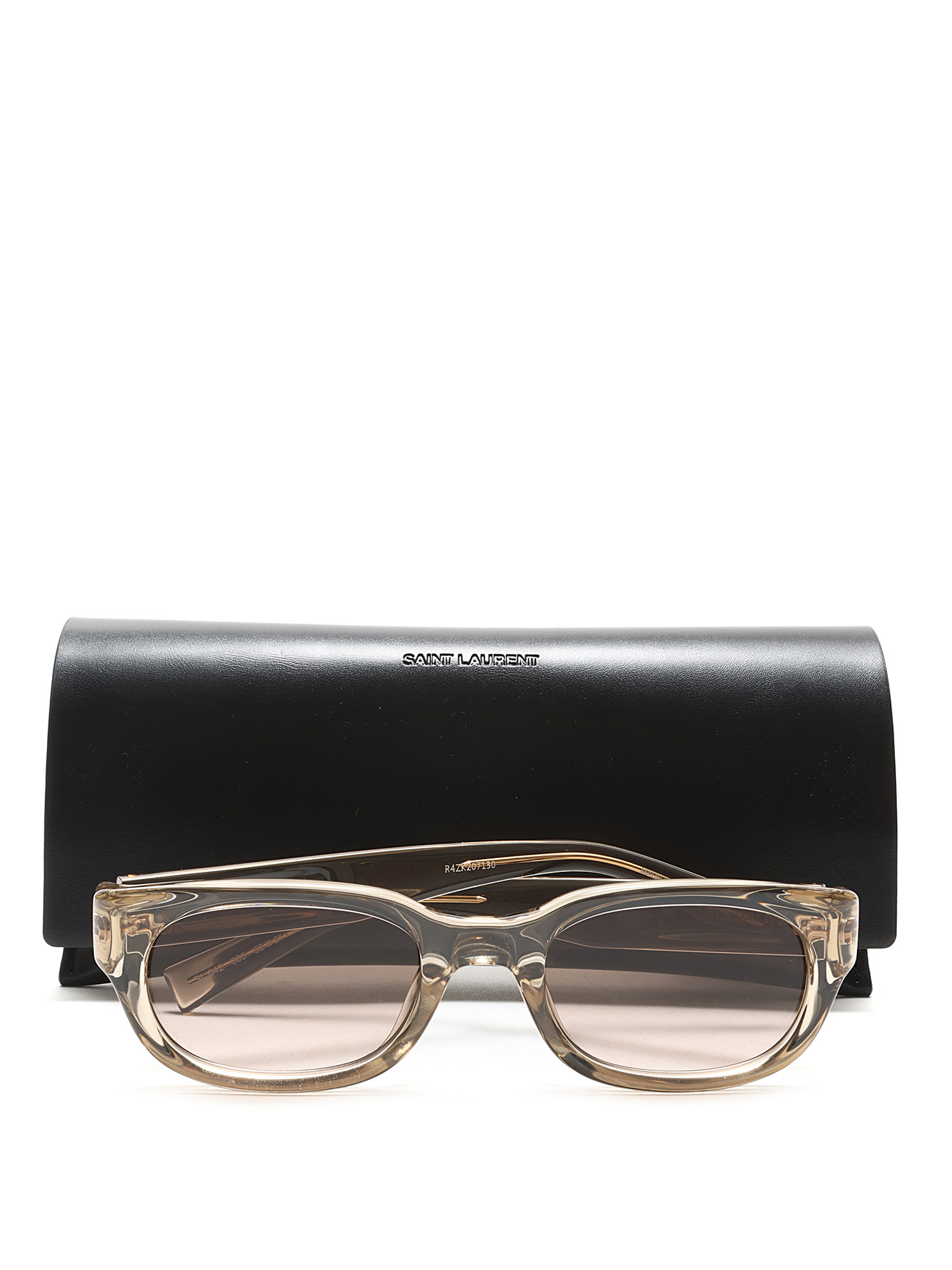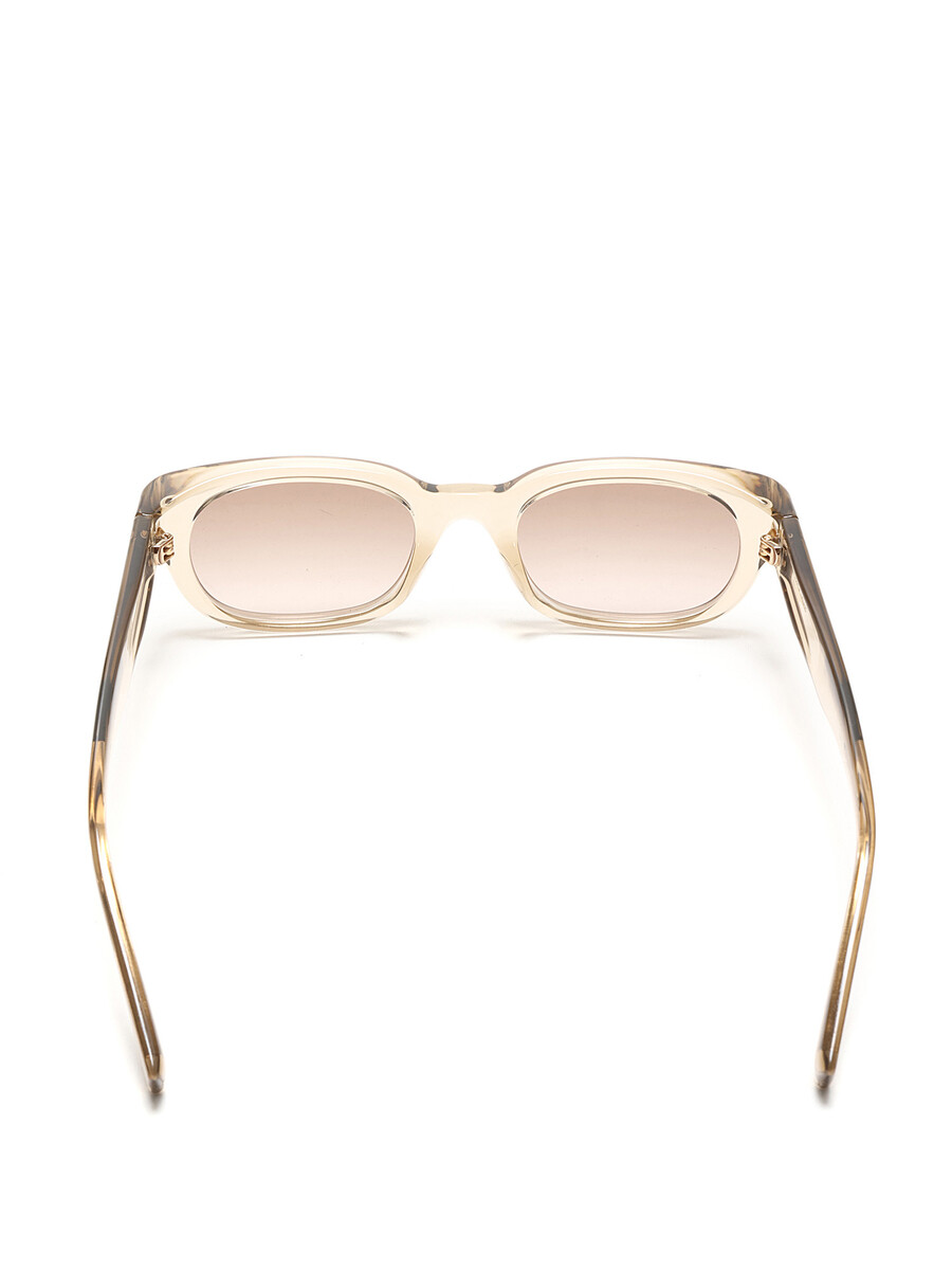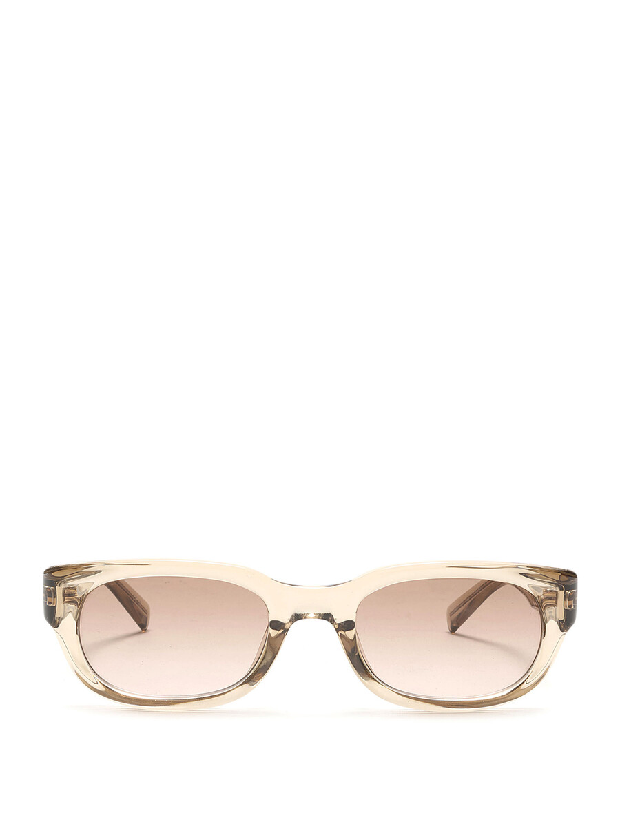 Lunettes de soleil rectangulaires en acétate avec monture transparente et verres teintés bruns. Ferrures argentées. Livrées avec un étui rigide noir.