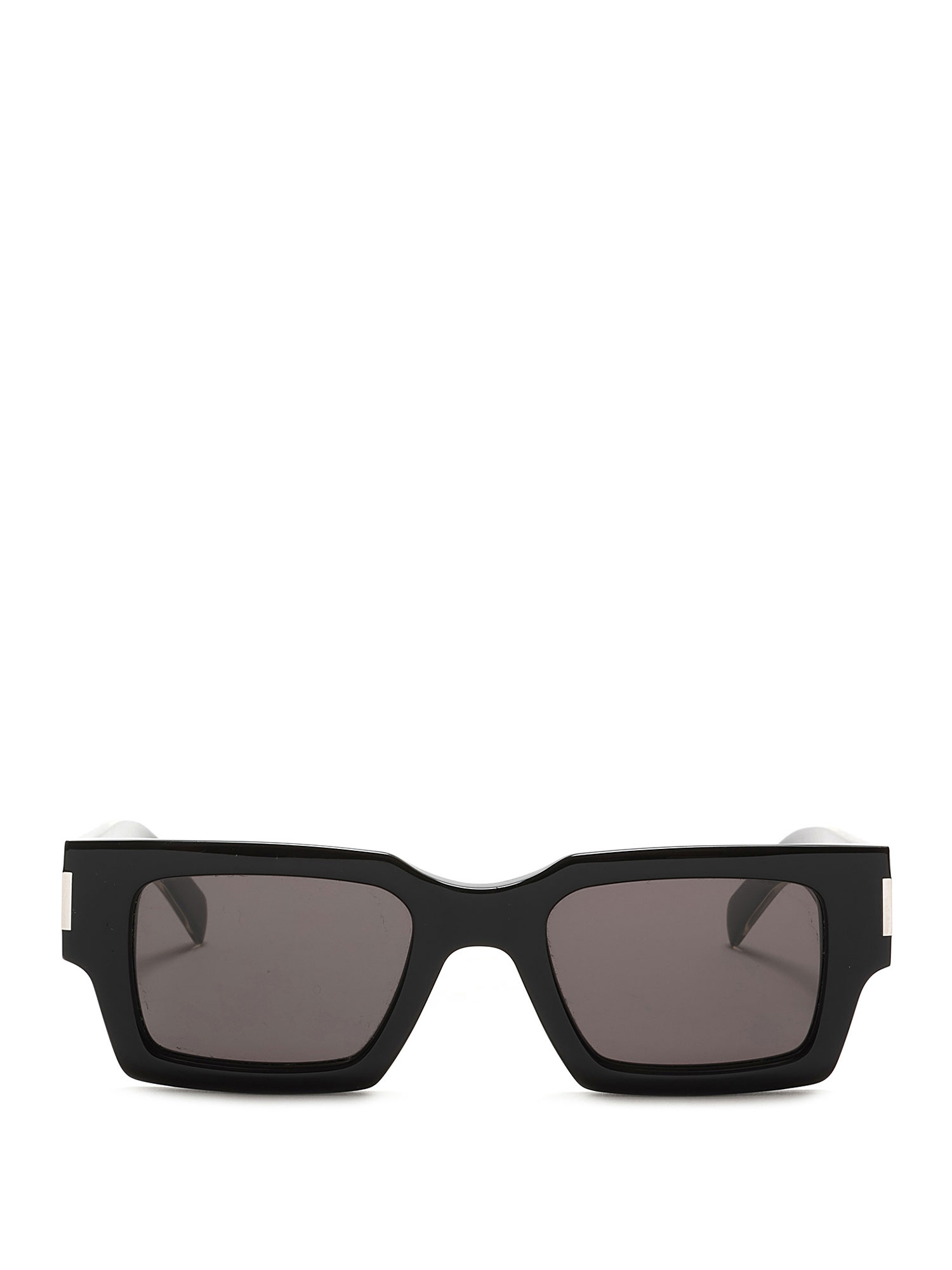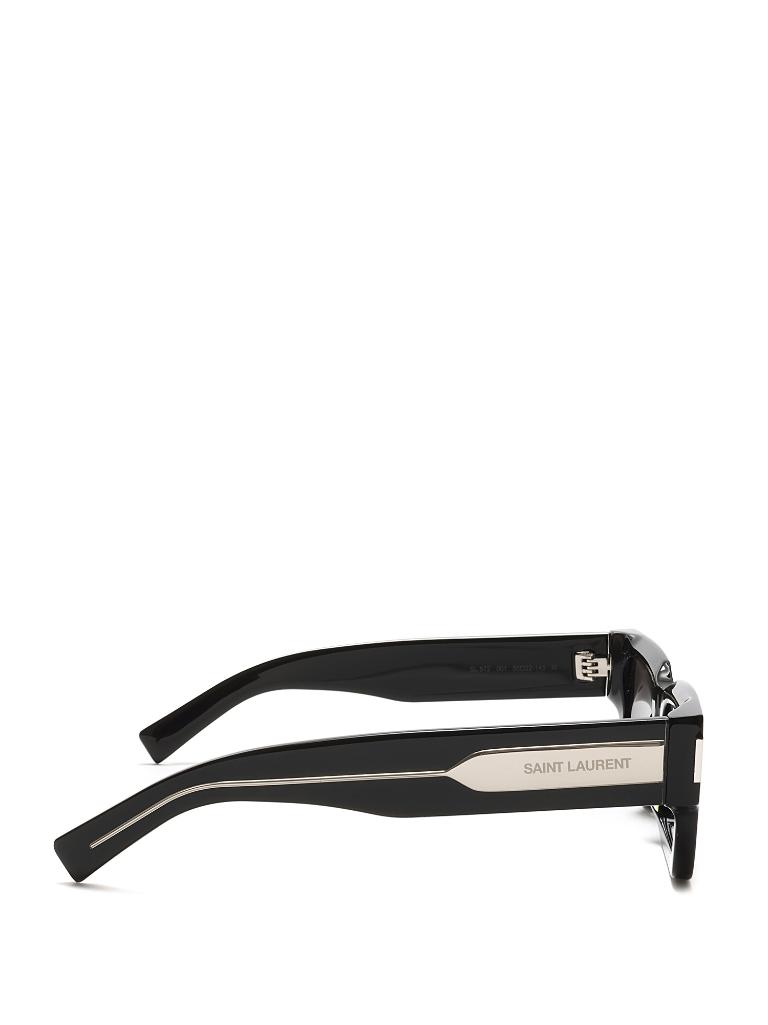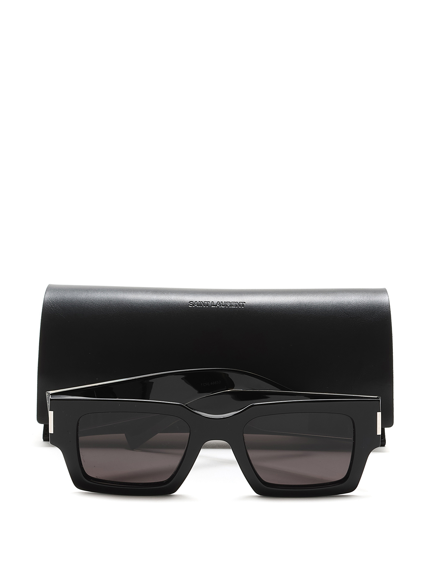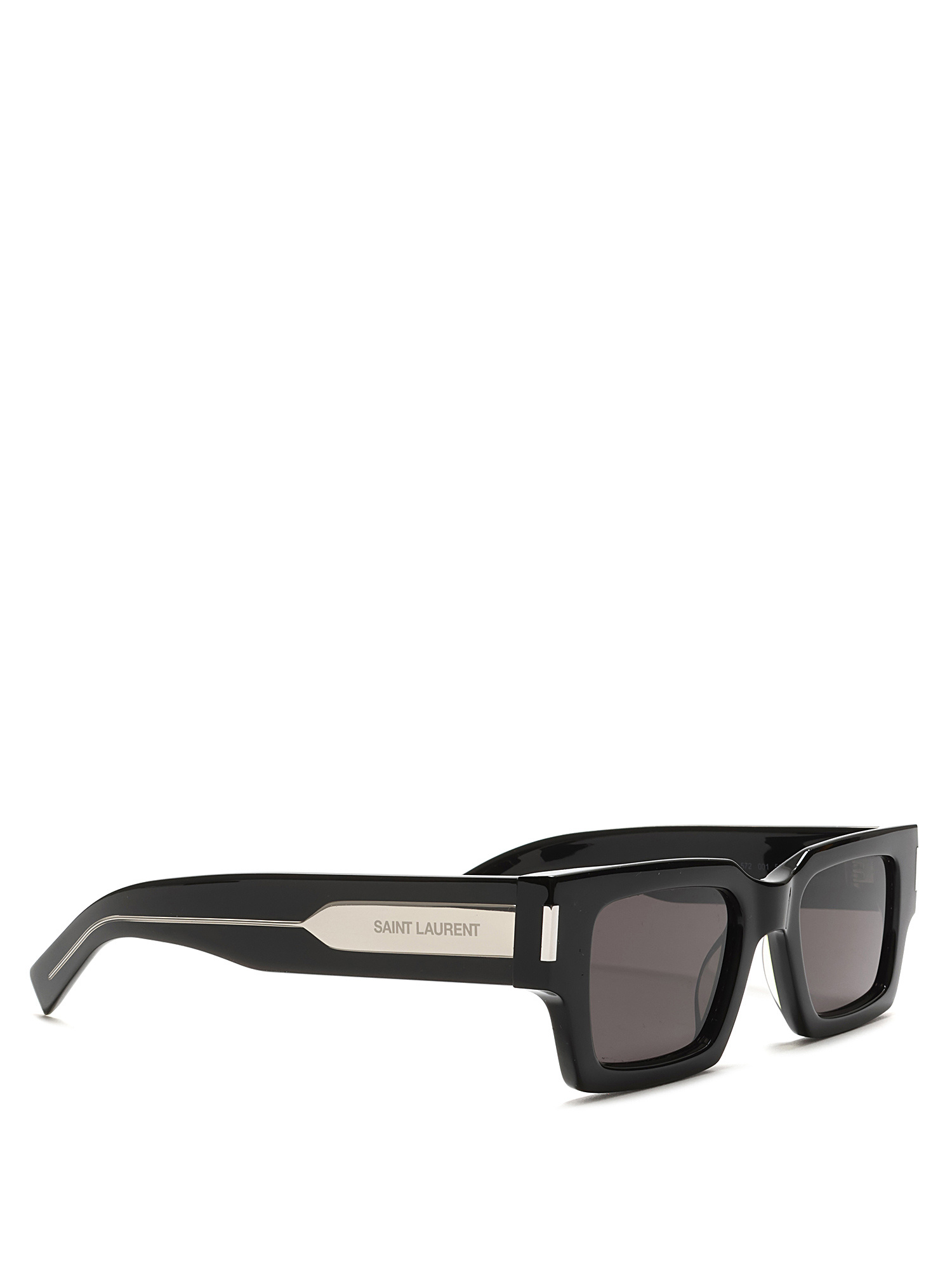 Lunettes de soleil rectangulaires en acétate noir avec logo Saint Laurent en métal argenté sur les branches. Livrées avec un étui.